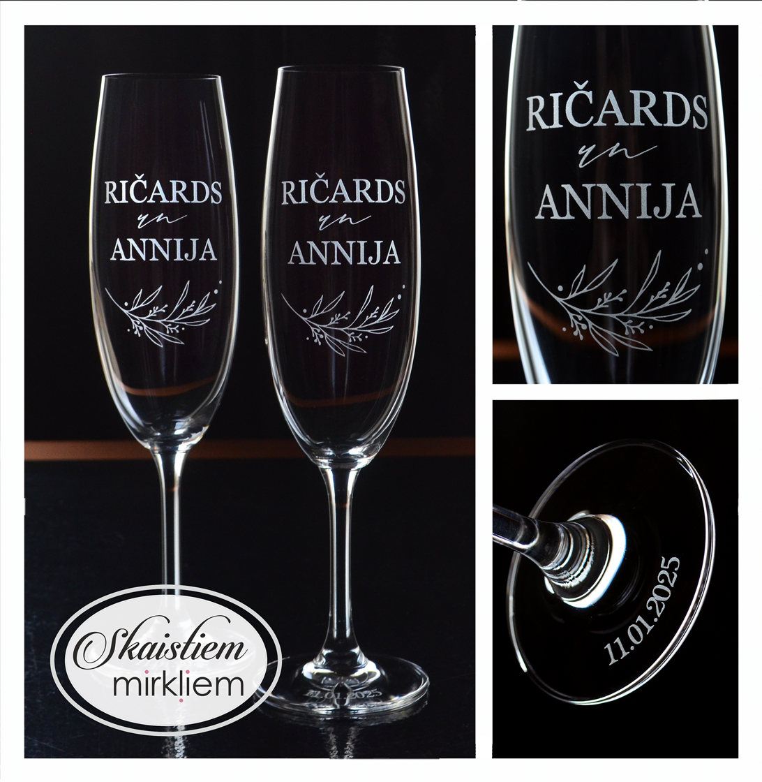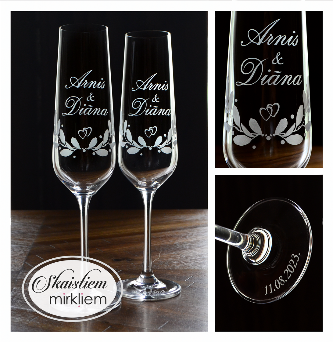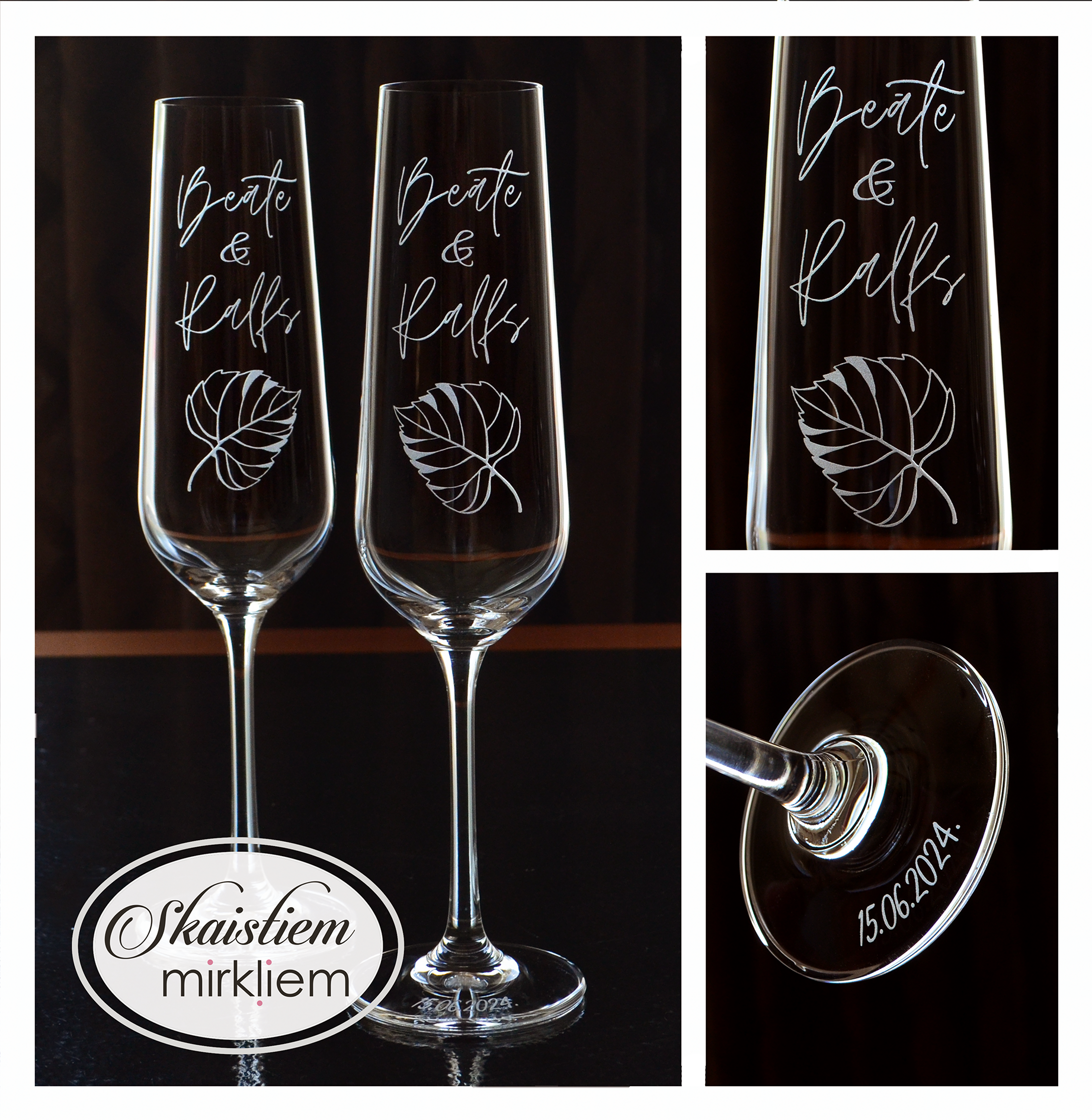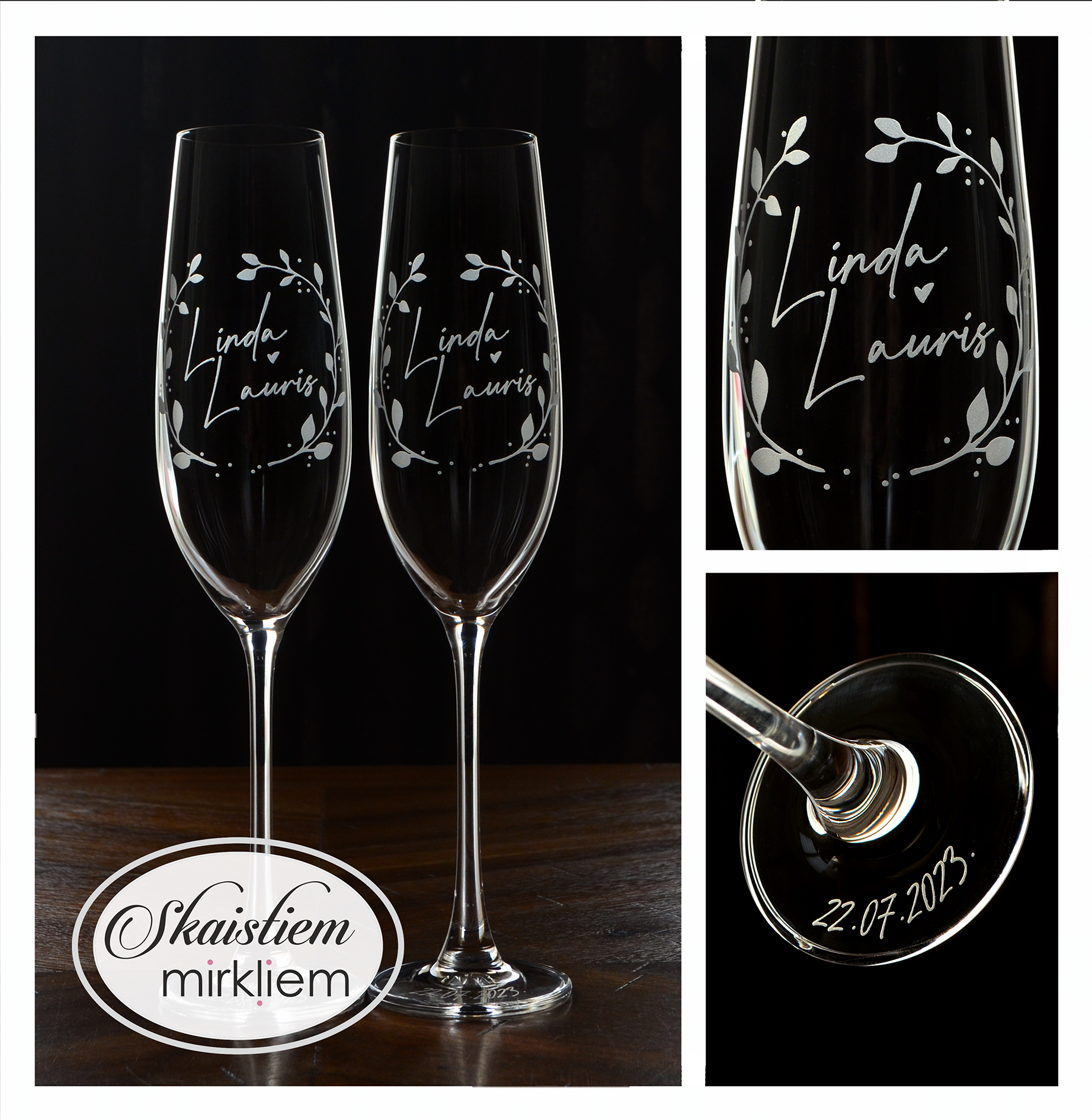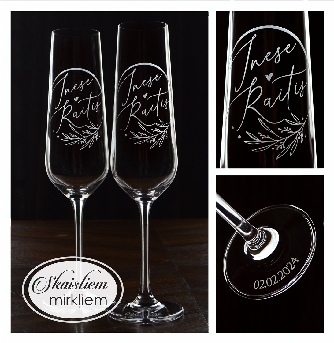 Kāzu šampanieša glāzes ar gravējumu Samanta & Mārtiņš - Skaistiem mirkļiemMūsu gravētās glāzes nav tikai kāzu dienas aksesuārs – tās ir stāsts par mīlestību, pateicību un kopā būšanu.