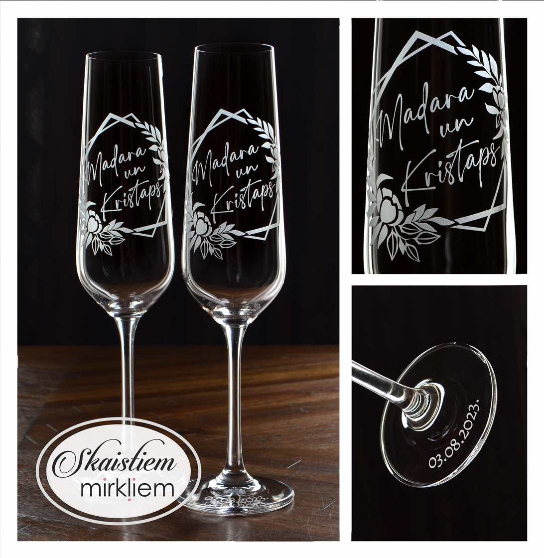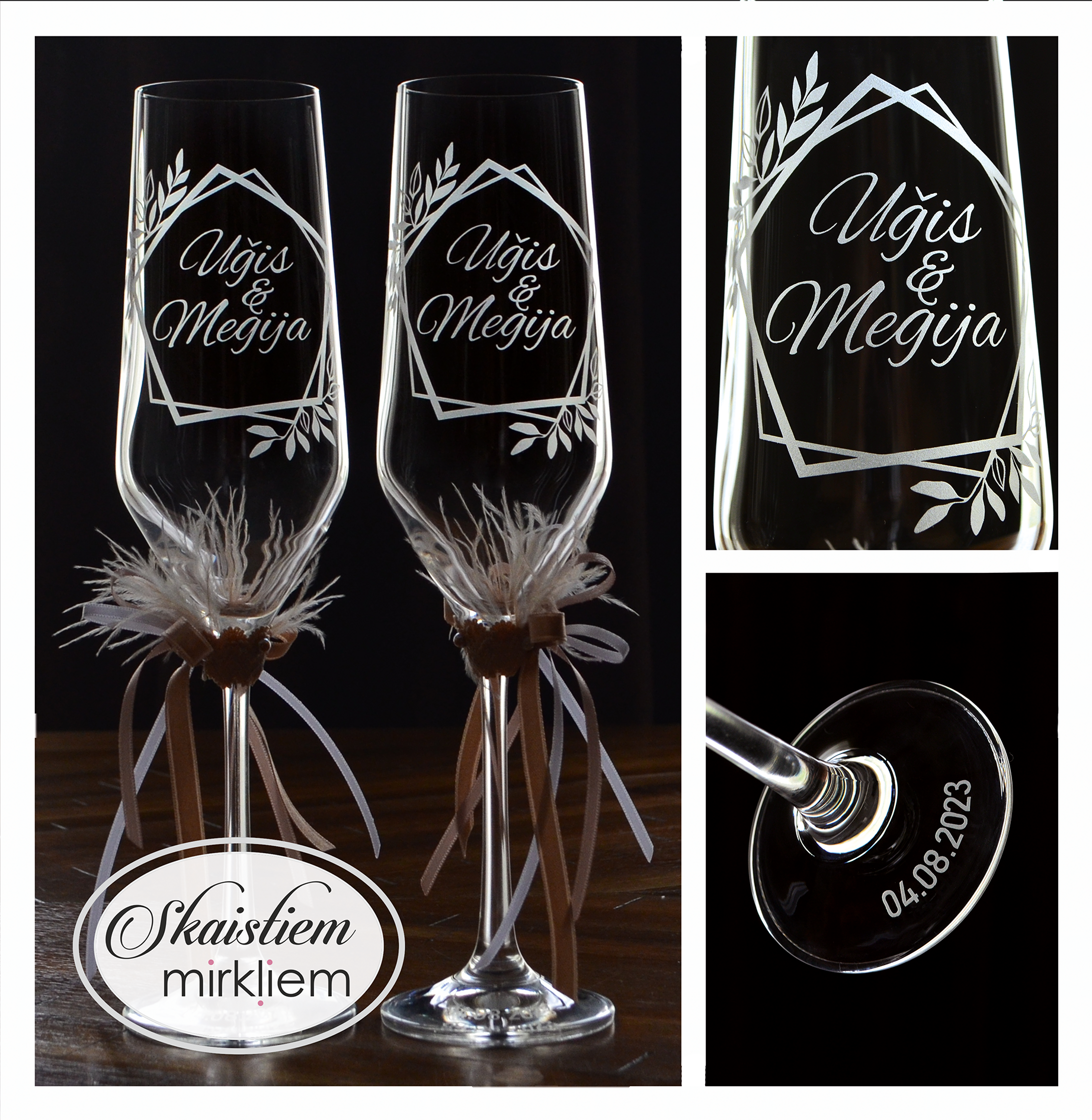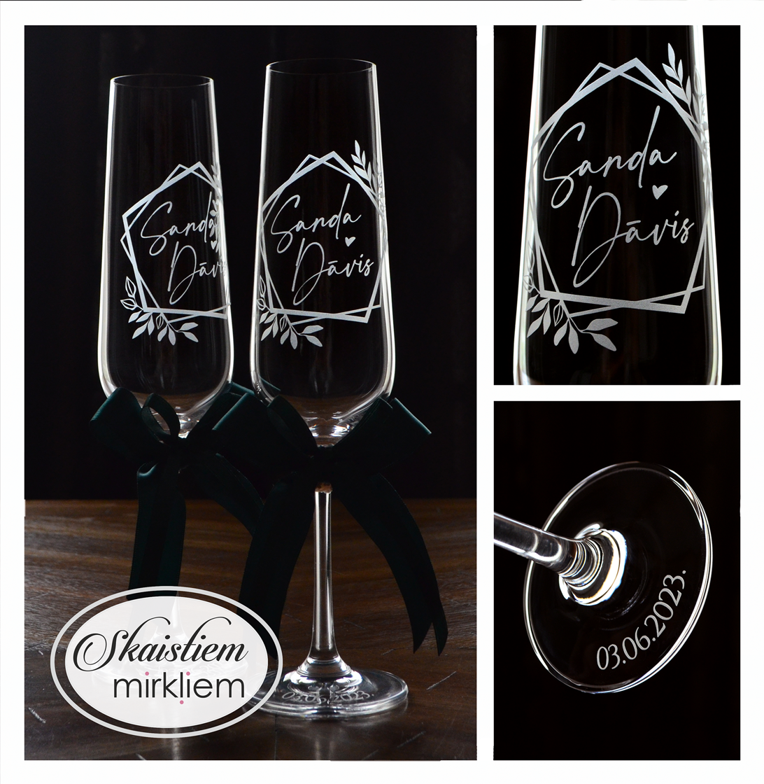 Personalizētas kāzu šampanieša glāzes ar gravējumu un ģeometriskām formām