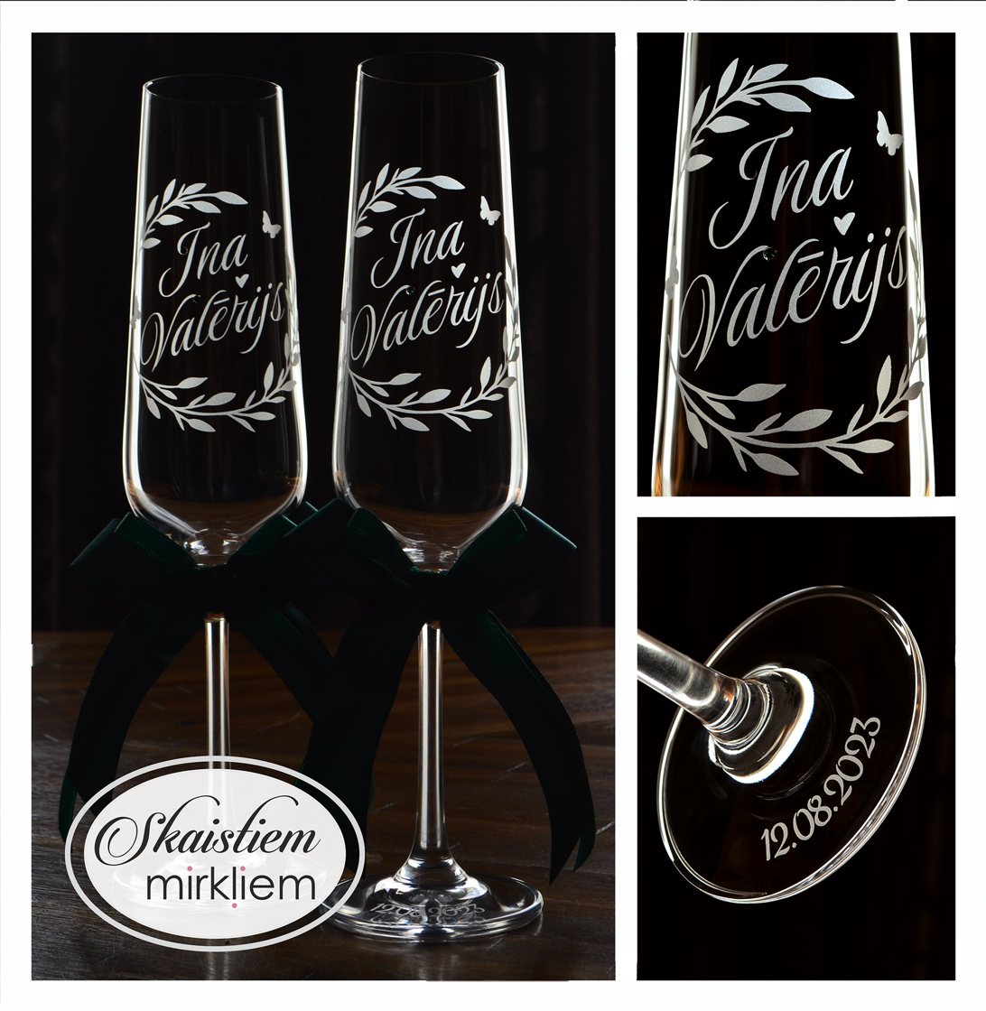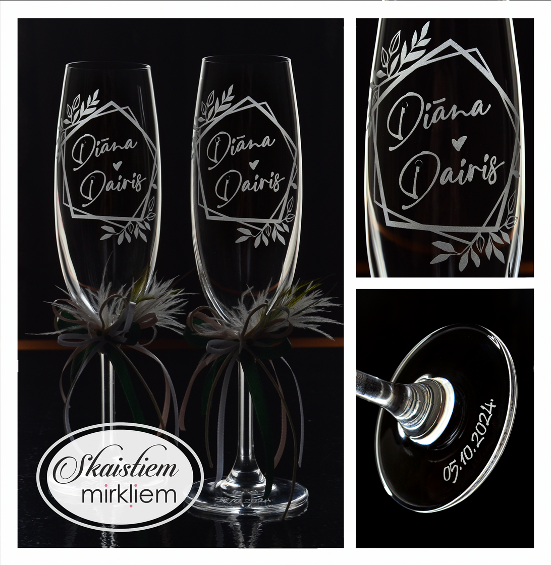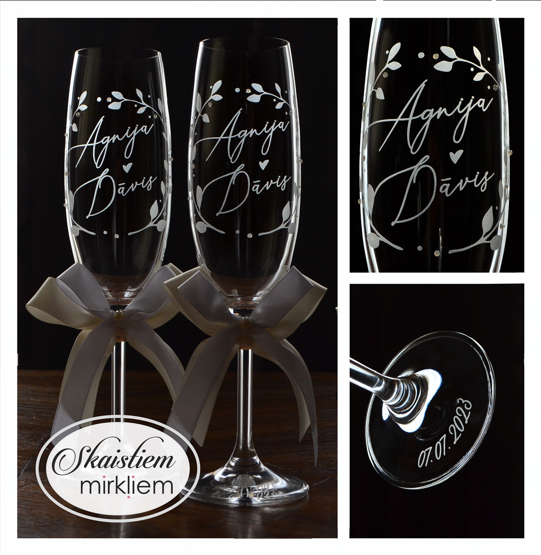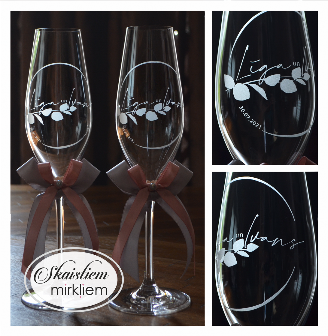 • Saskaņots noformējums: Ir iespējams glāzes papildināt ar lentēm Jūsu izvēlētajos toņos, lai būtu skaistākas kāzu bildes.