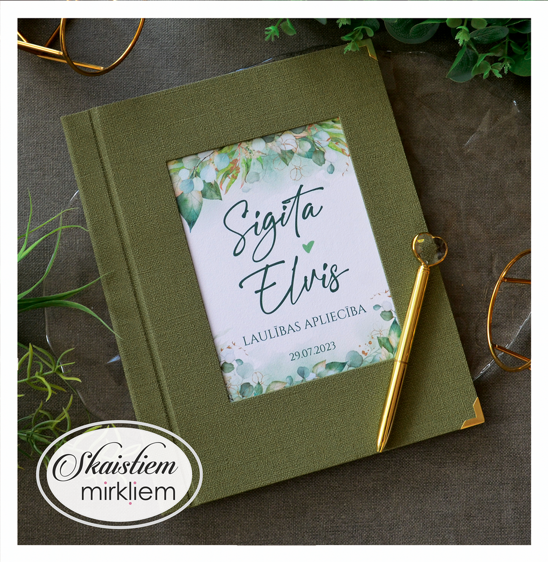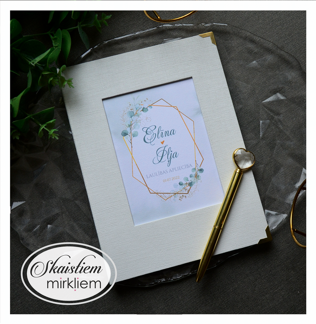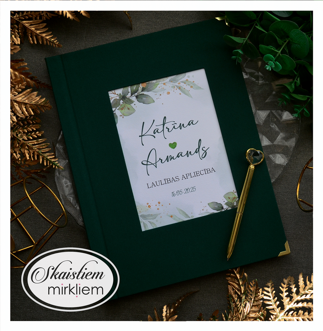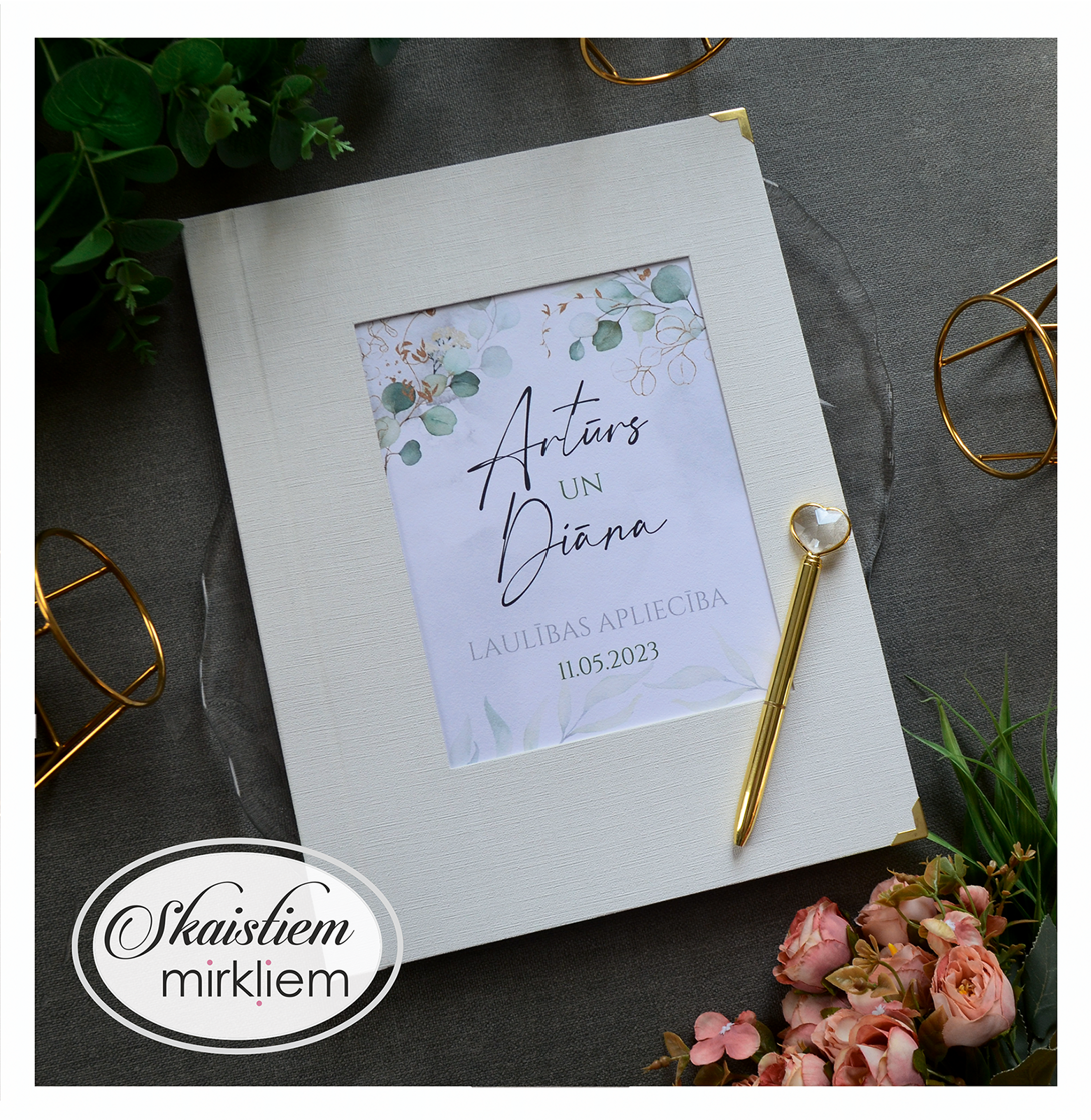 Personalizācija: Pievienojiet vārdus, uzvārdu, kāzu datumu vai īpašu citātu vāku iekšpusē.
