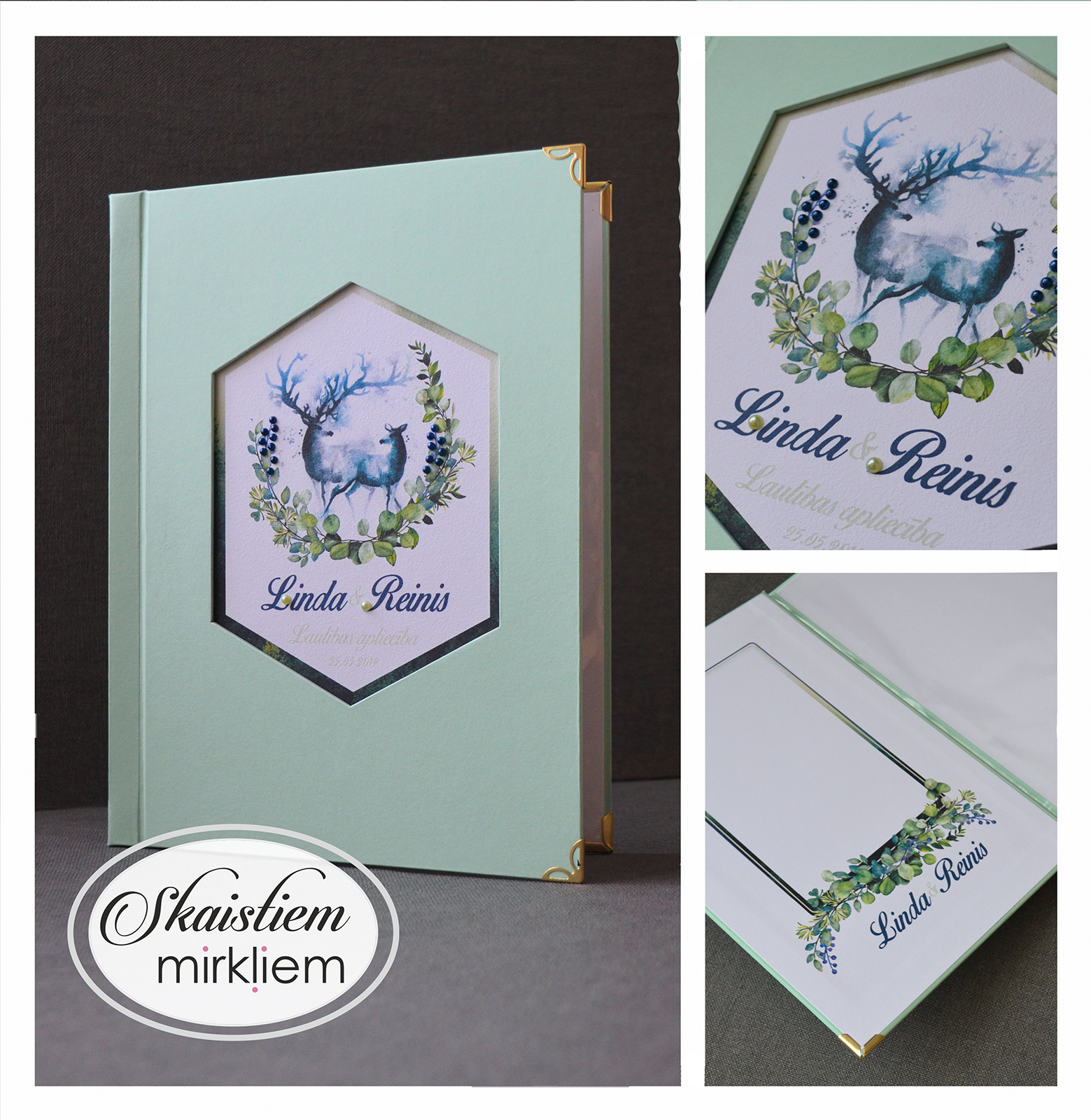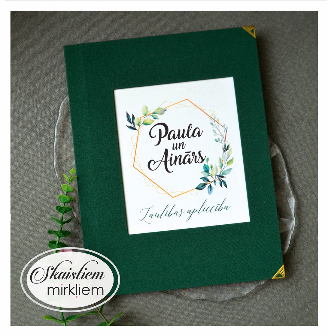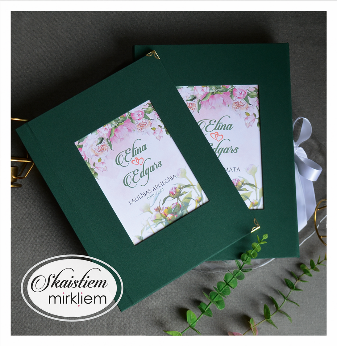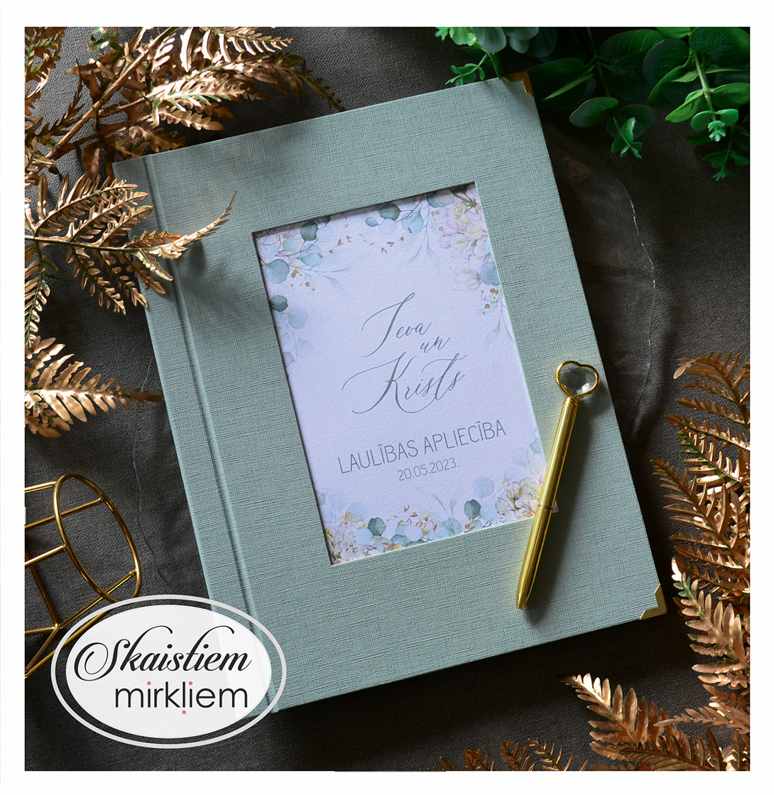 Vākos ir iestrādāta kabatiņa, kurā ievietot dokumentu. Uz iekšējā vāka ir iespēja paredzēt vietu kāzu bildei vai kādam skaistam citātam.