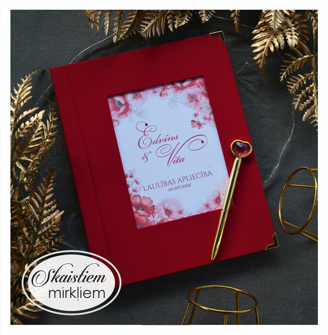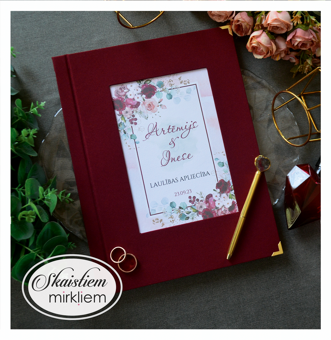 • Personalizācija: Pievienojiet vārdus, uzvārdu, kāzu datumu vai īpašu citātu vāku iekšpusē.