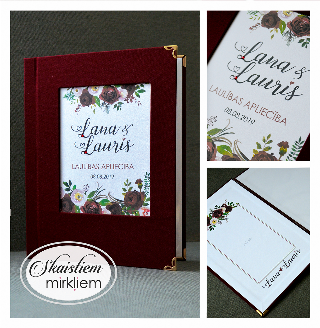 Laulības apliecību vāki ir rūpīgs roku darbs.  Tie ir izgatavoti stingros vākos, kuri apvilkti ar izvēlēto materiālu.
