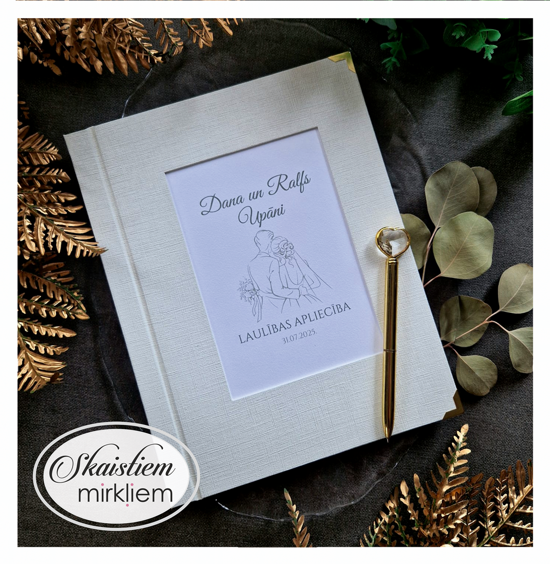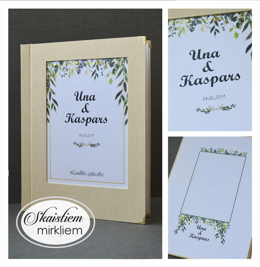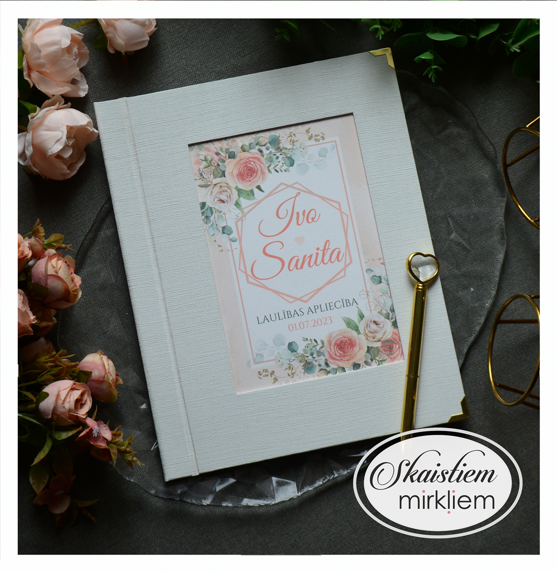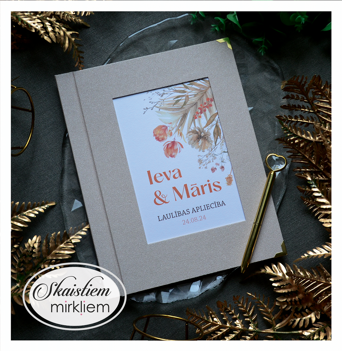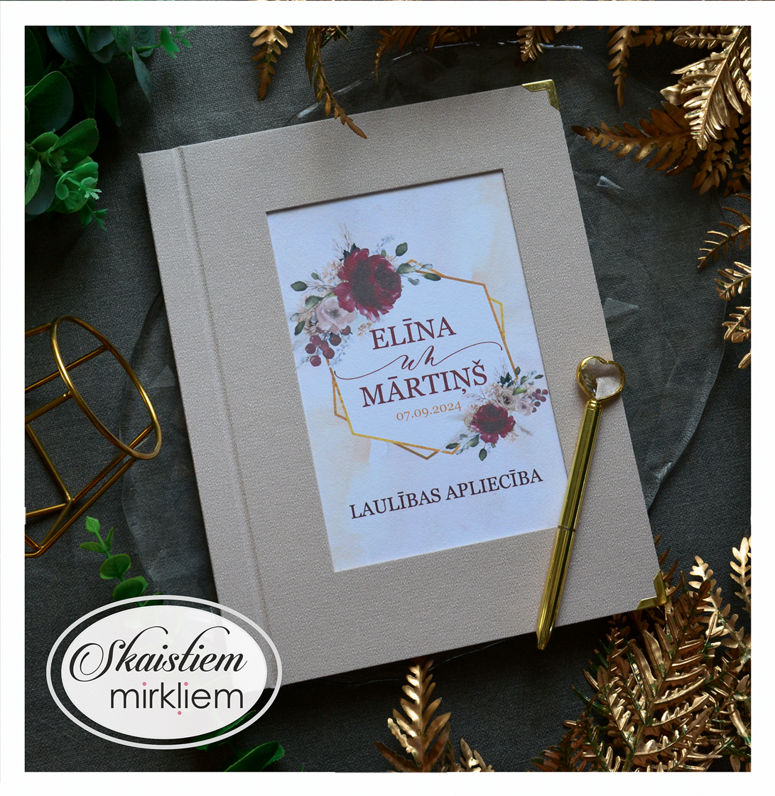 • Personalizācija: Pievienojiet vārdus, uzvārdu, kāzu datumu vai īpašu citātu vāku iekšpusē.