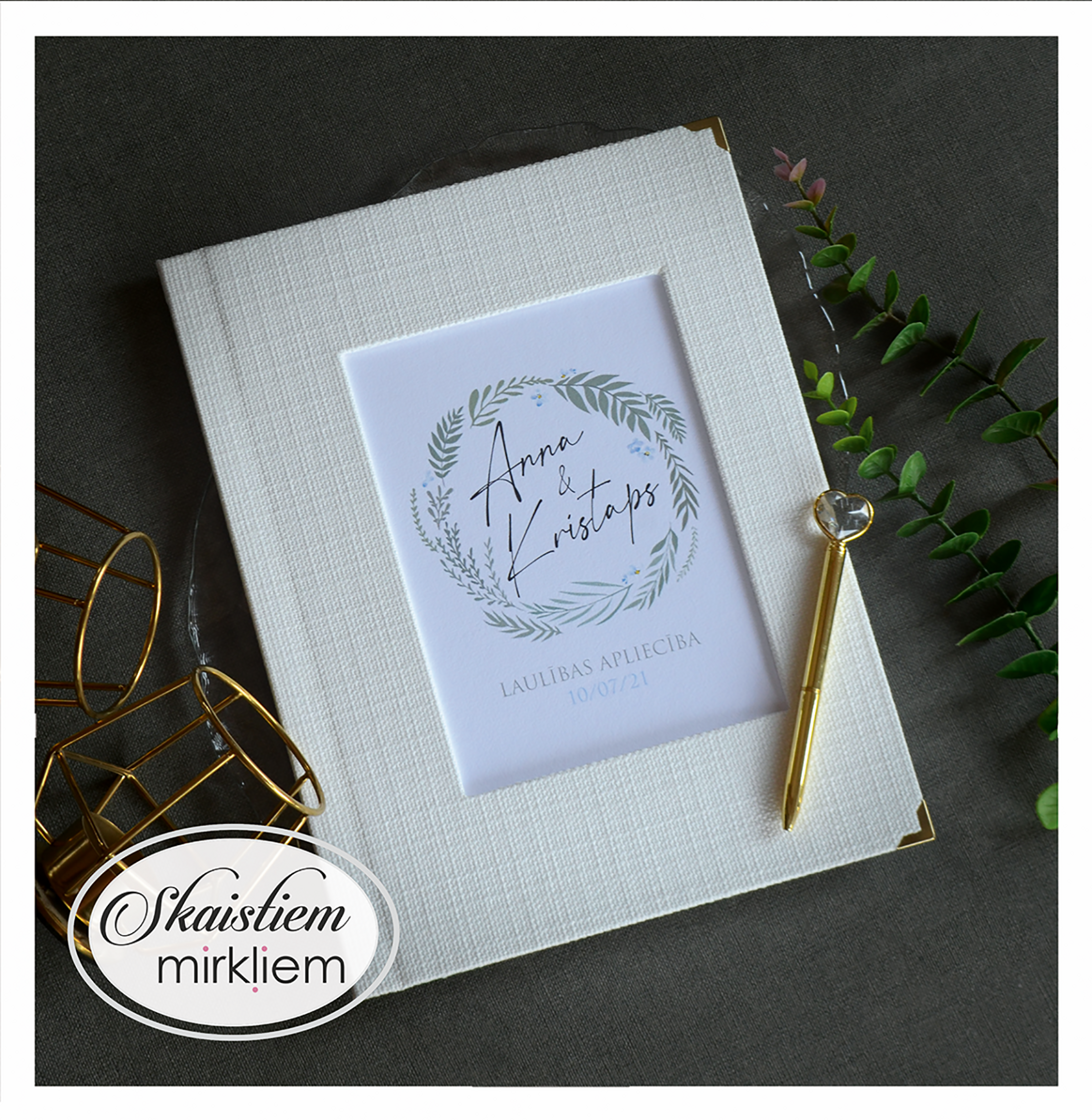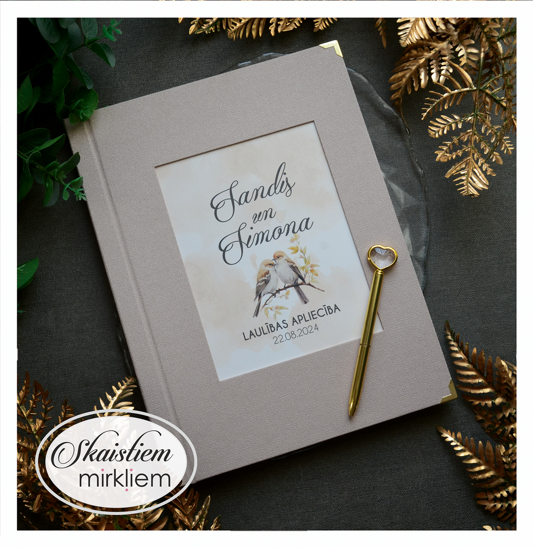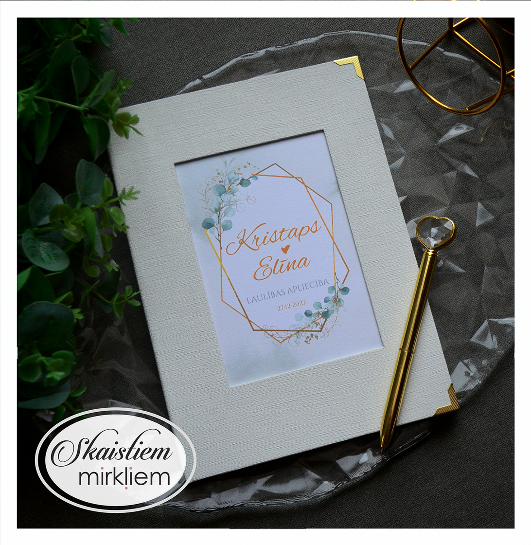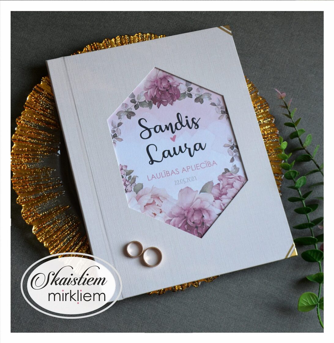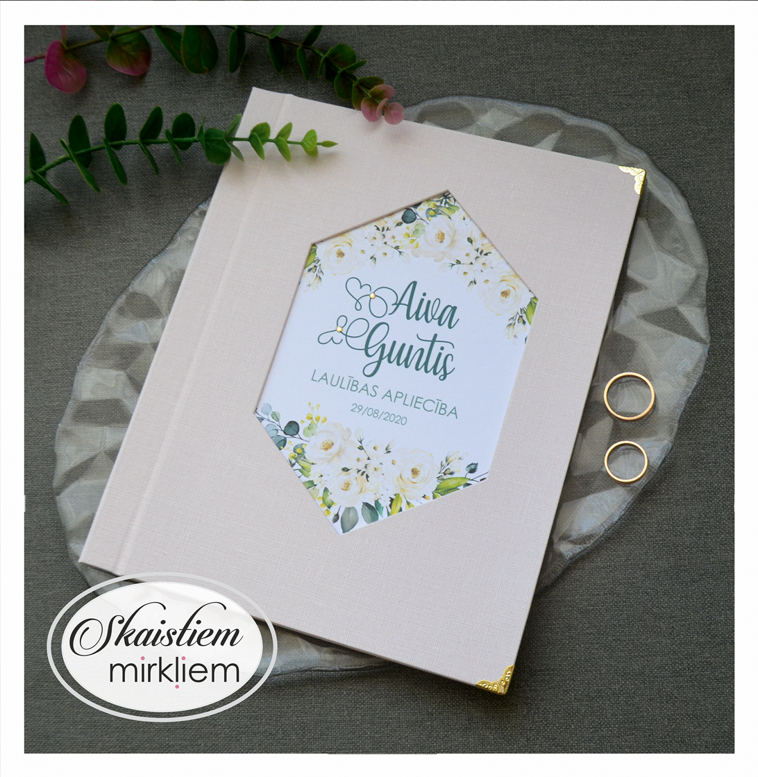 • Personalizācija: Pievienojiet vārdus, uzvārdu, kāzu datumu vai īpašu citātu vāku iekšpusē.
