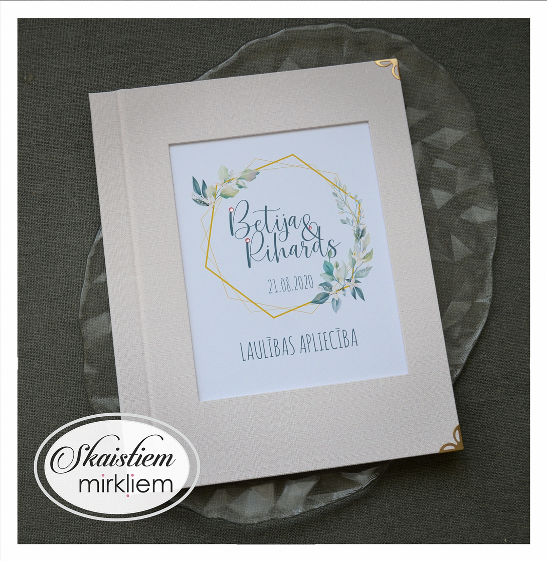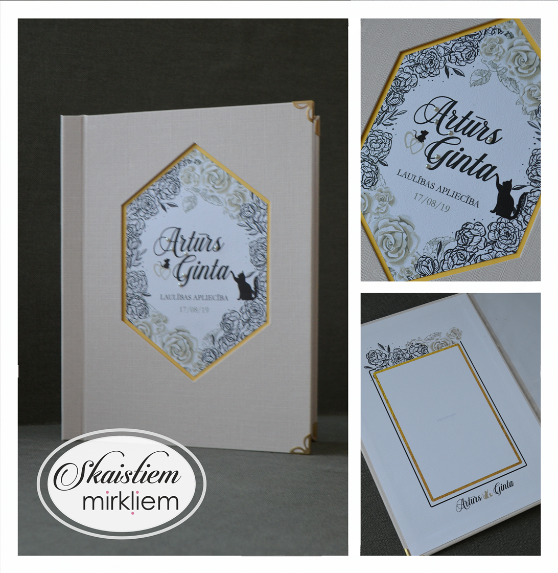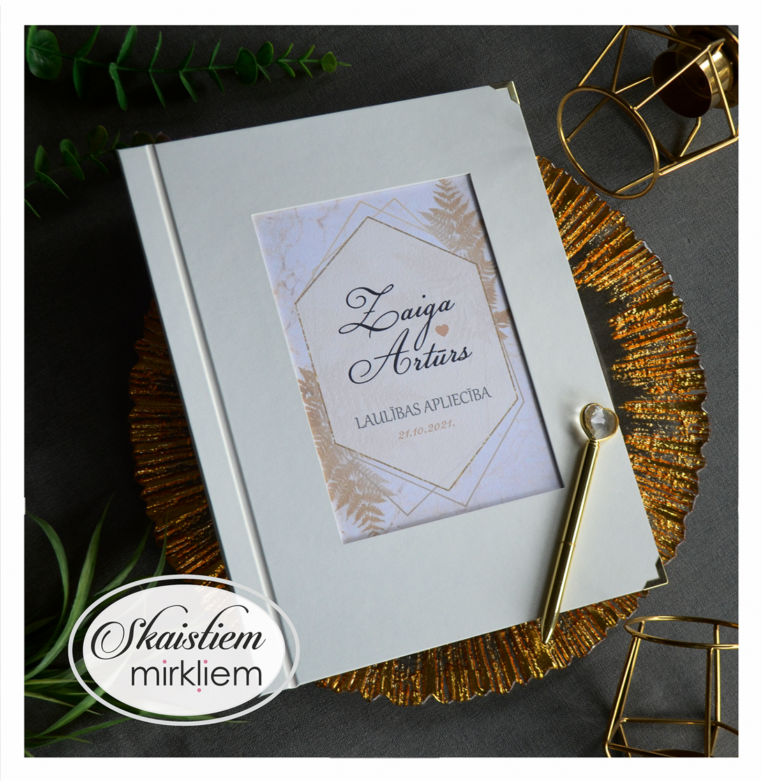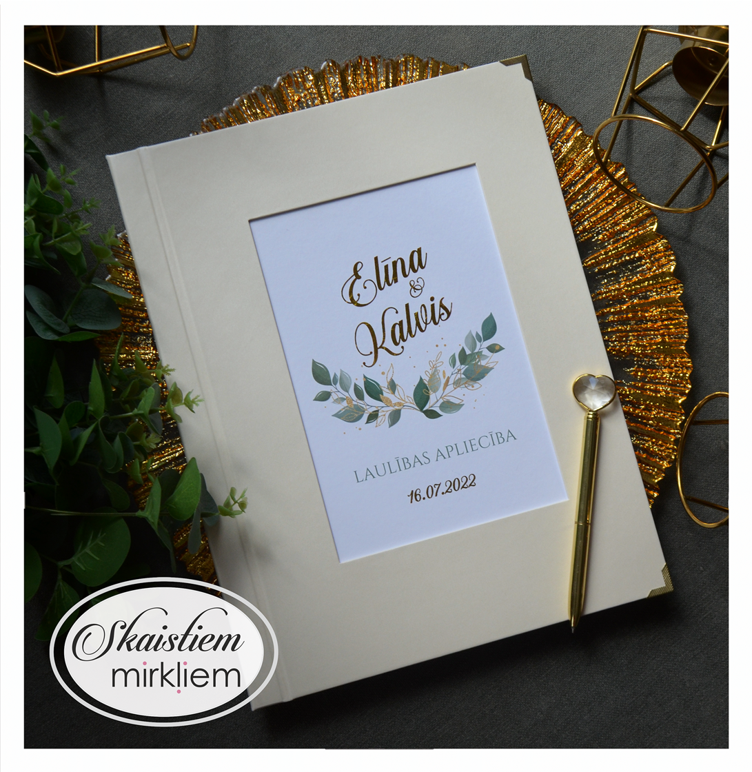 • Personalizācija: Pievienojiet vārdus, uzvārdu, kāzu datumu vai īpašu citātu vāku iekšpusē.