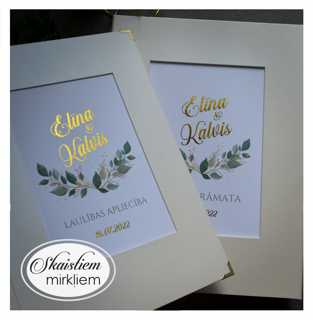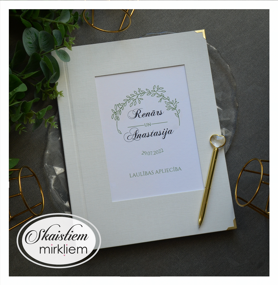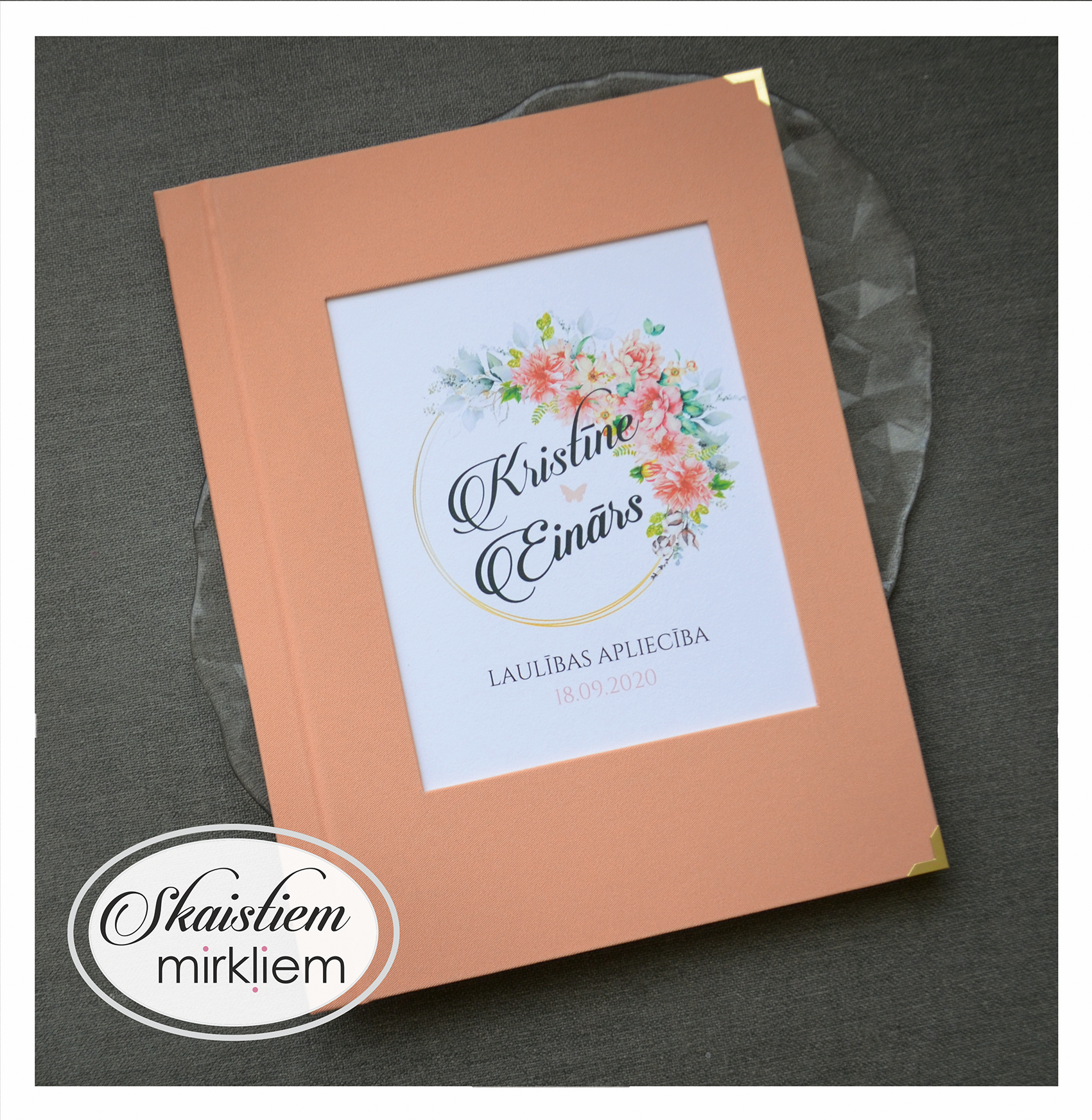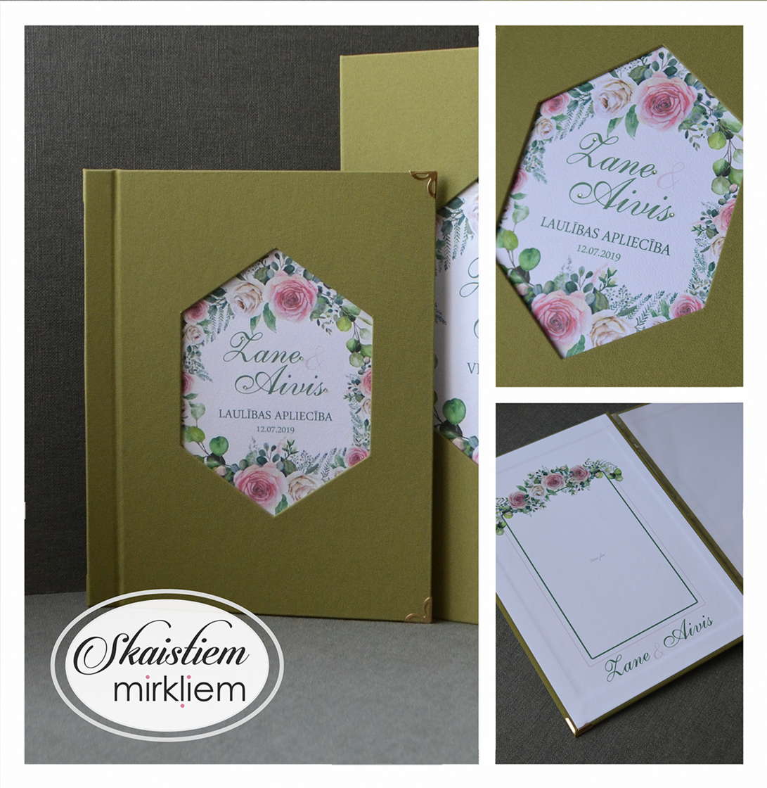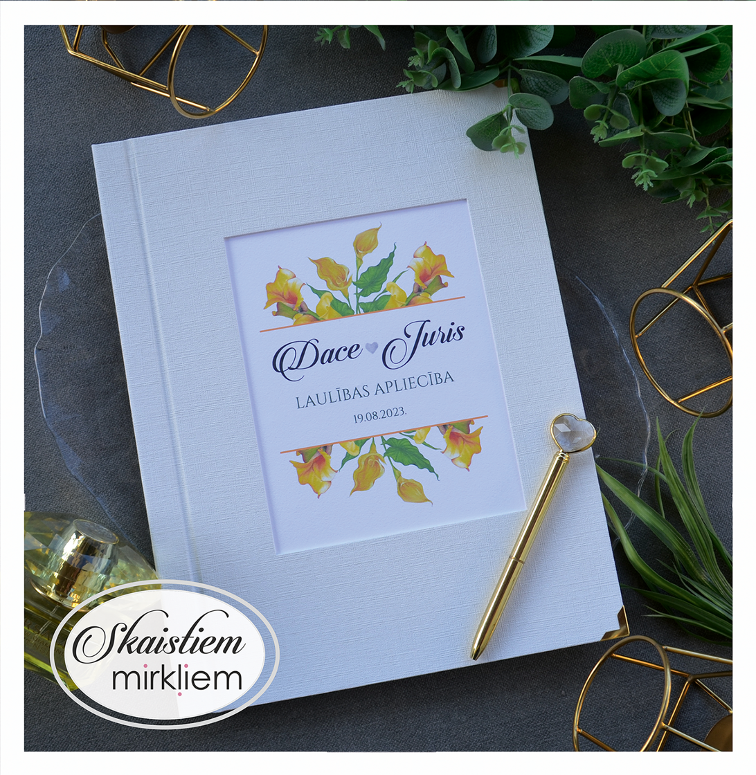 • Personalizācija: Pievienojiet vārdus, uzvārdu, kāzu datumu vai īpašu citātu vāku iekšpusē.