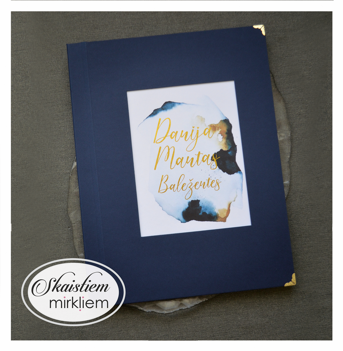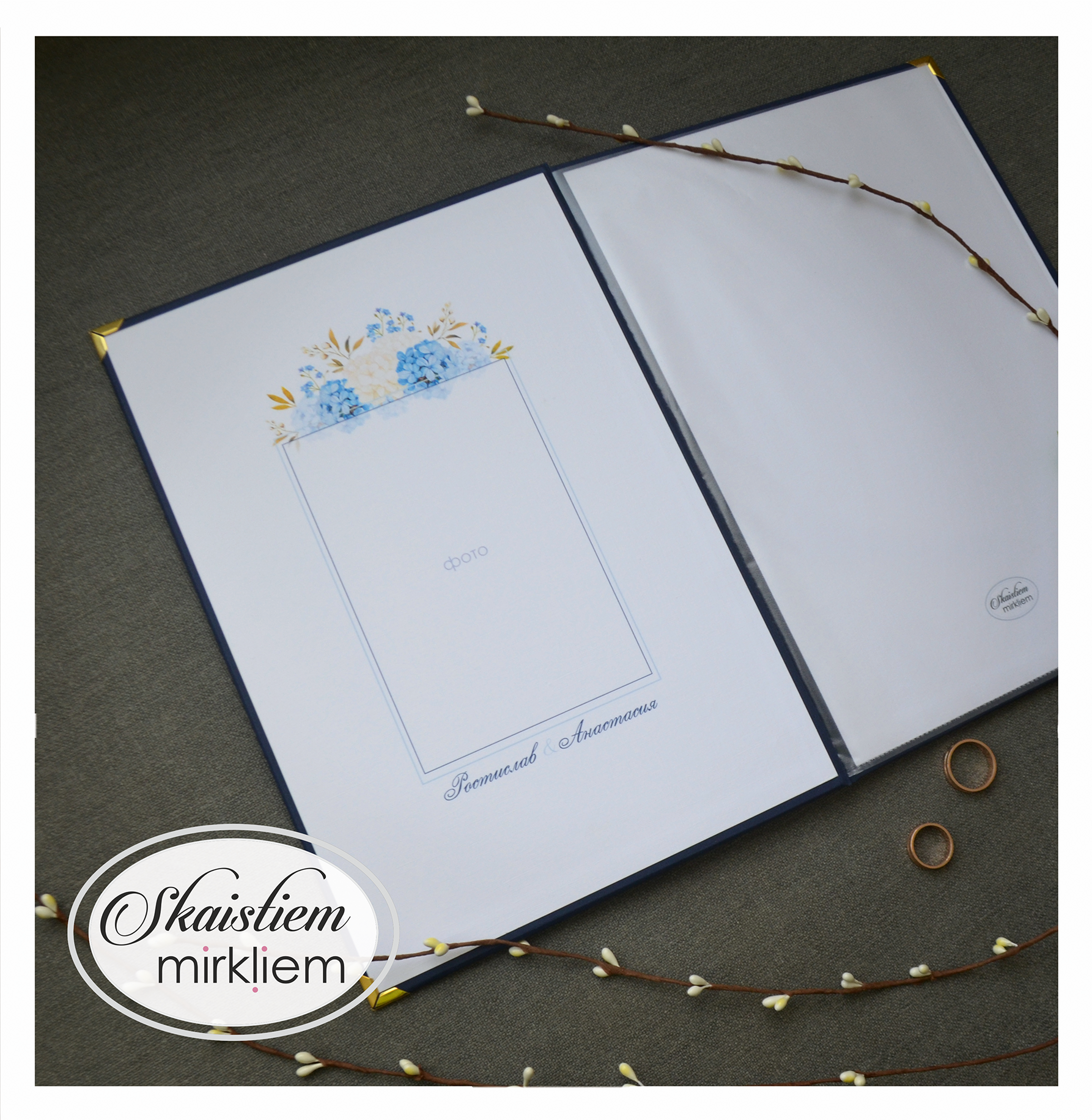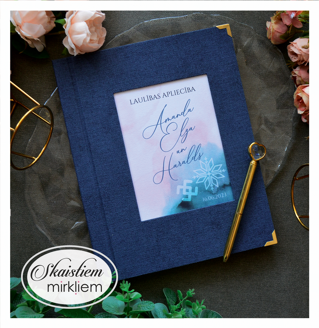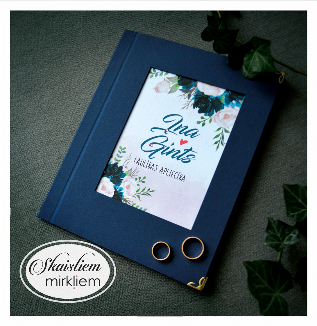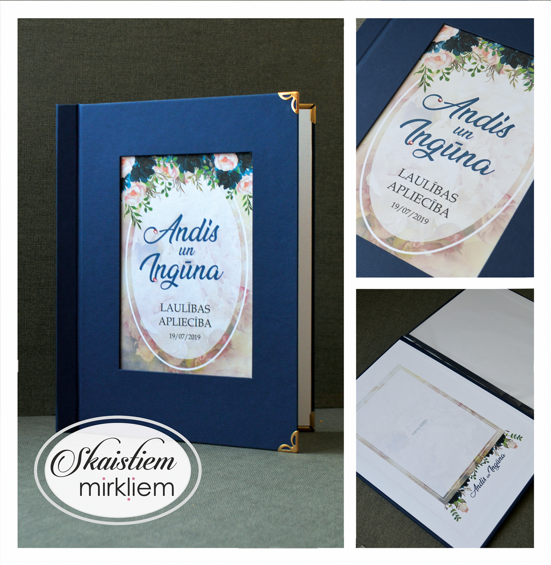 Vākos ir iestrādāta kabatiņa, kurā ievietot dokumentu. Uz iekšējā vāka ir iespēja paredzēt vietu kāzu bildei vai kādam skaistam citātam.
