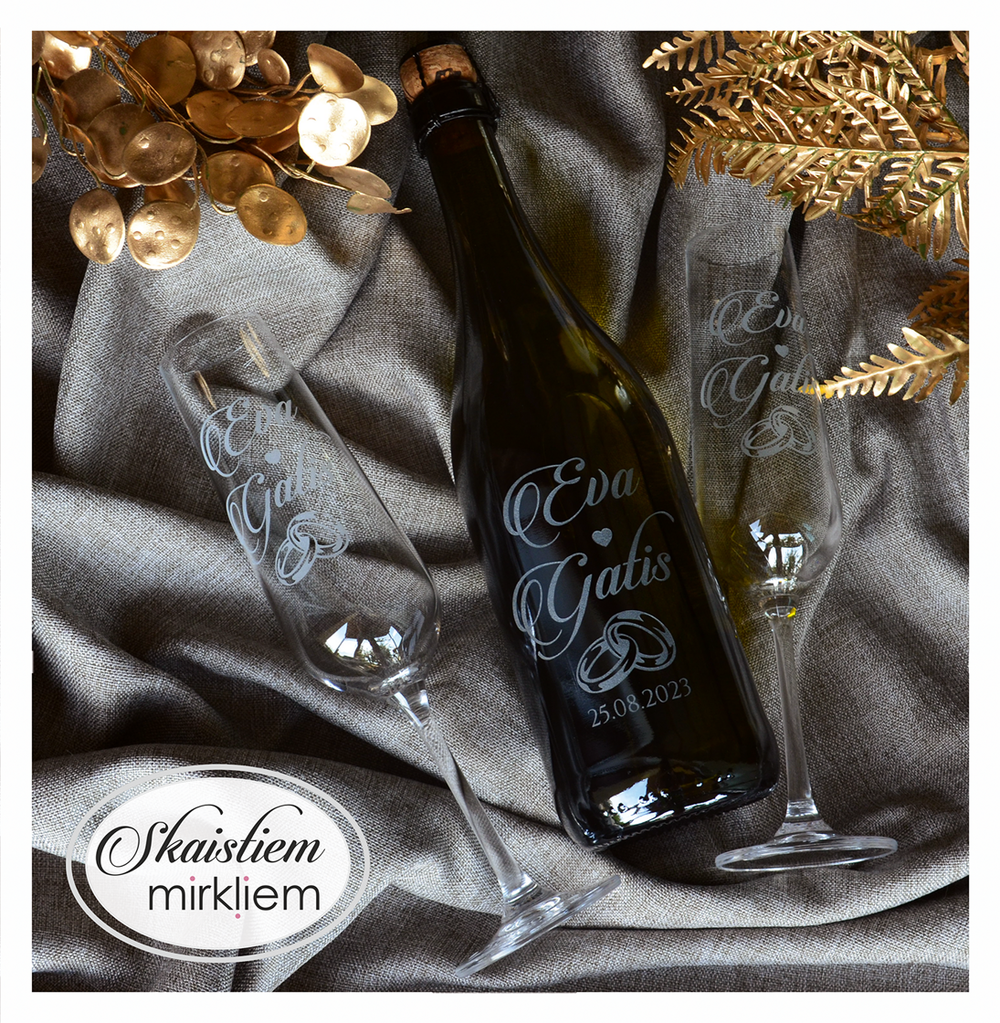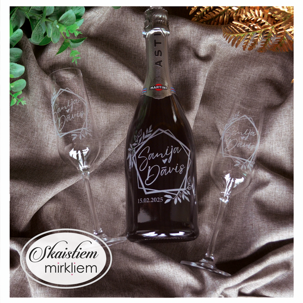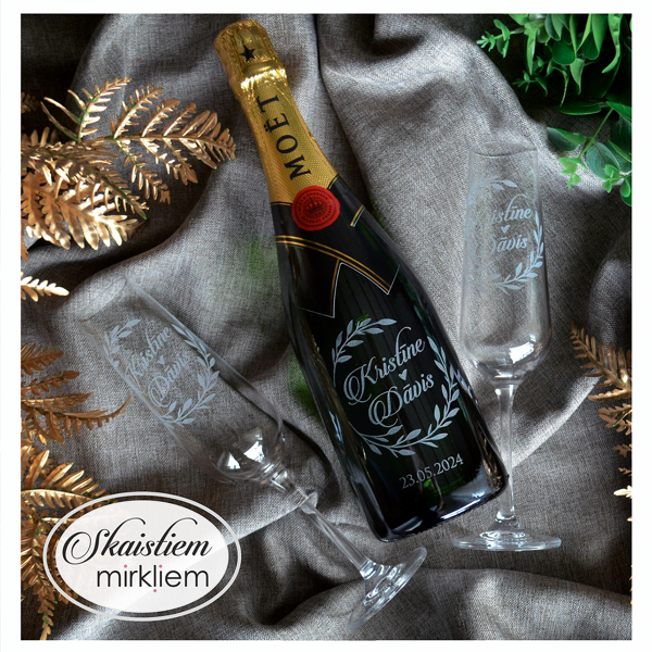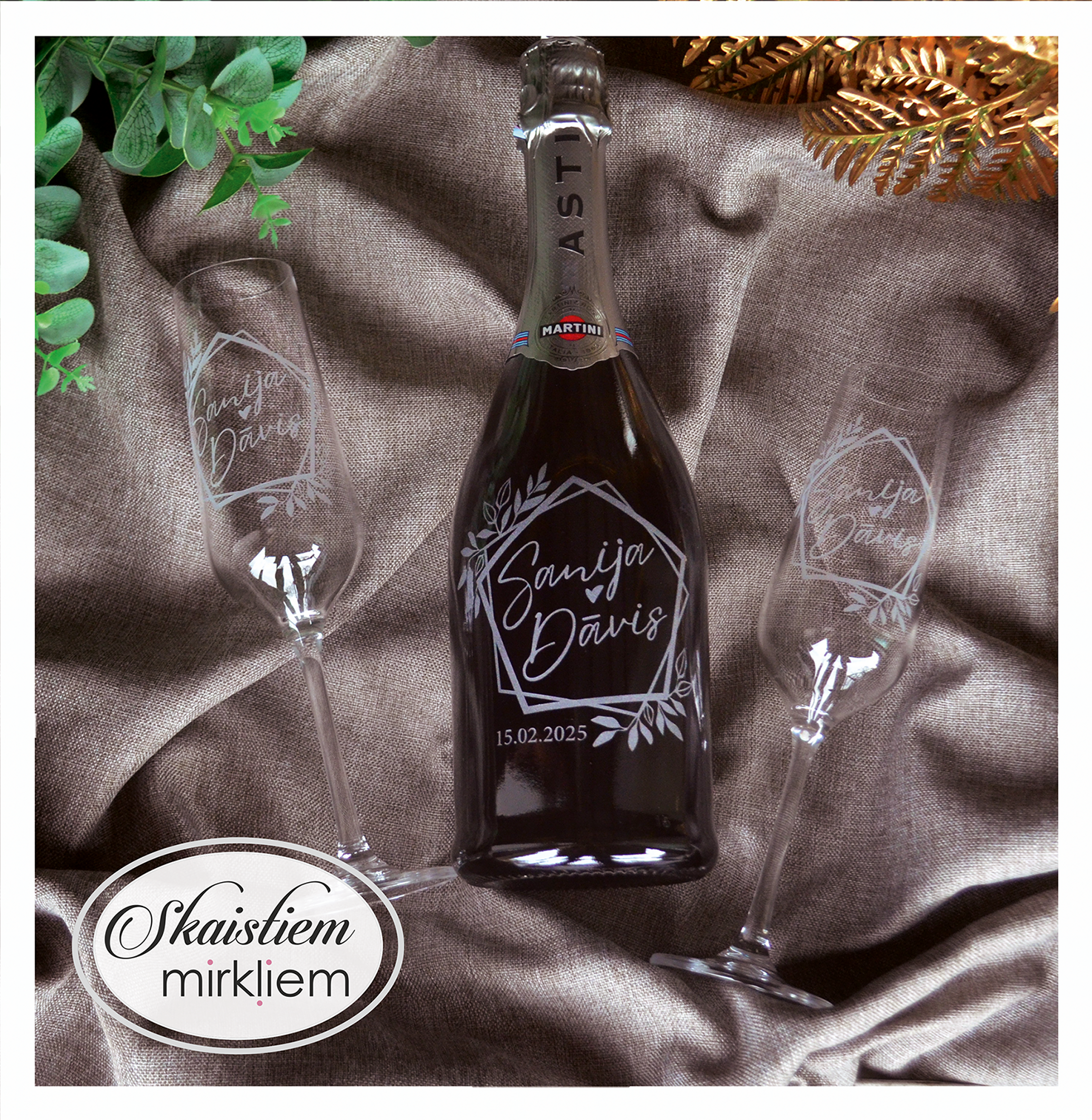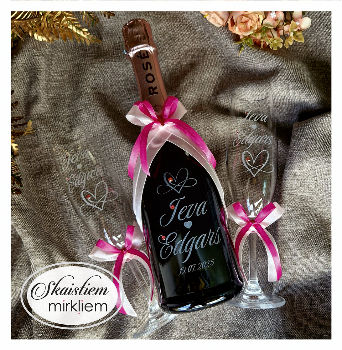 Pārdomāts dizains: Katru gravējumu ir iespēja papildināt ar elegantiem grafiskiem elementiem – sirdīm, ziedu motīviem vai gredzeniem, kas saskaņoti ar Jūsu svētku stilistiku.
