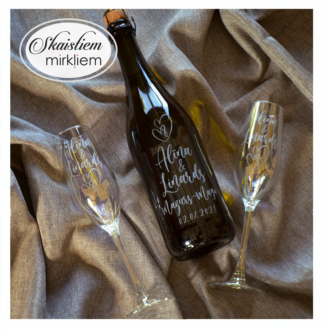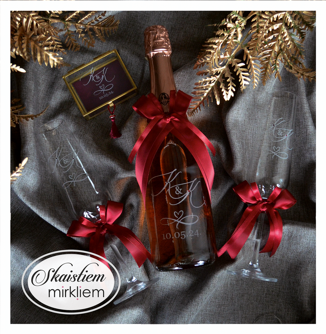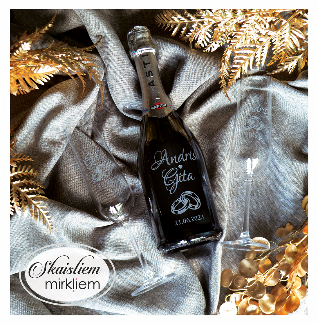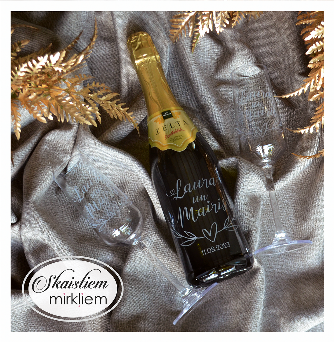 Pārdomāts dizains: Katru gravējumu ir iespēja papildināt ar elegantiem grafiskiem elementiem – sirdīm, ziedu motīviem vai gredzeniem, kas saskaņoti ar Jūsu svētku stilistiku.