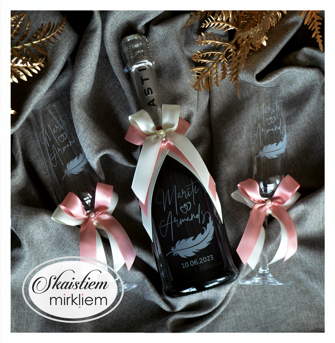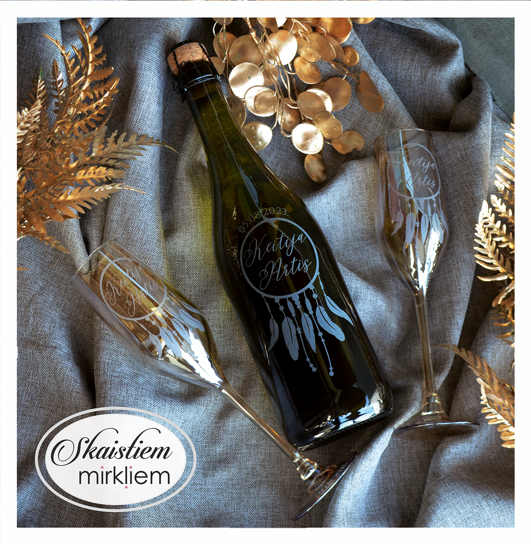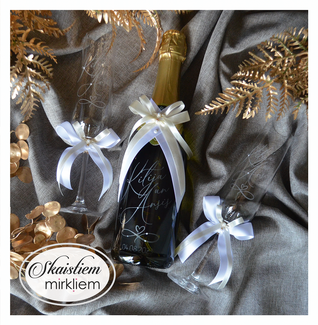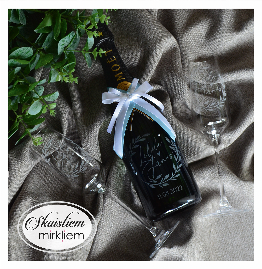 Pārdomāts dizains: Katru gravējumu ir iespēja papildināt ar elegantiem grafiskiem elementiem – sirdīm, ziedu motīviem vai gredzeniem, kas saskaņoti ar Jūsu svētku stilistiku.