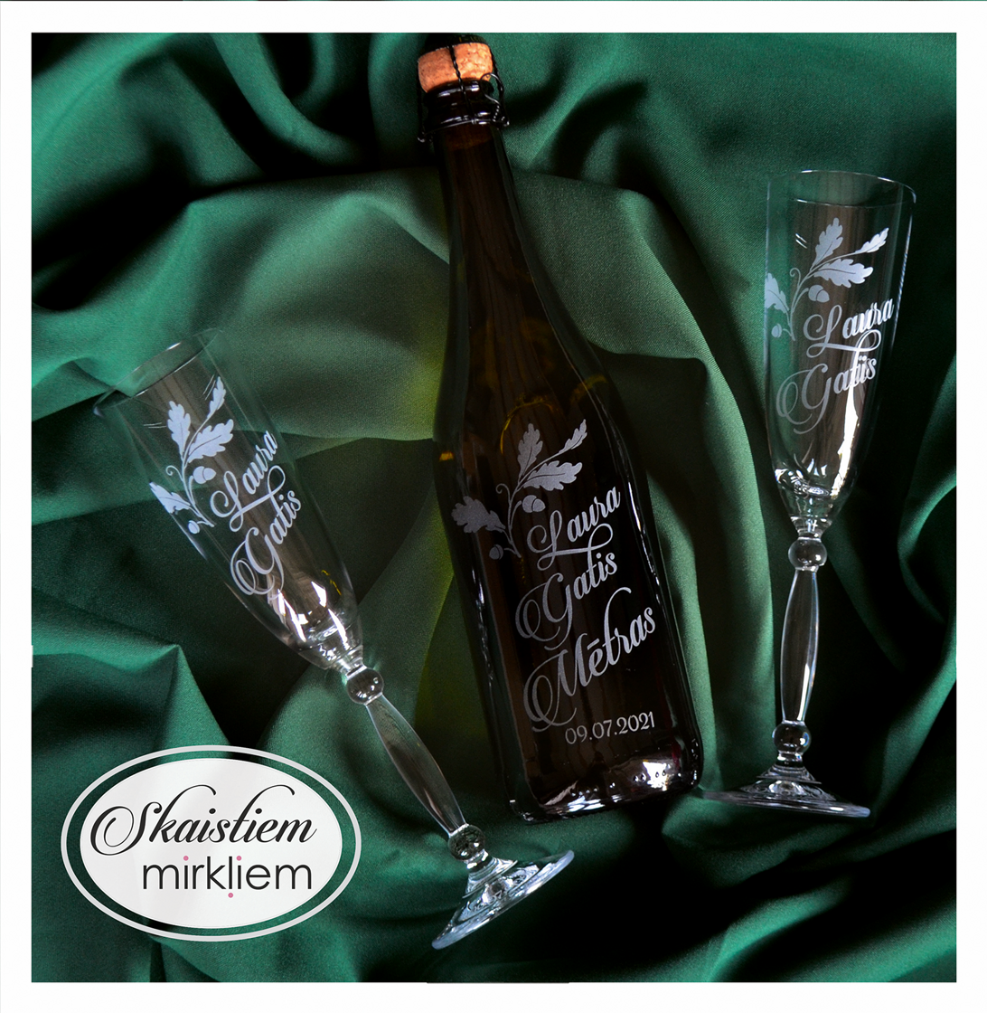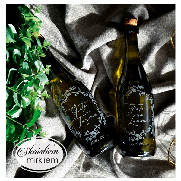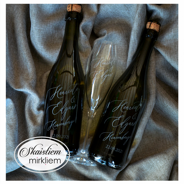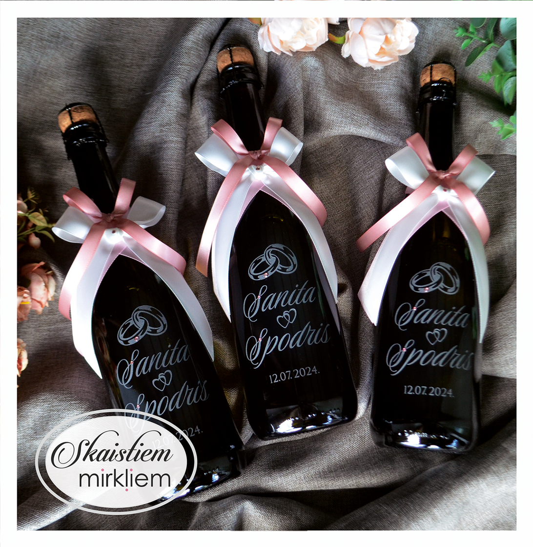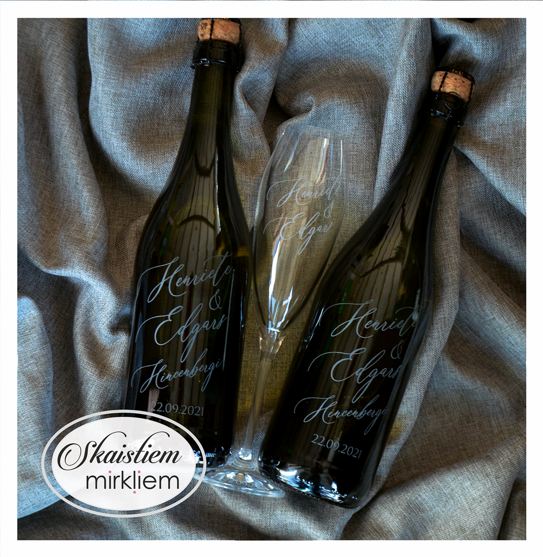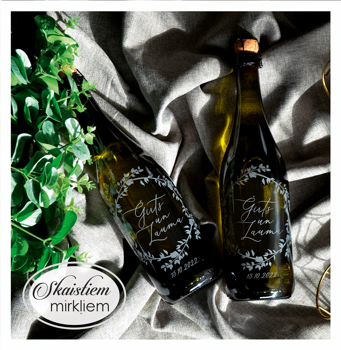 Saskaņotība: Ja pasūtāt pie mums arī citas kāzu lietas, mēs saskaņosim pudeles gravējuma fontu un stilistiku ar pārējo pasūtījumu.