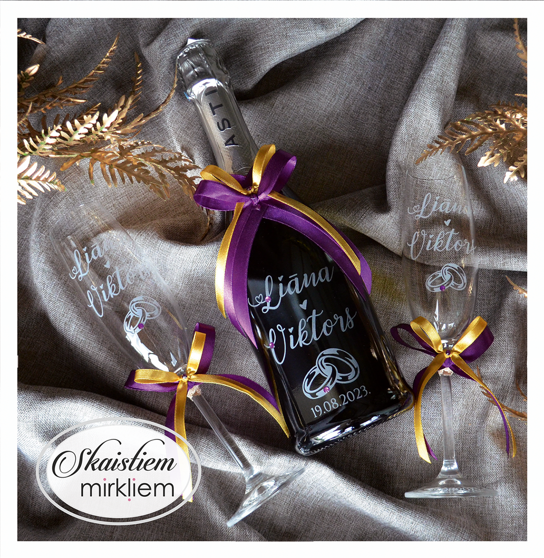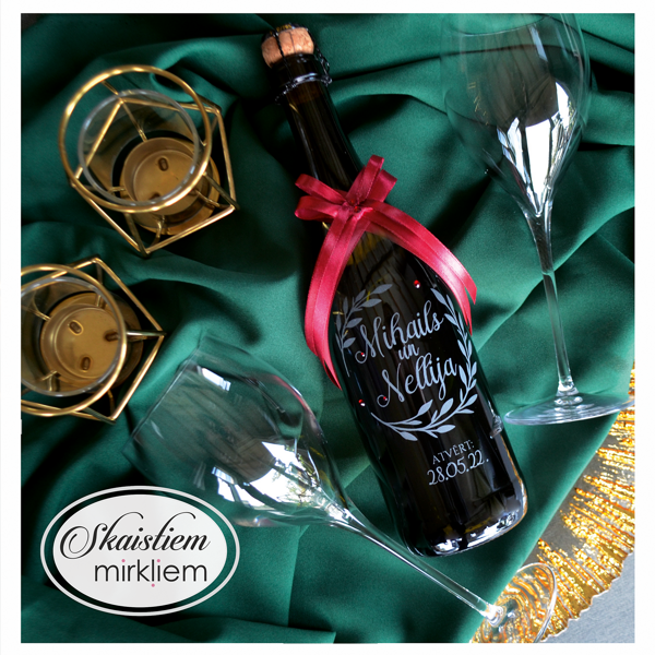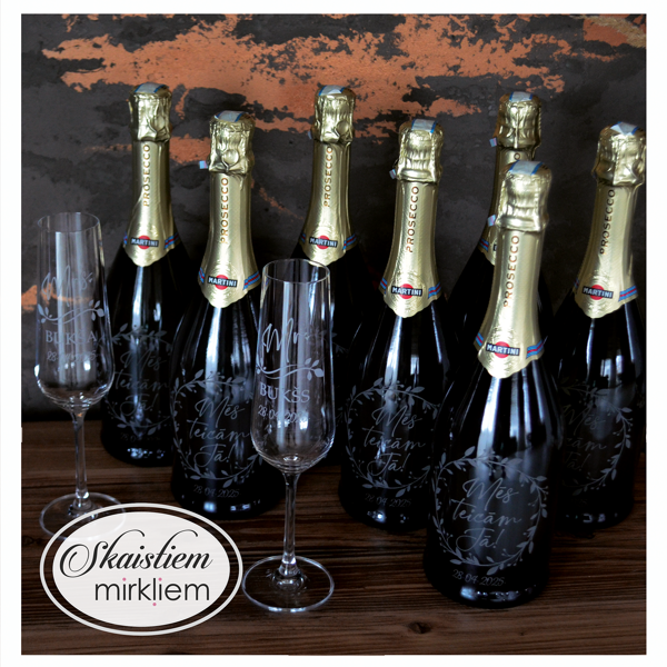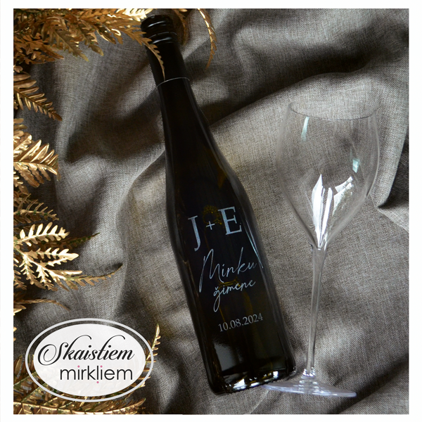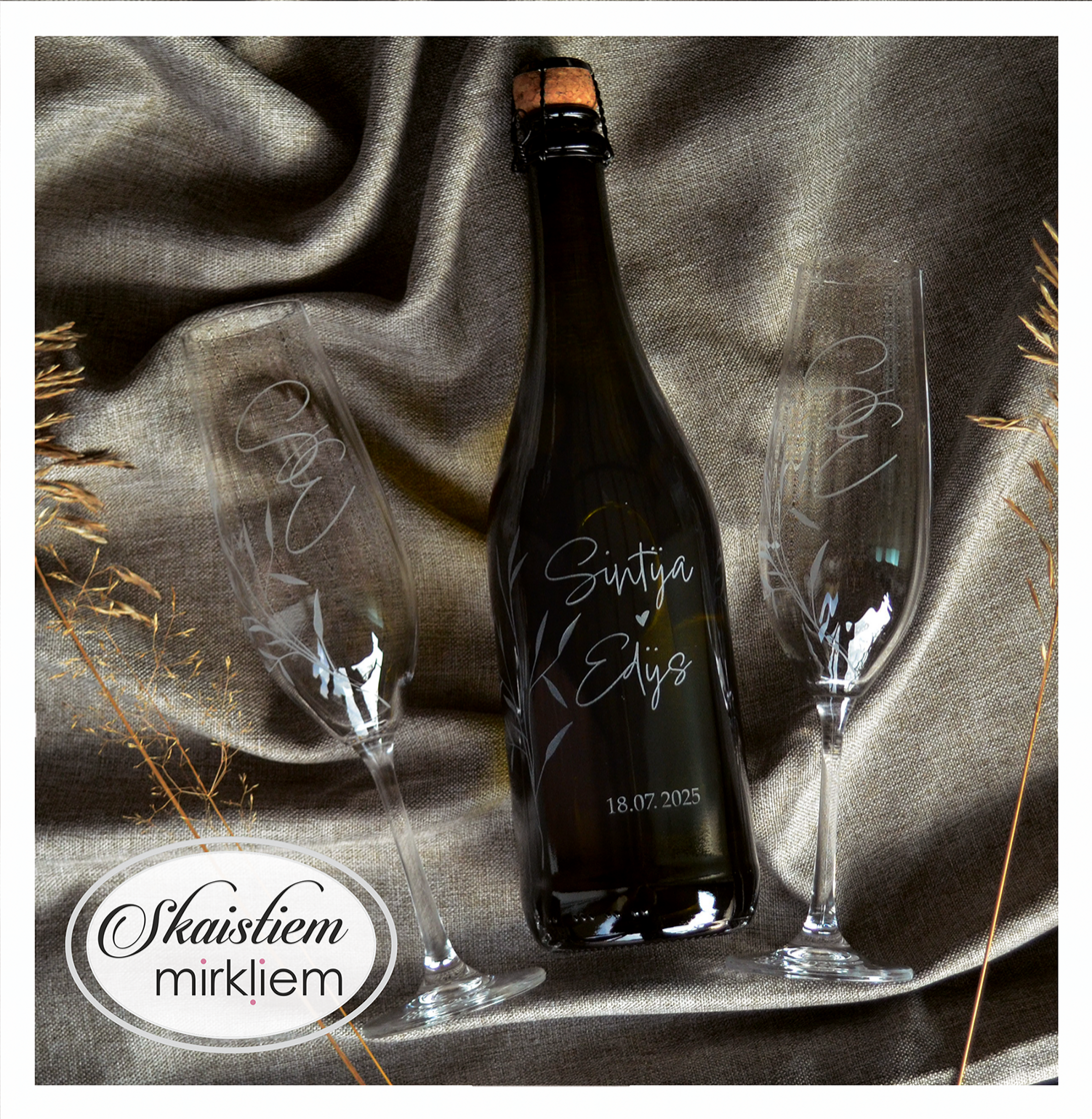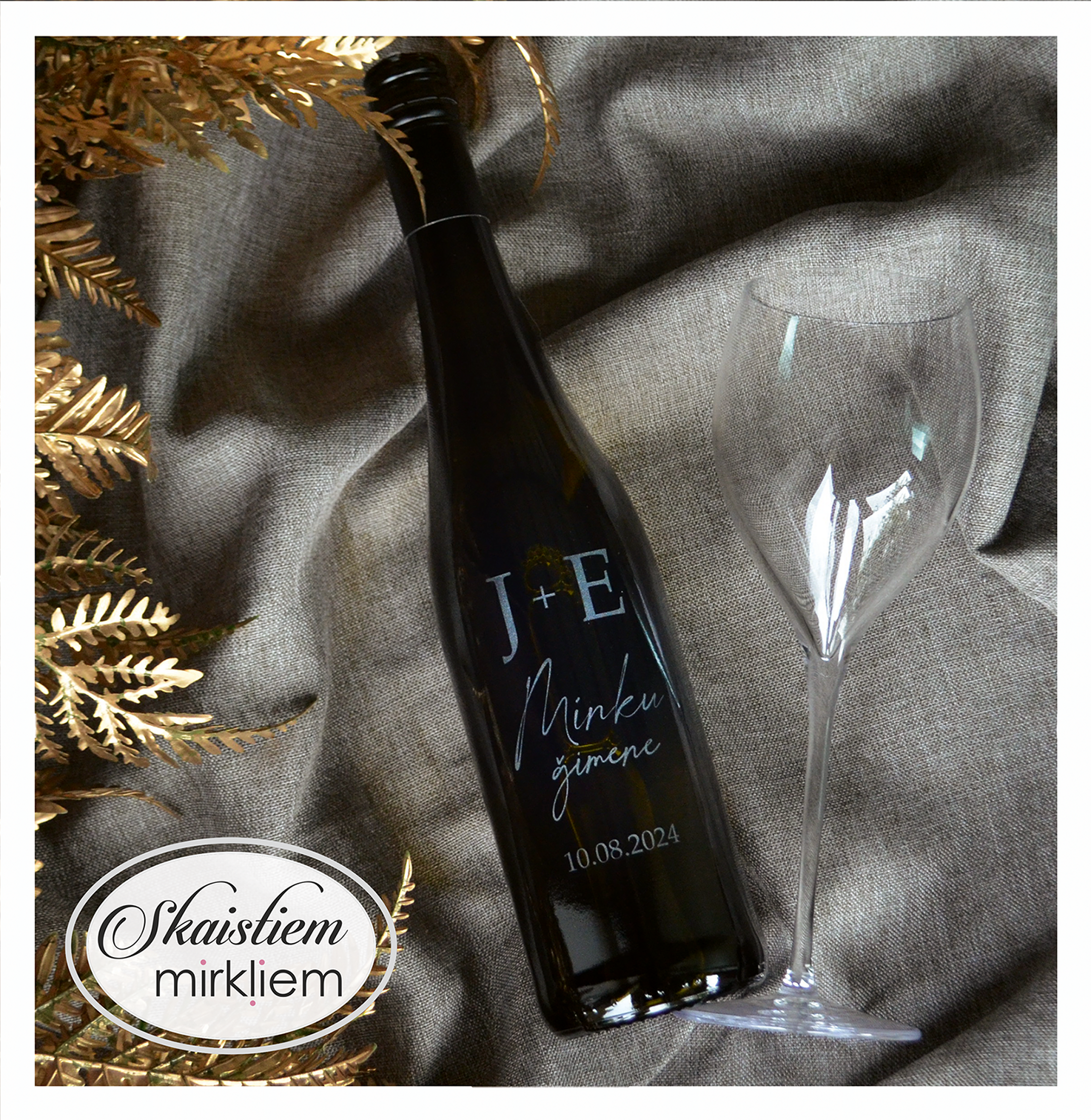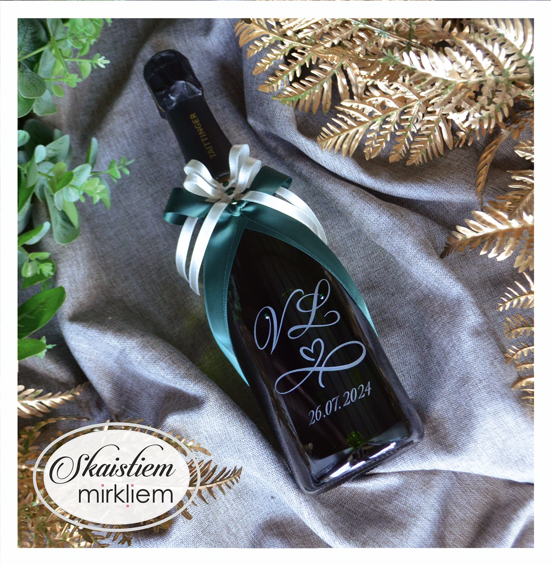 Saskaņotība: Ja pasūtāt pie mums arī citas kāzu lietas, mēs saskaņosim pudeles gravējuma fontu un stilistiku ar pārējo pasūtījumu.