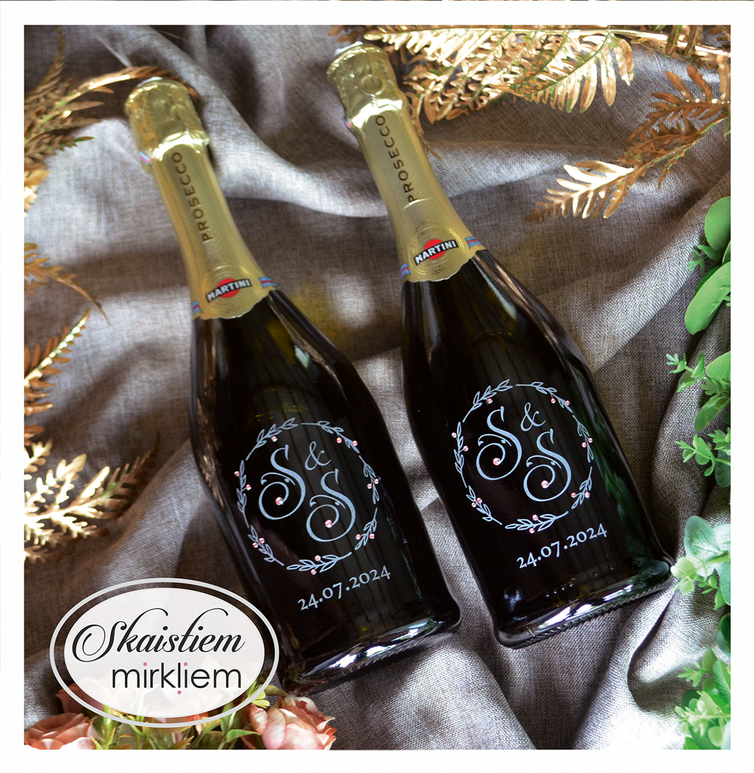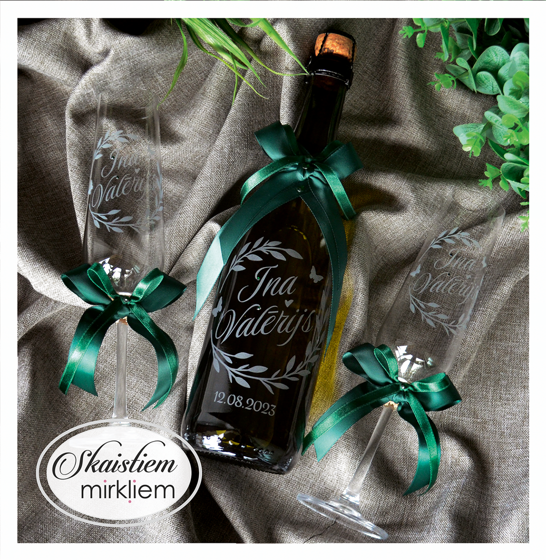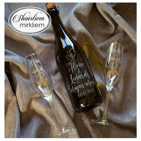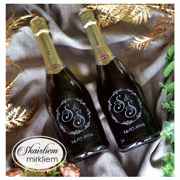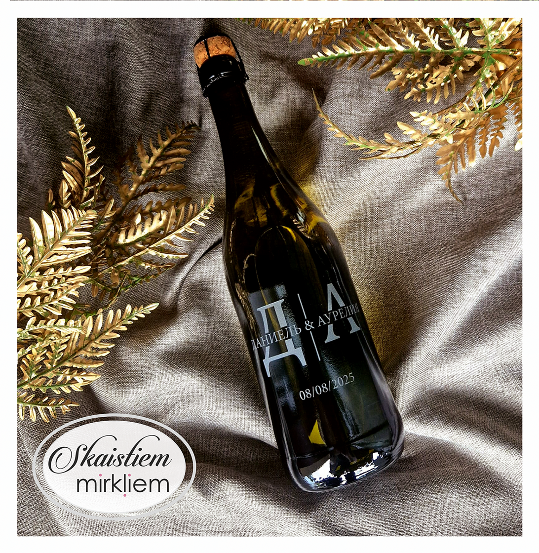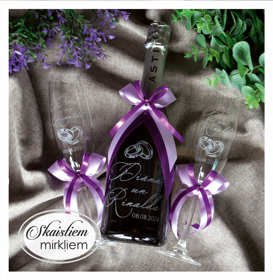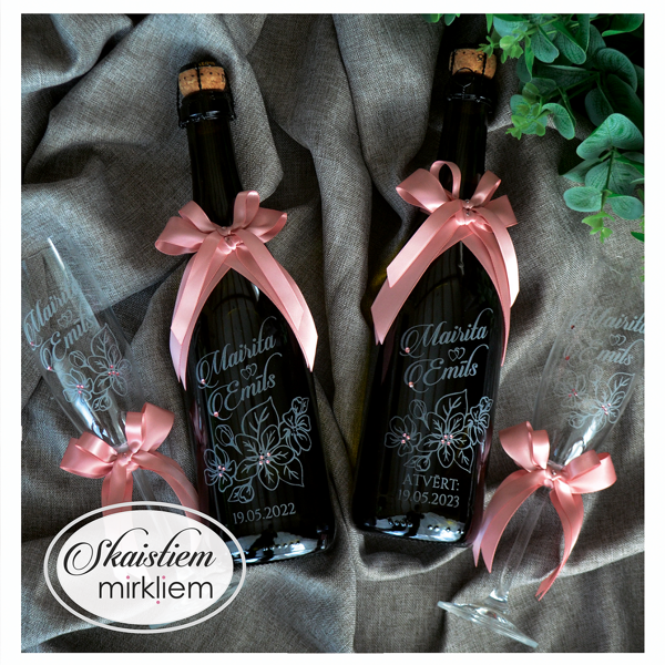 Saskaņotība: Ja pasūtāt pie mums arī citas kāzu lietas, mēs saskaņosim pudeles gravējuma fontu un stilistiku ar pārējo pasūtījumu.