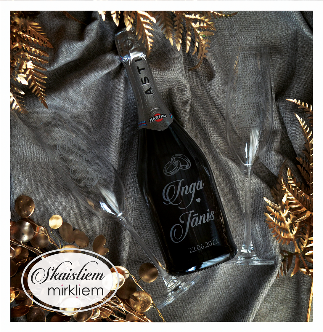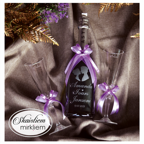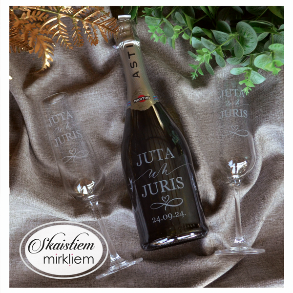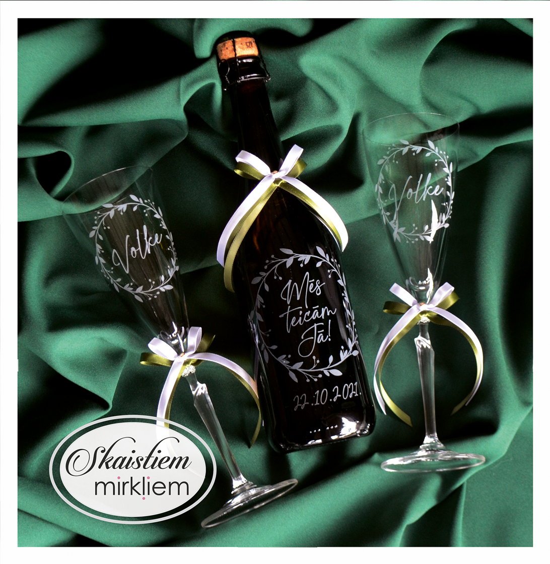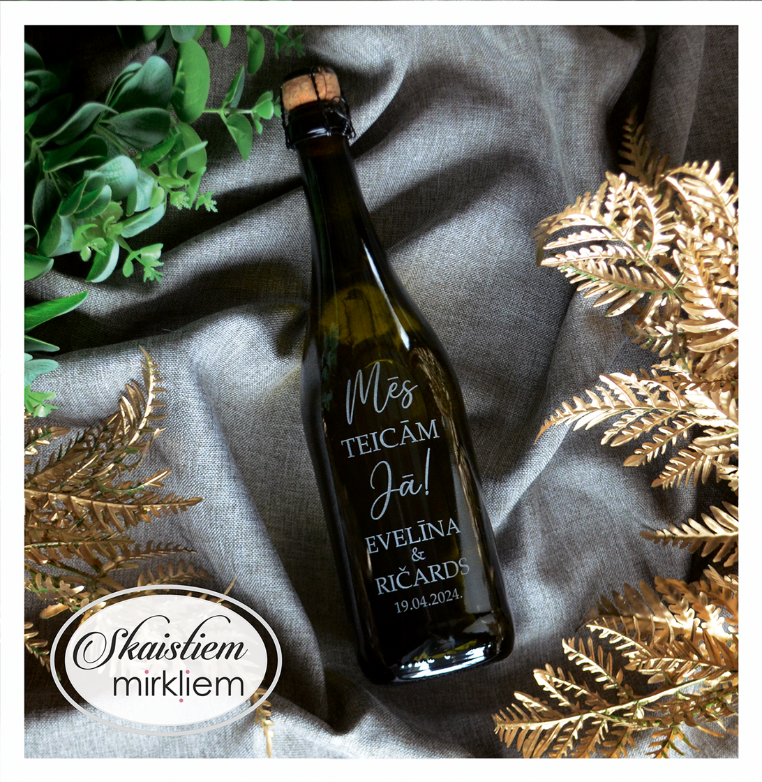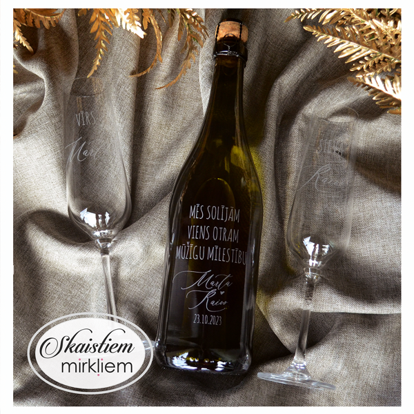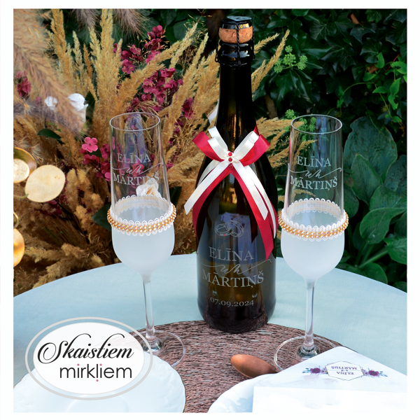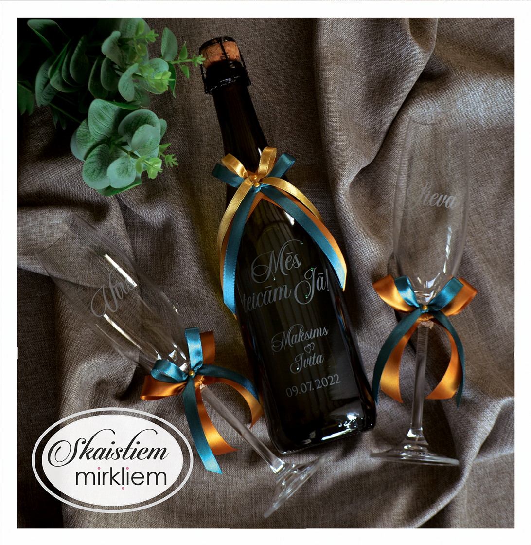 Saskaņotība: Ja pasūtāt pie mums arī citas kāzu lietas, mēs saskaņosim pudeles gravējuma fontu un stilistiku ar pārējo pasūtījumu.