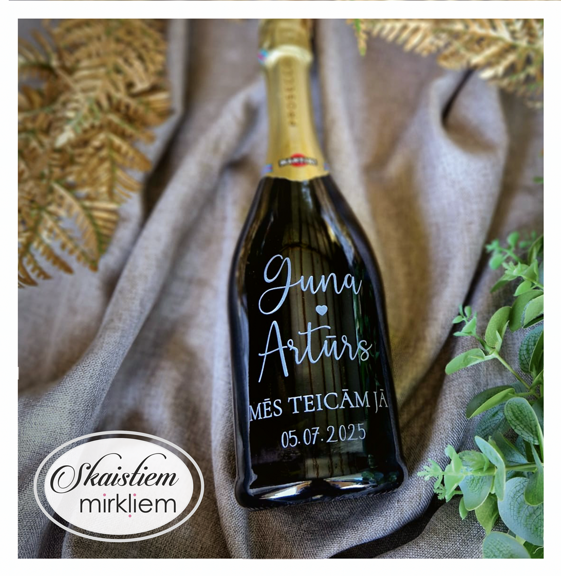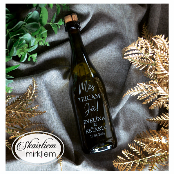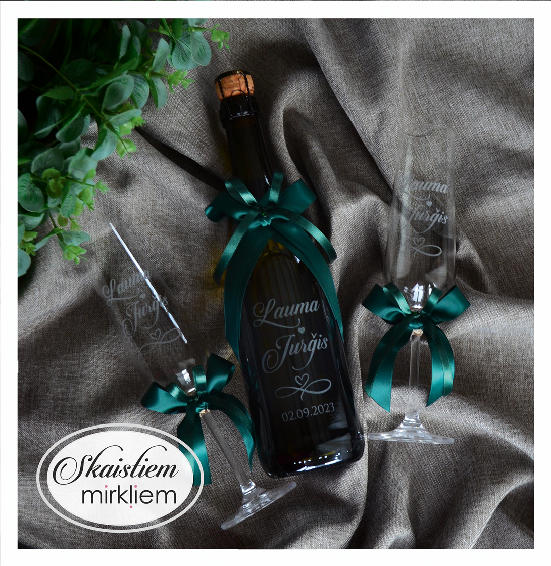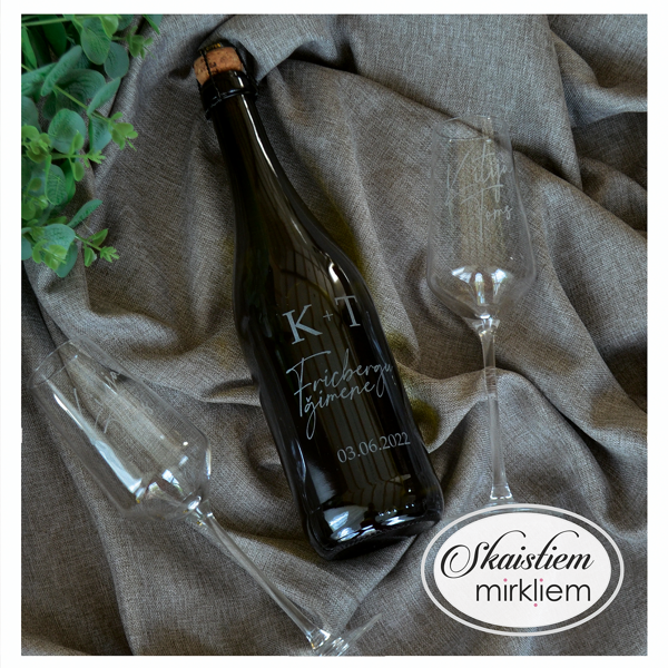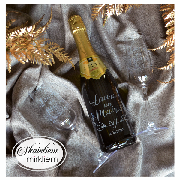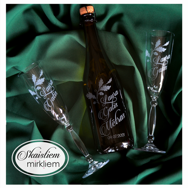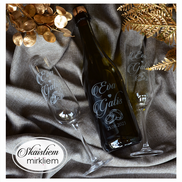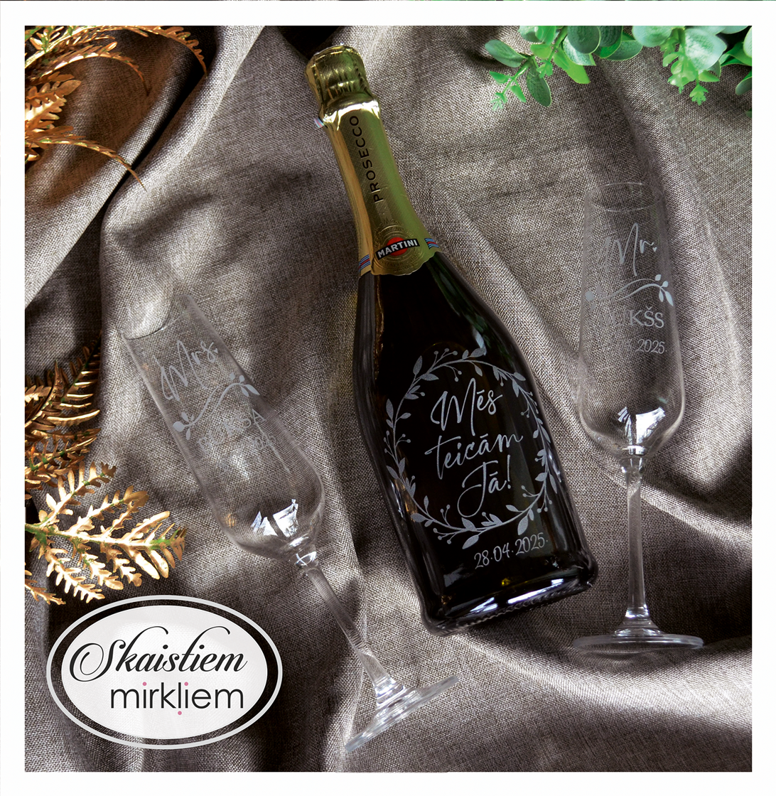 Saskaņotība: Ja pasūtāt pie mums arī citas kāzu lietas, mēs saskaņosim pudeles gravējuma fontu un stilistiku ar pārējo pasūtījumu.