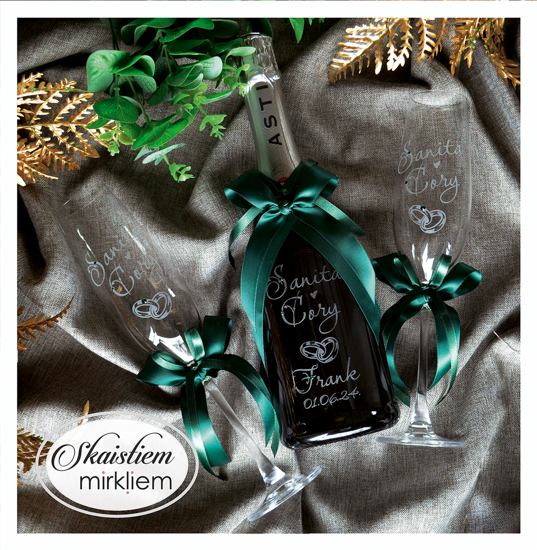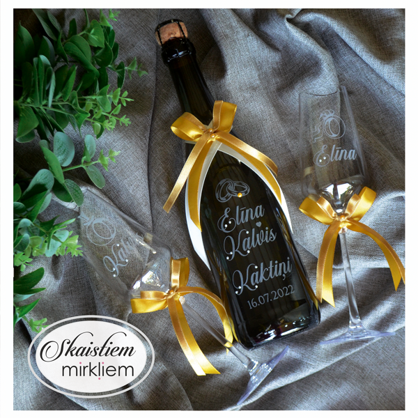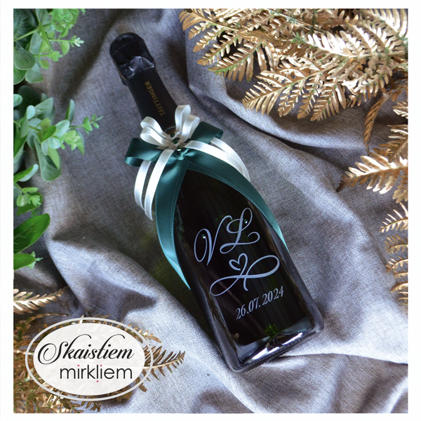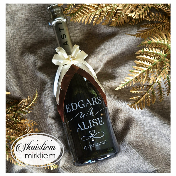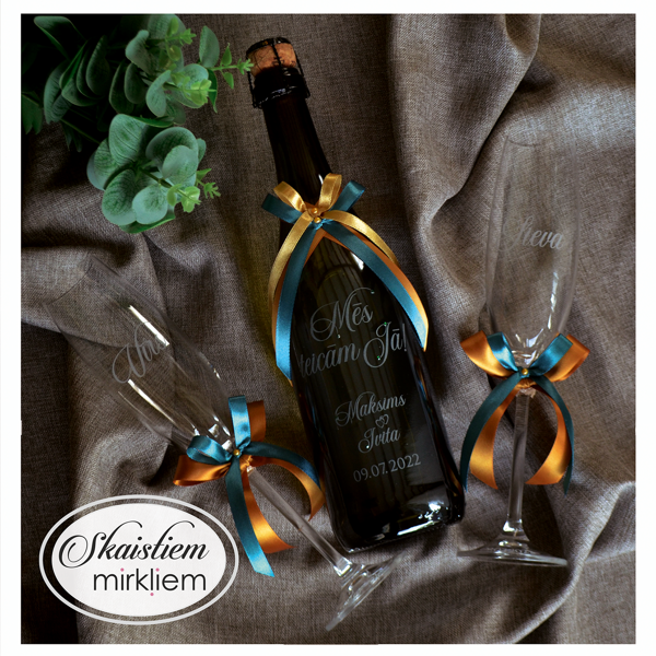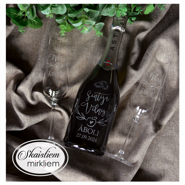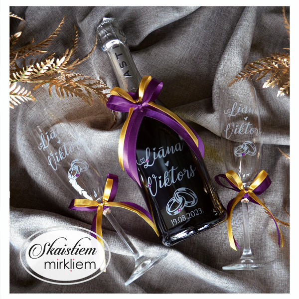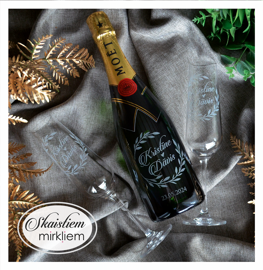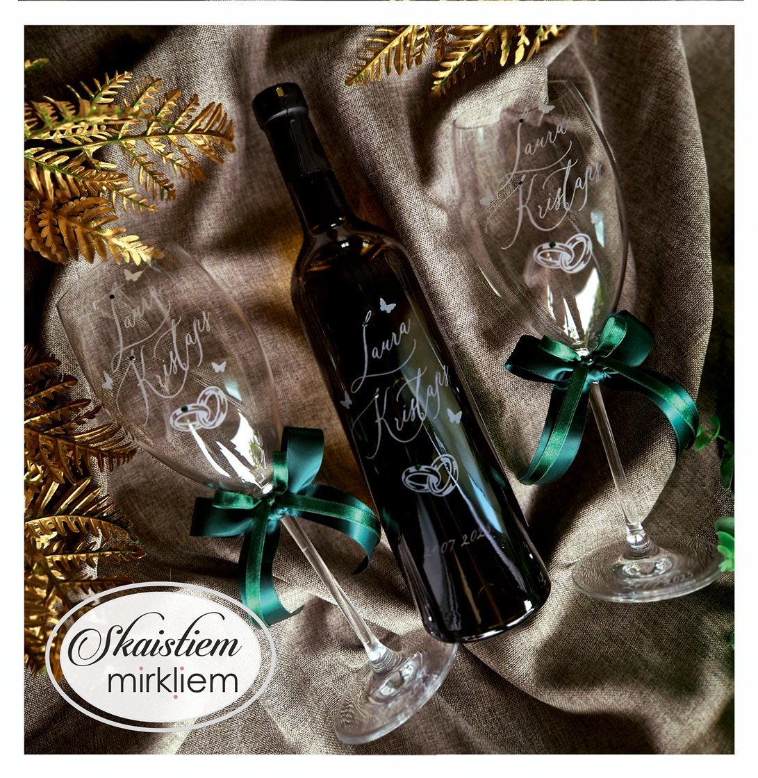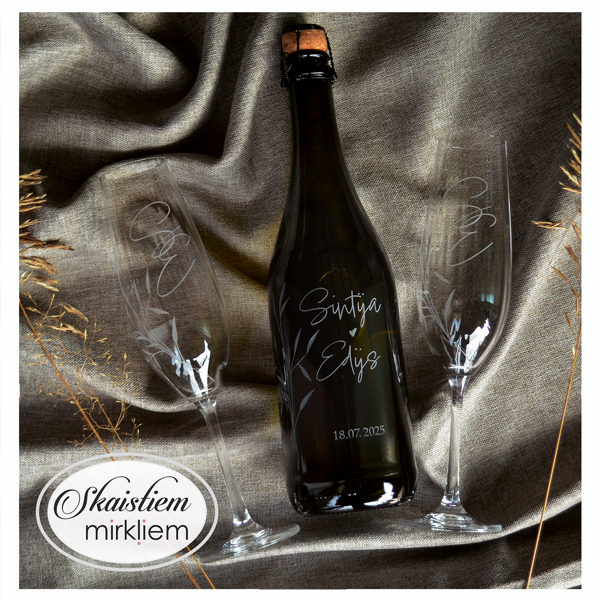 Saskaņotība: Ja pasūtāt pie mums arī citas kāzu lietas, mēs saskaņosim pudeles gravējuma fontu un stilistiku ar pārējo pasūtījumu.