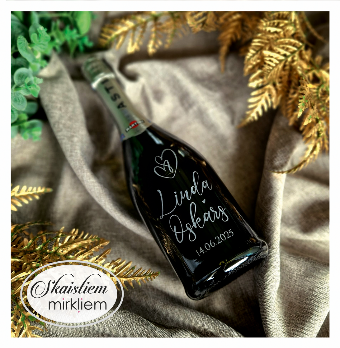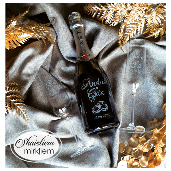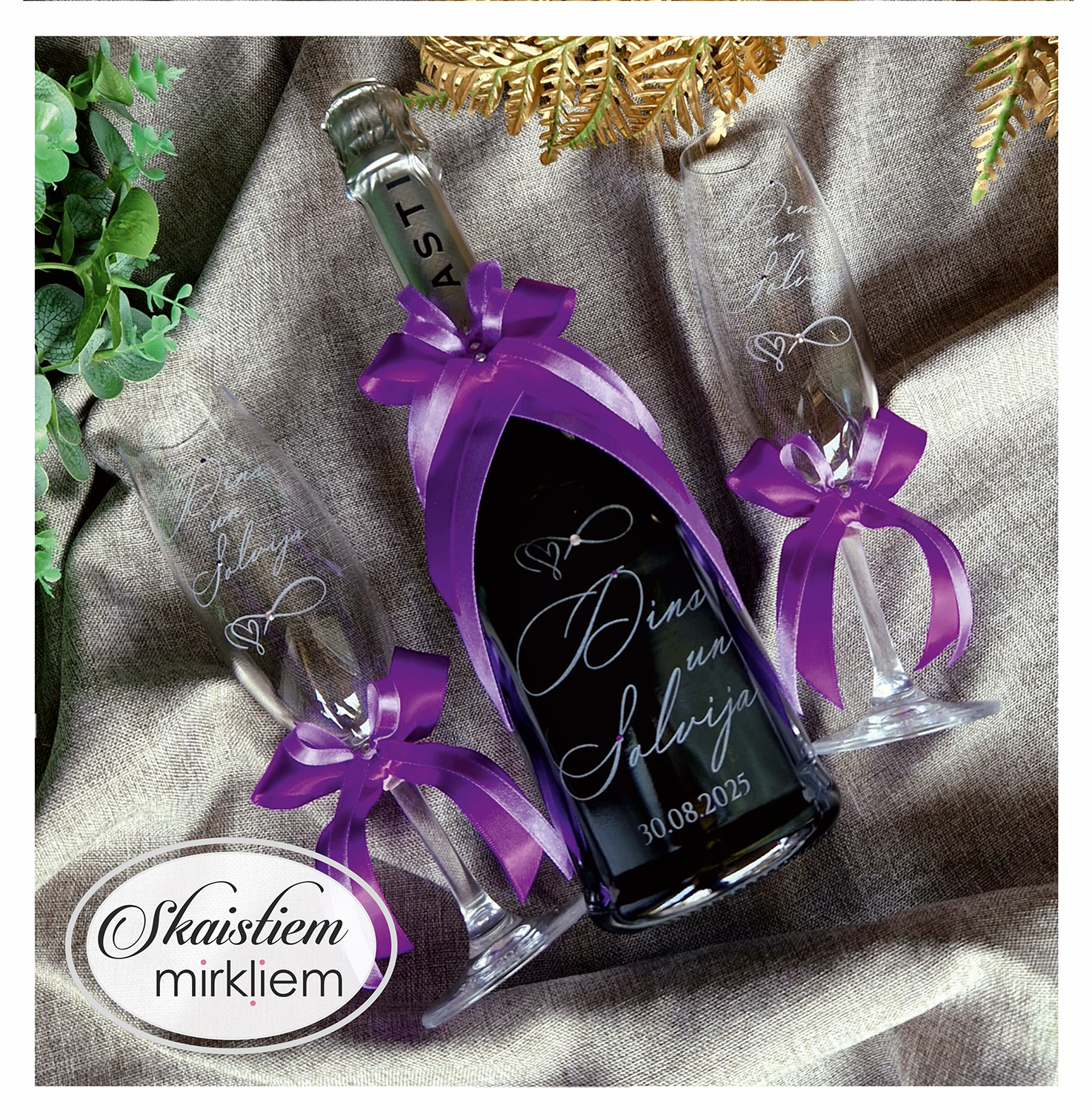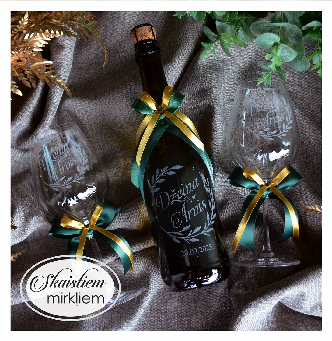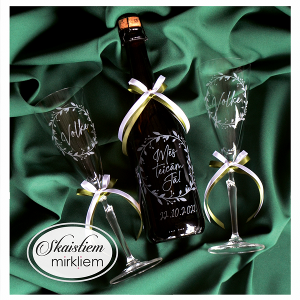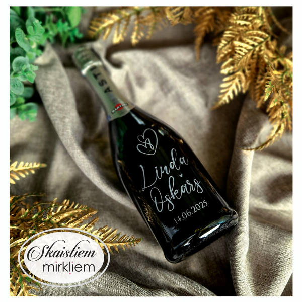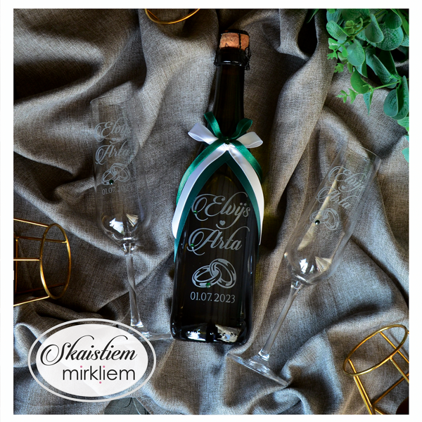 Saskaņotība: Ja pasūtāt pie mums arī citas kāzu lietas, mēs saskaņosim pudeles gravējuma fontu un stilistiku ar pārējo pasūtījumu.
