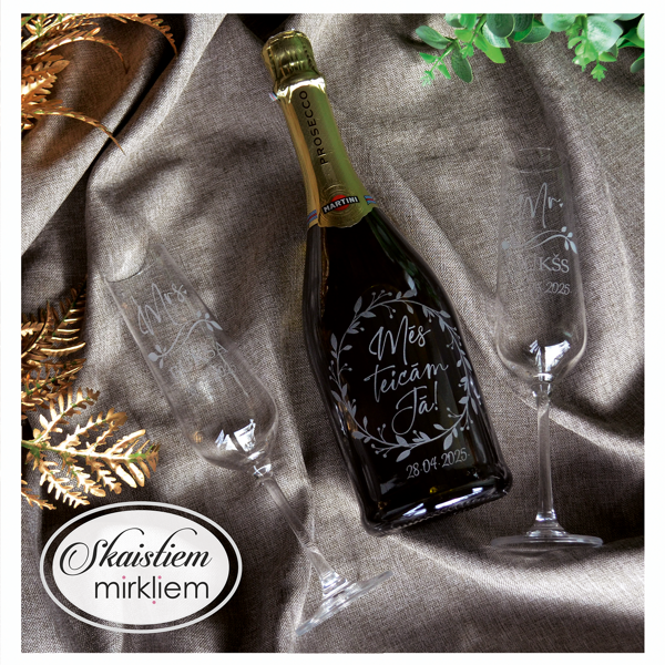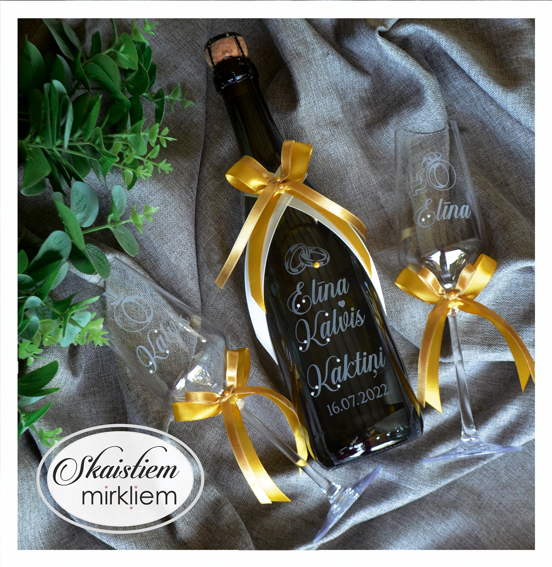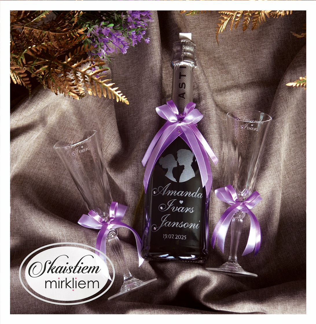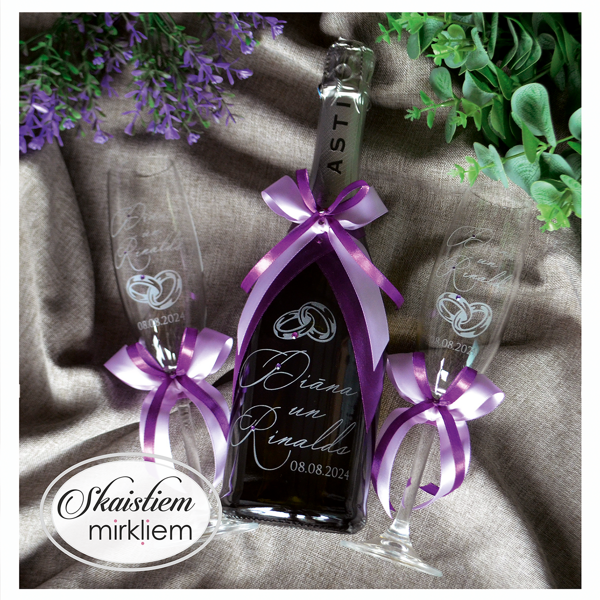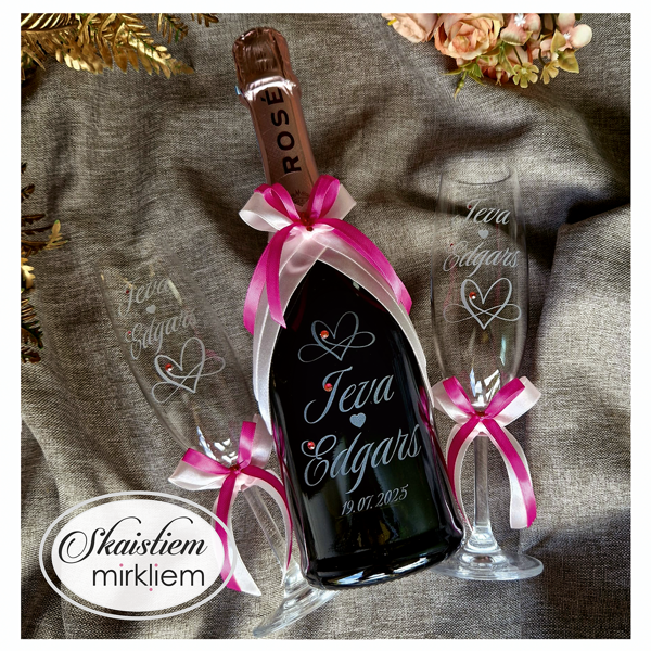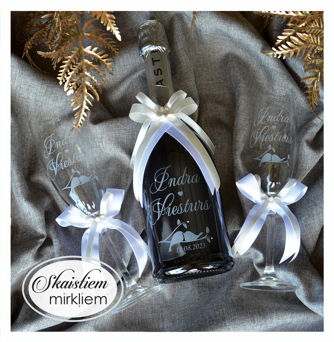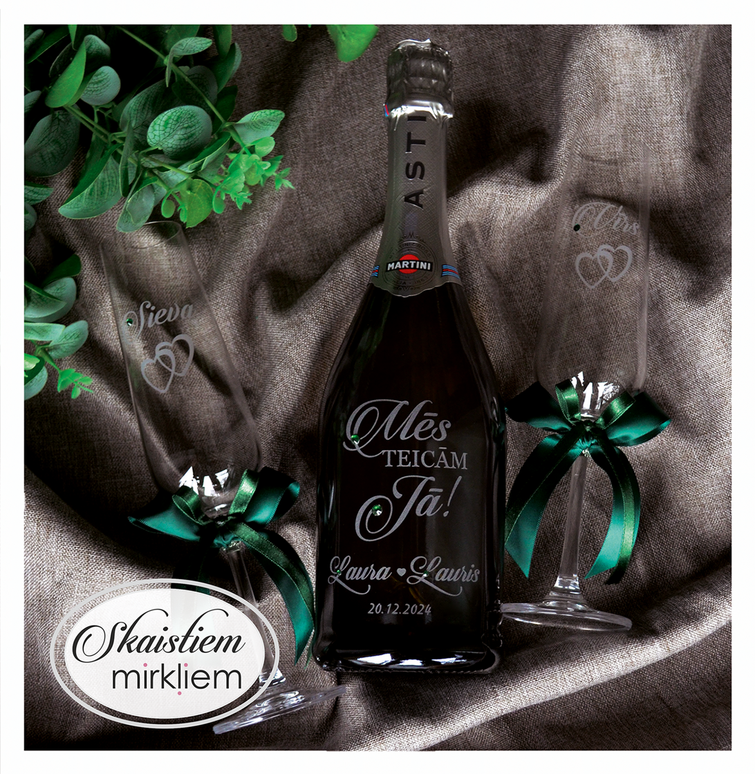 Saskaņotība: Ja pasūtāt pie mums arī citas kāzu lietas, mēs saskaņosim pudeles gravējuma fontu un stilistiku ar pārējo pasūtījumu.