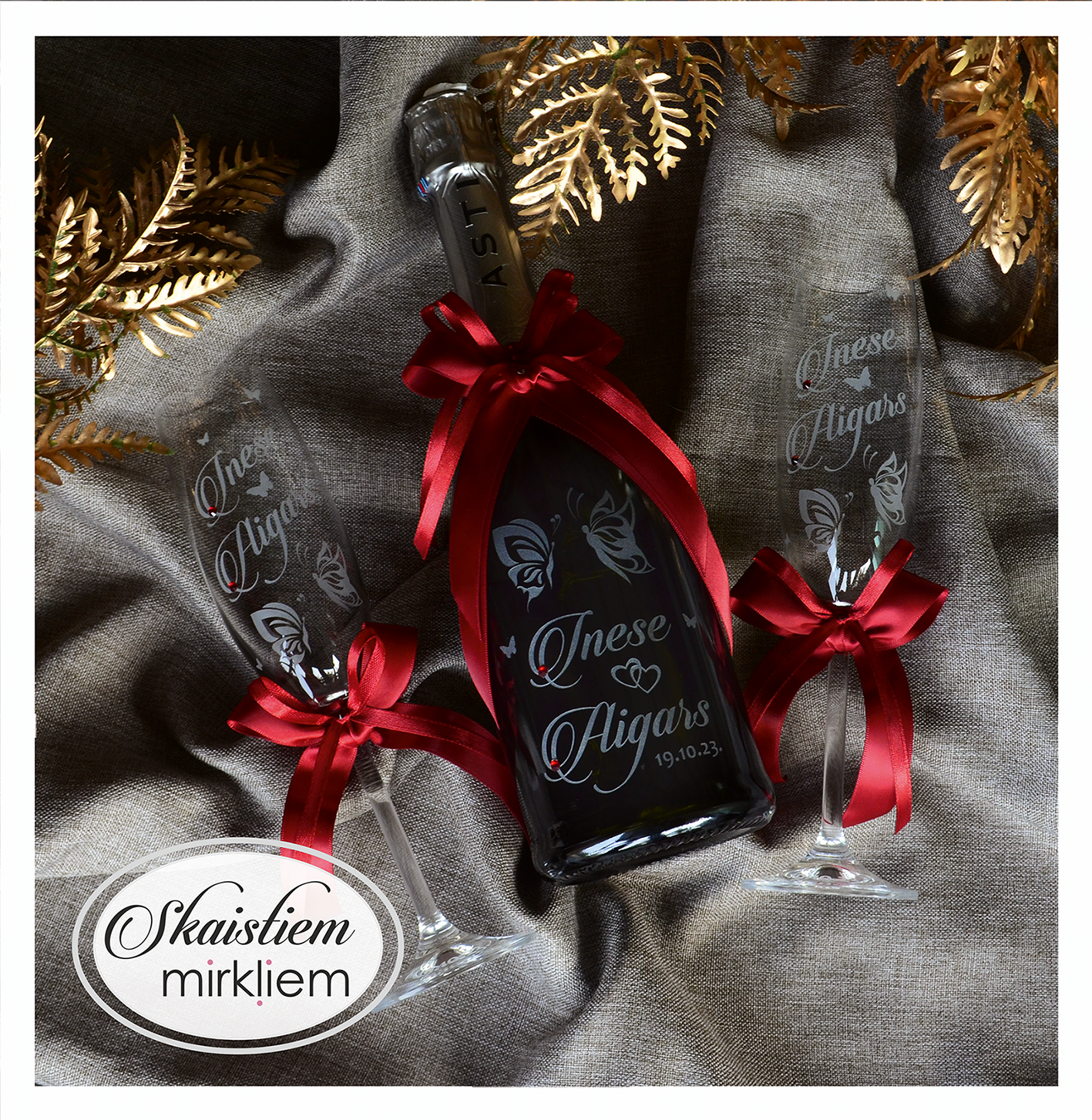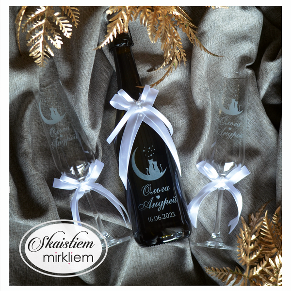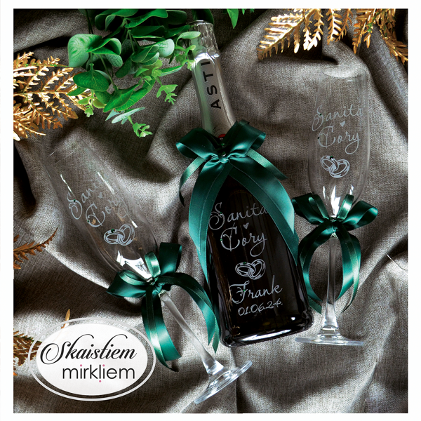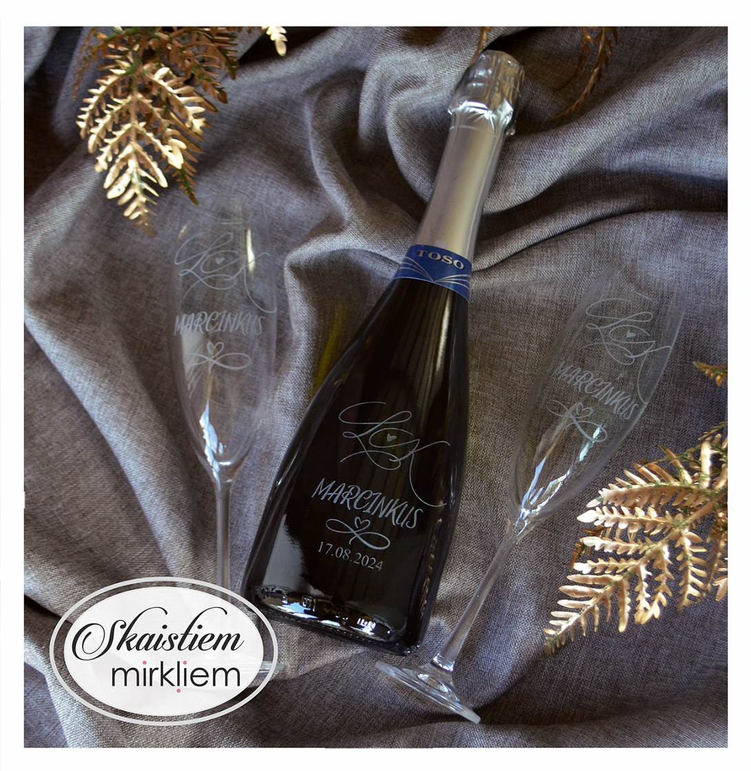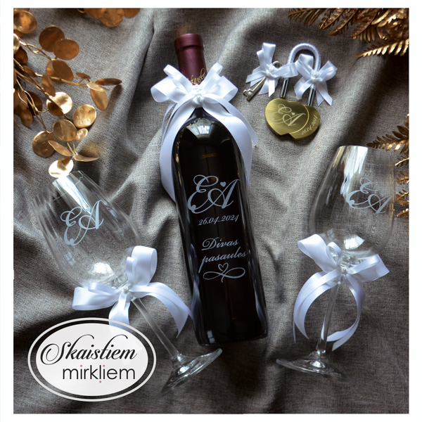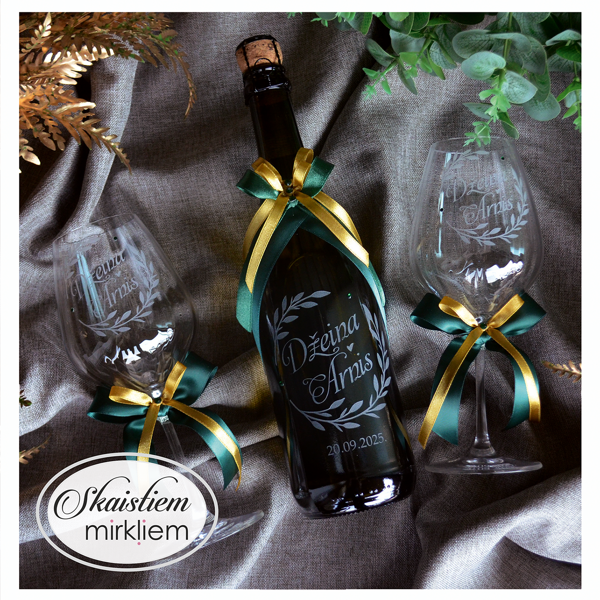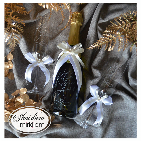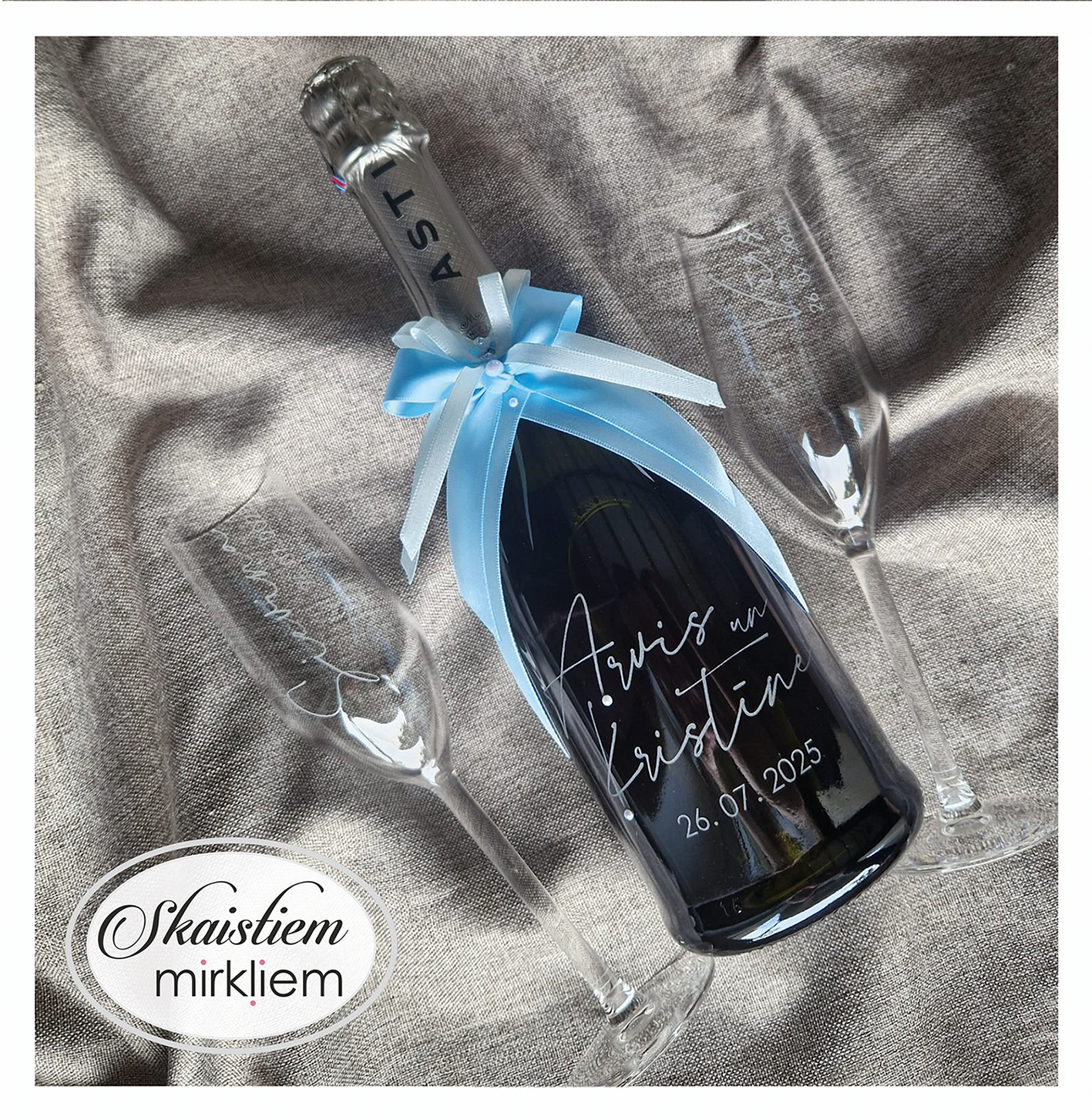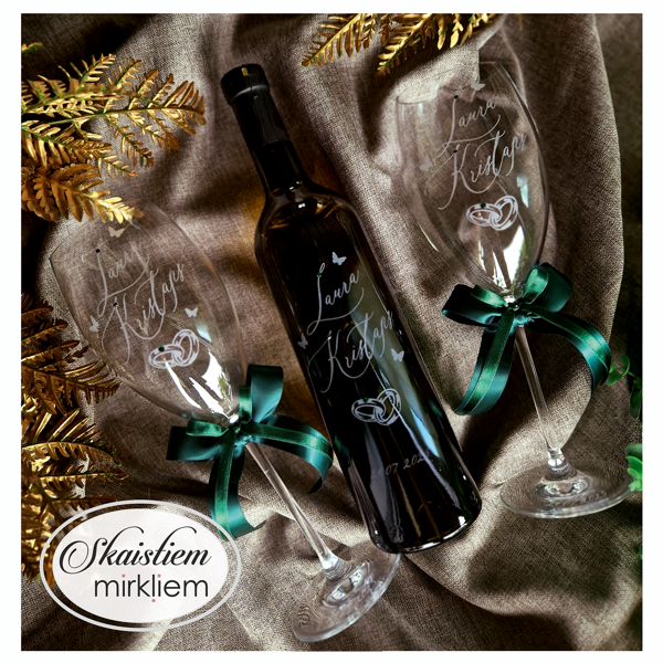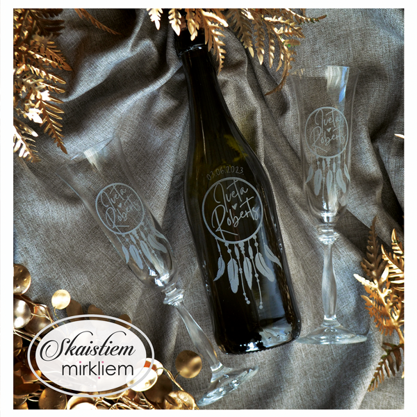 Saskaņotība: Ja pasūtāt pie mums arī citas kāzu lietas, mēs saskaņosim pudeles gravējuma fontu un stilistiku ar pārējo pasūtījumu.