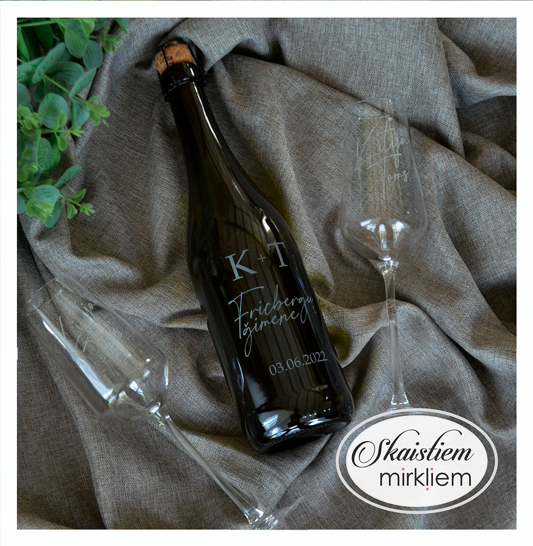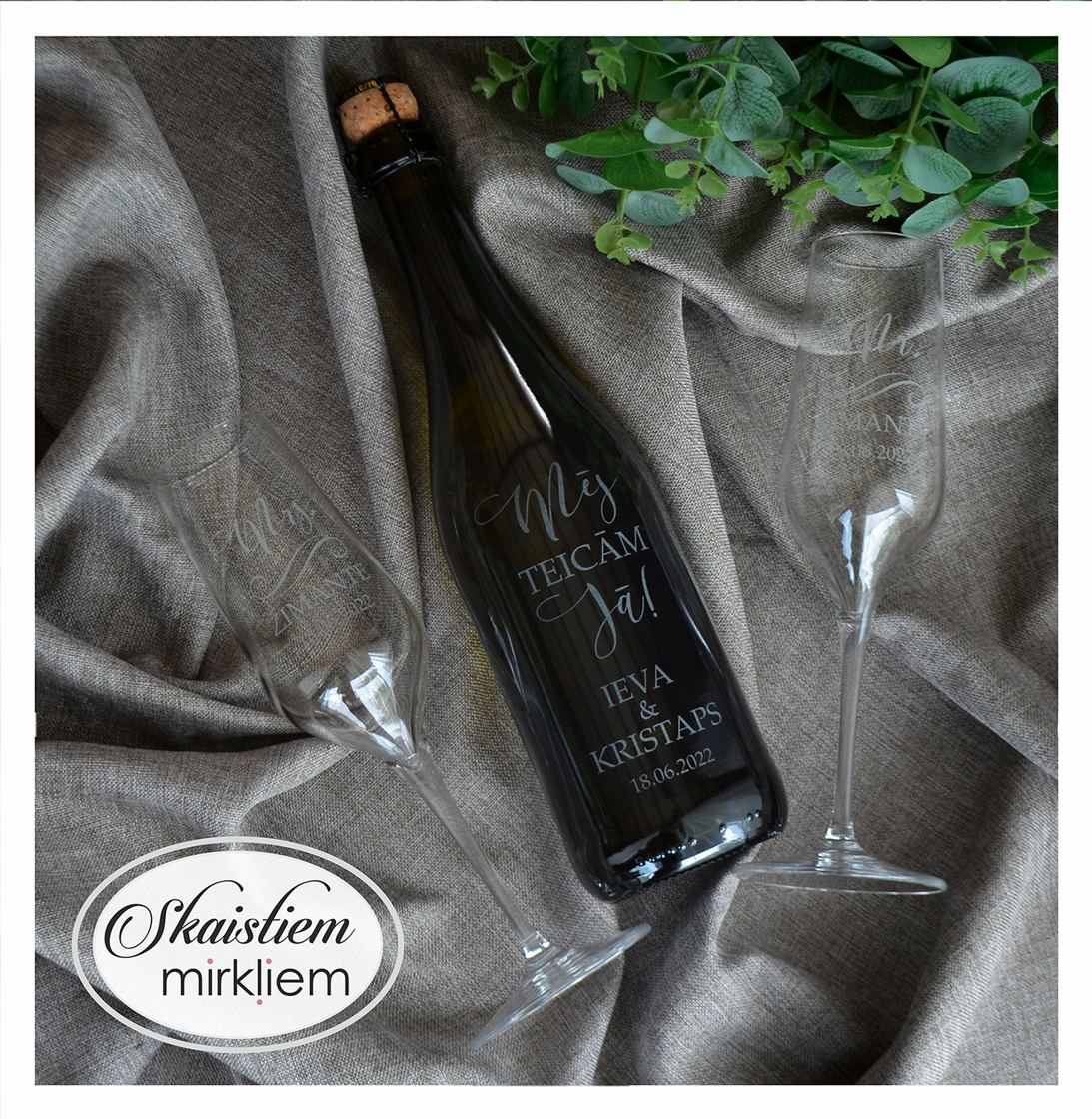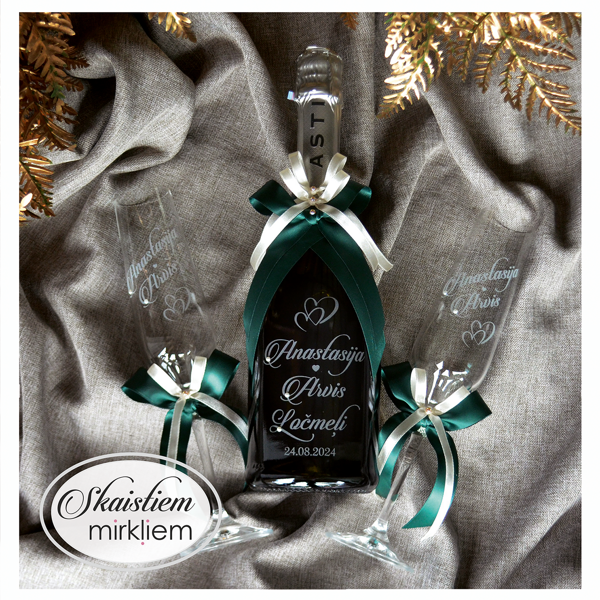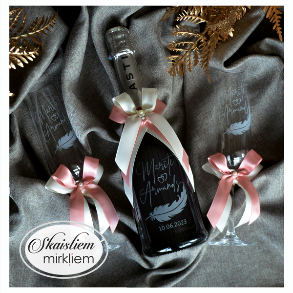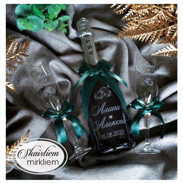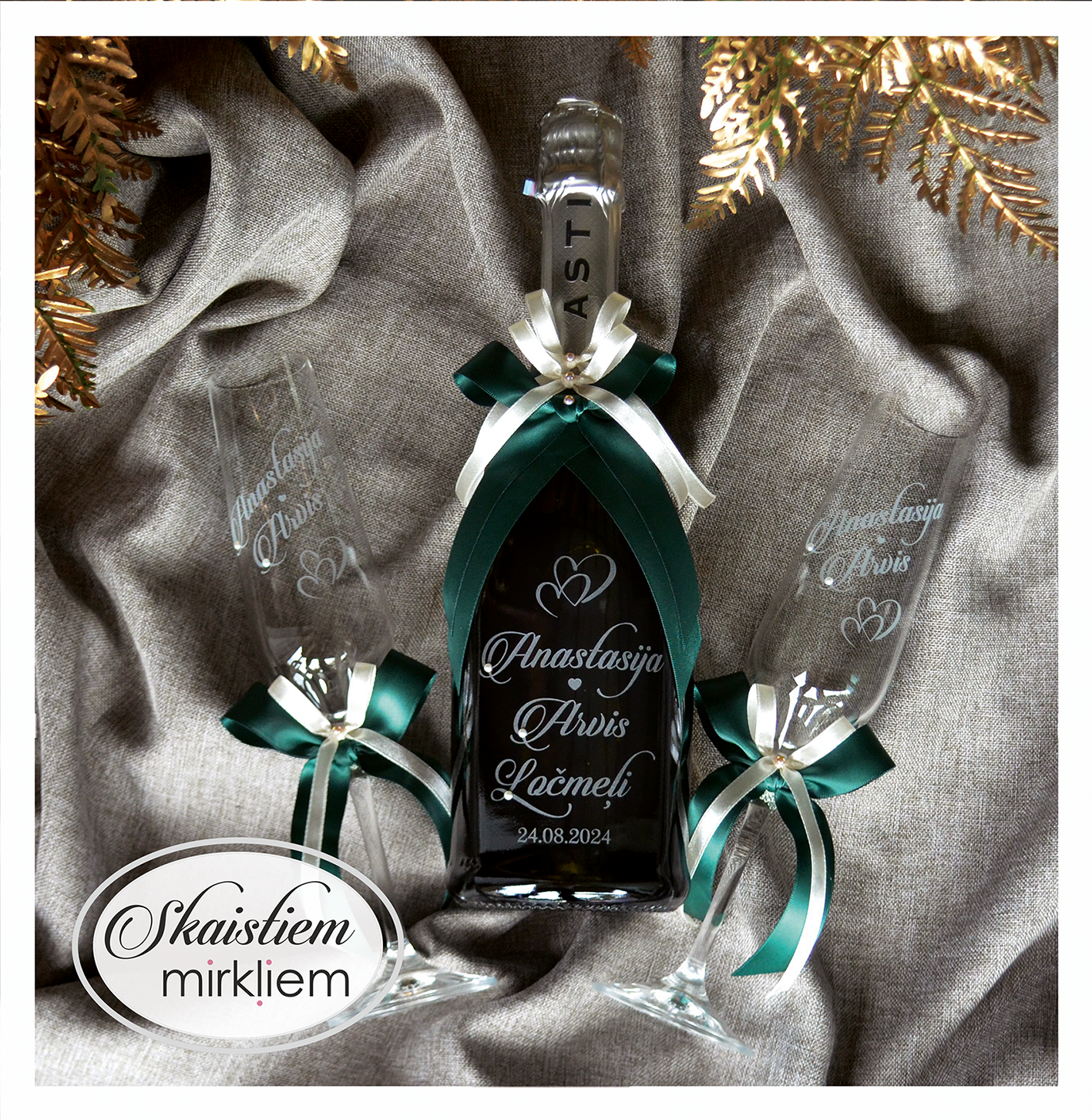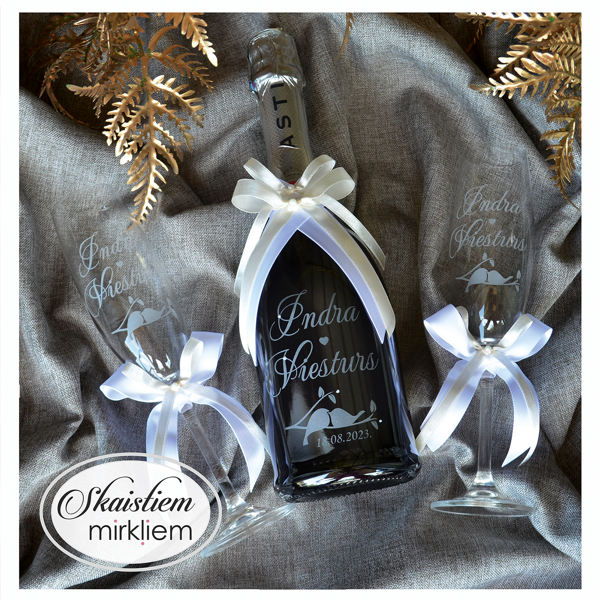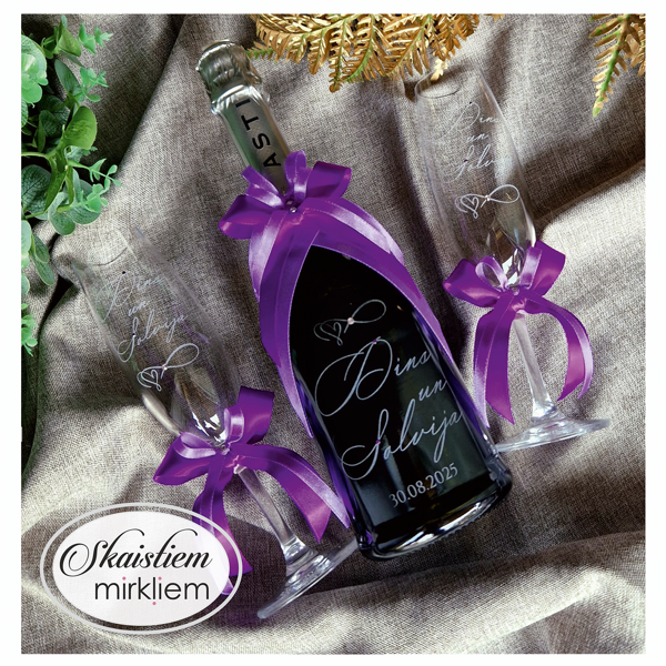 Saskaņotība: Ja pasūtāt pie mums arī citas kāzu lietas, mēs saskaņosim pudeles gravējuma fontu un stilistiku ar pārējo pasūtījumu.