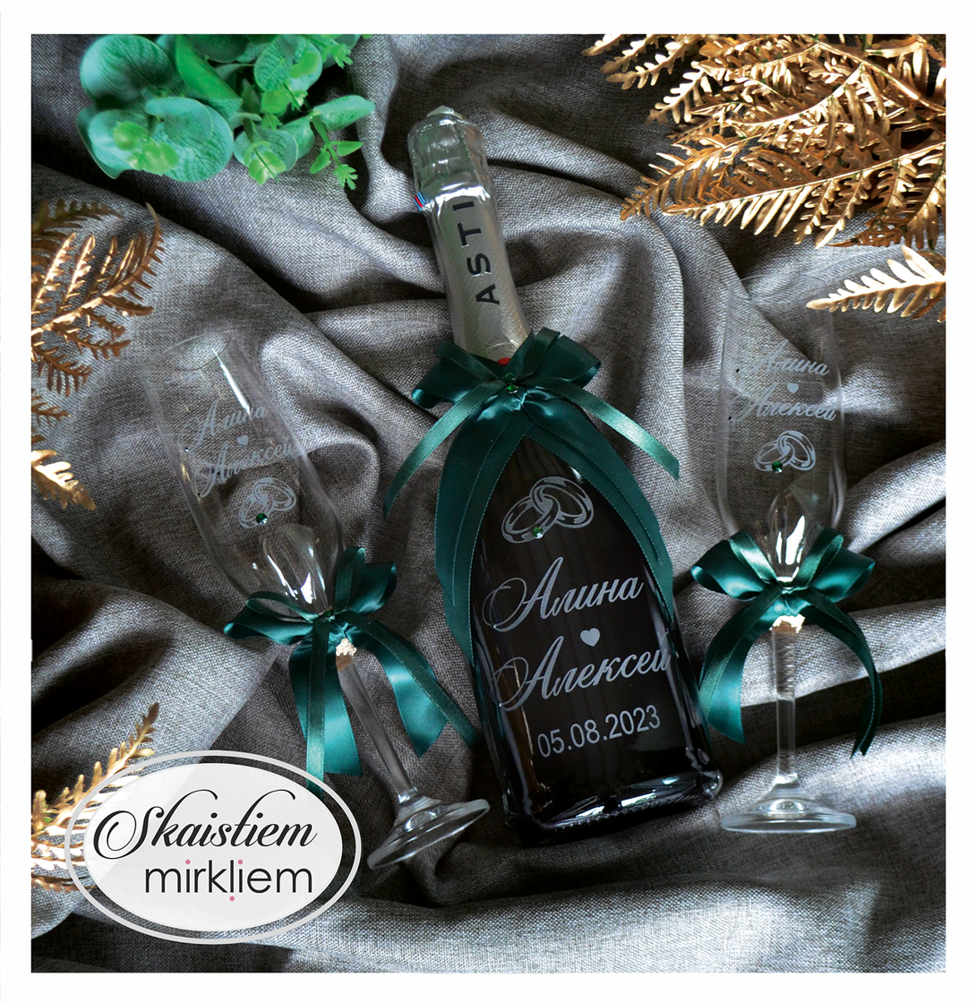 Mēs piedāvājam izsmalcinātu kāzu pudeļu gravēšanu: