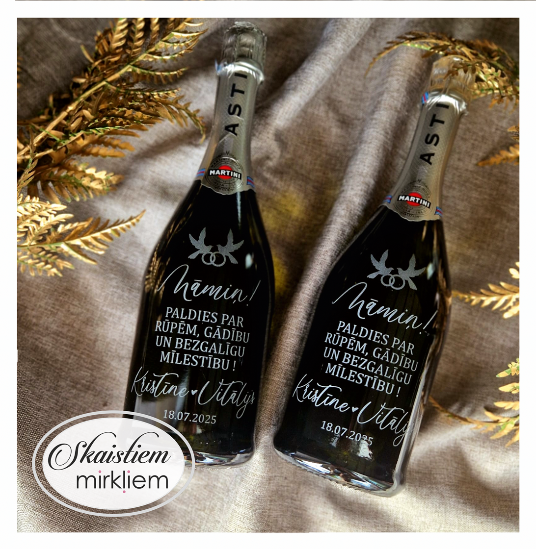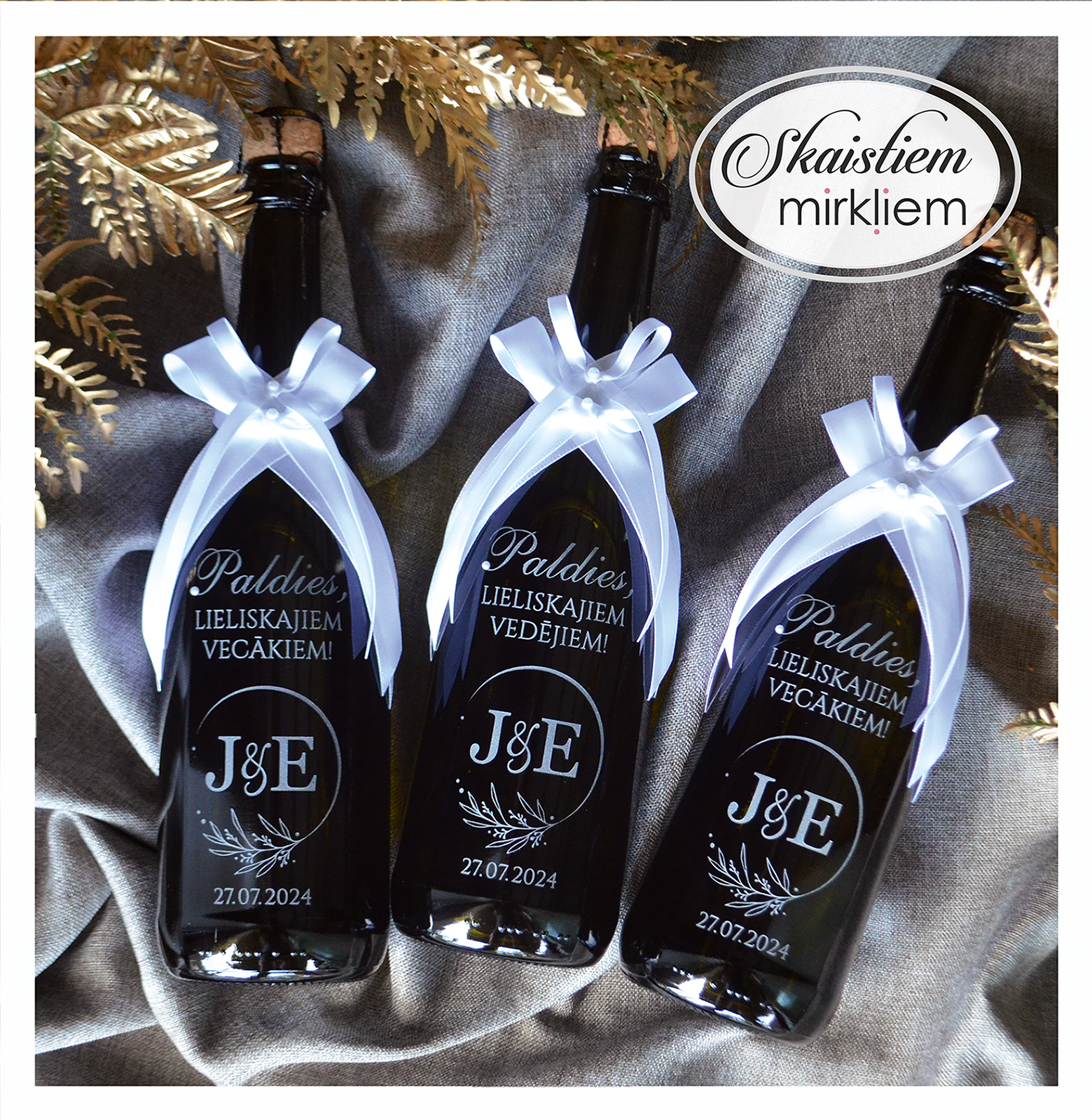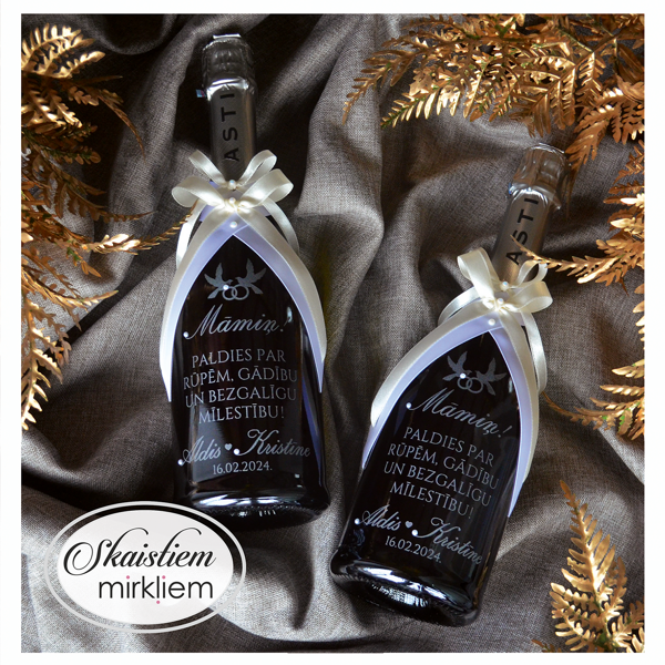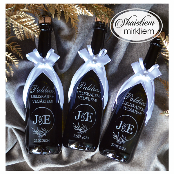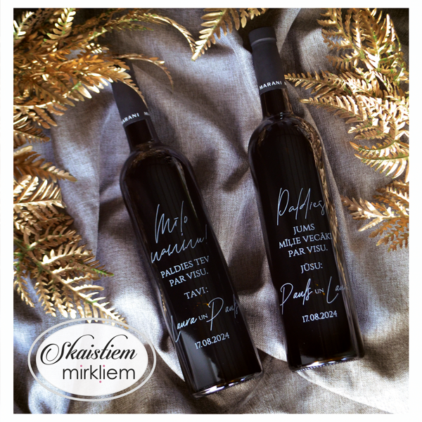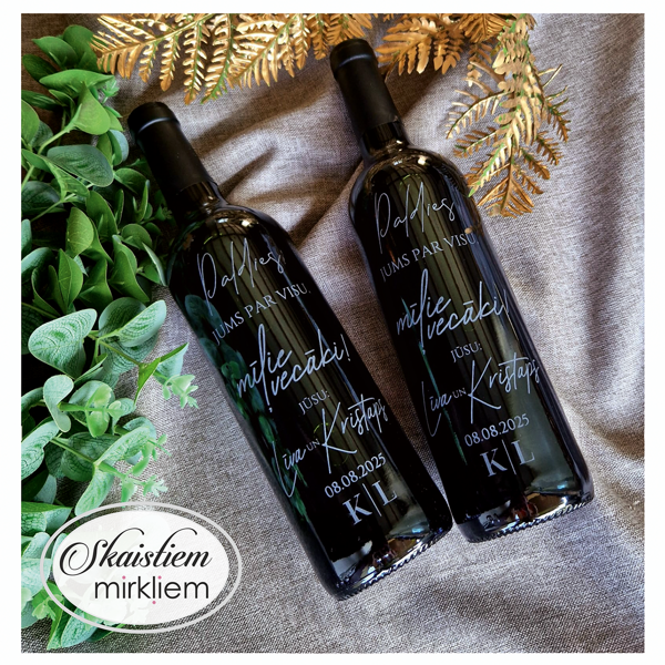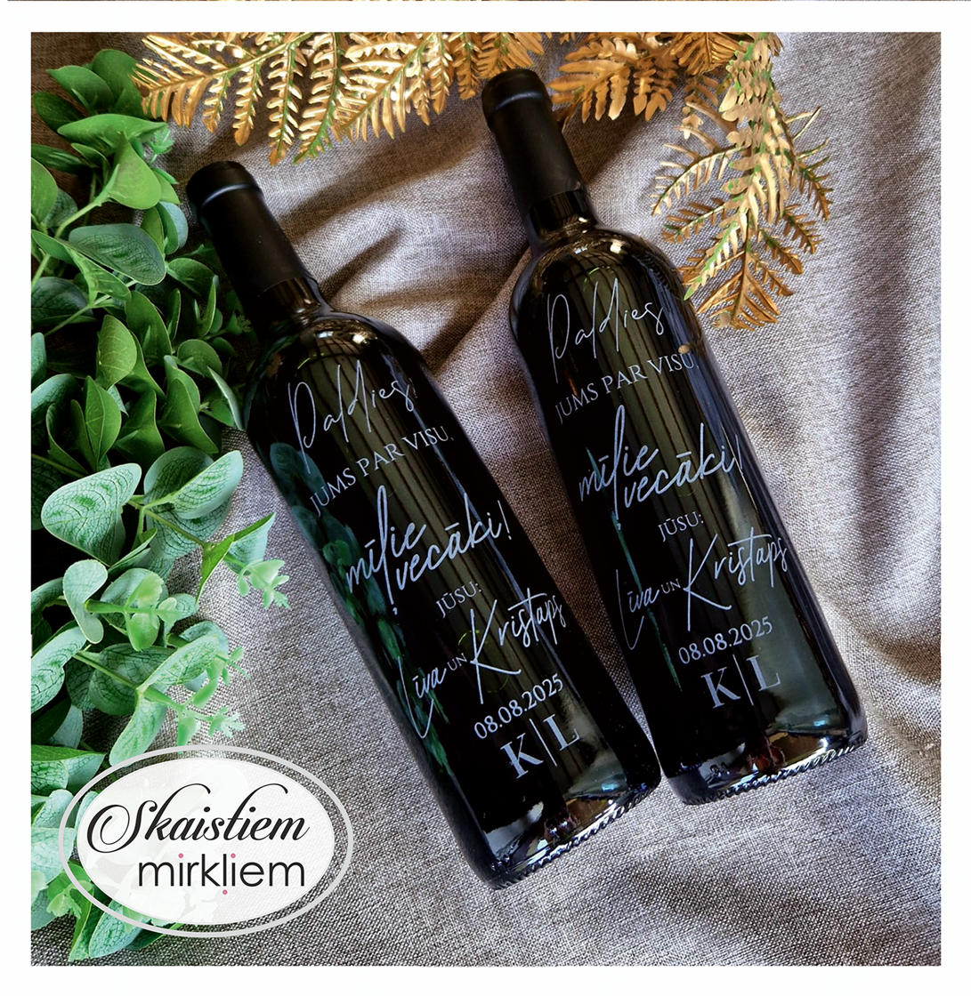 Saskaņotība: Ja pasūtāt pie mums arī citas kāzu lietas, mēs saskaņosim pudeles gravējuma fontu un stilistiku ar pārējo pasūtījumu.