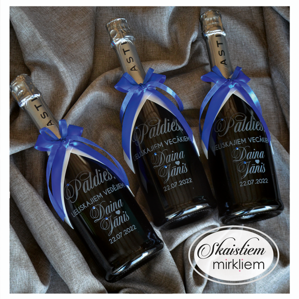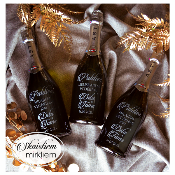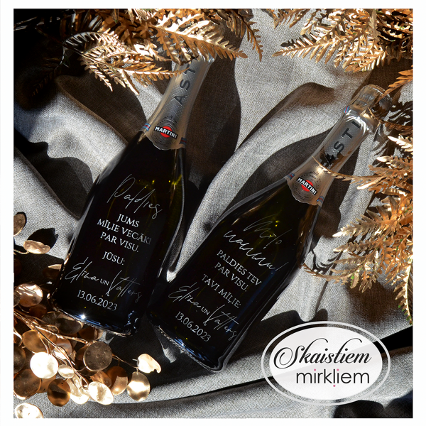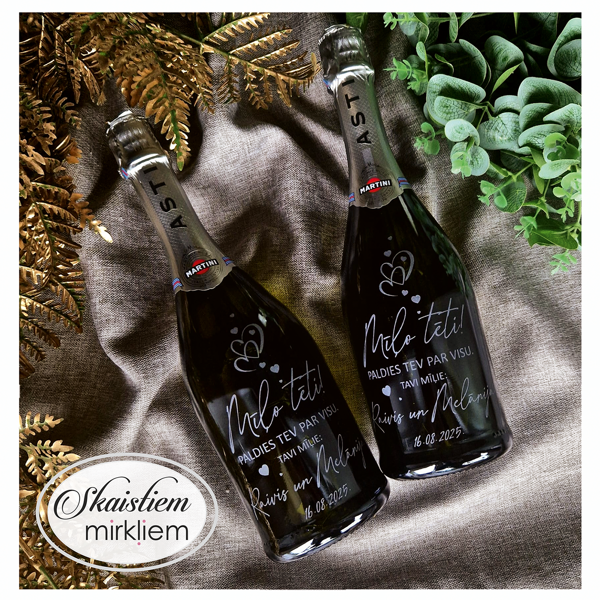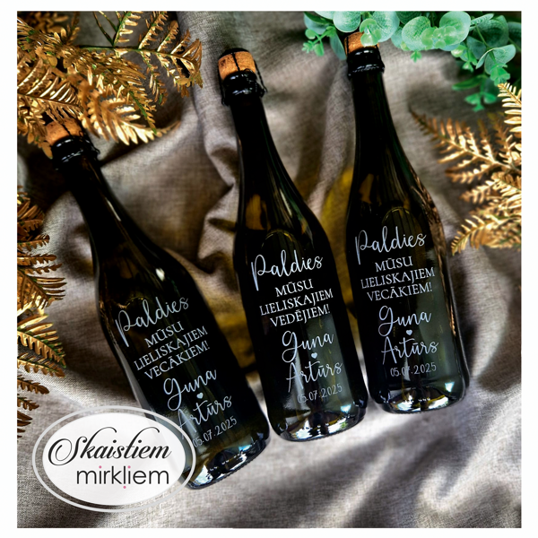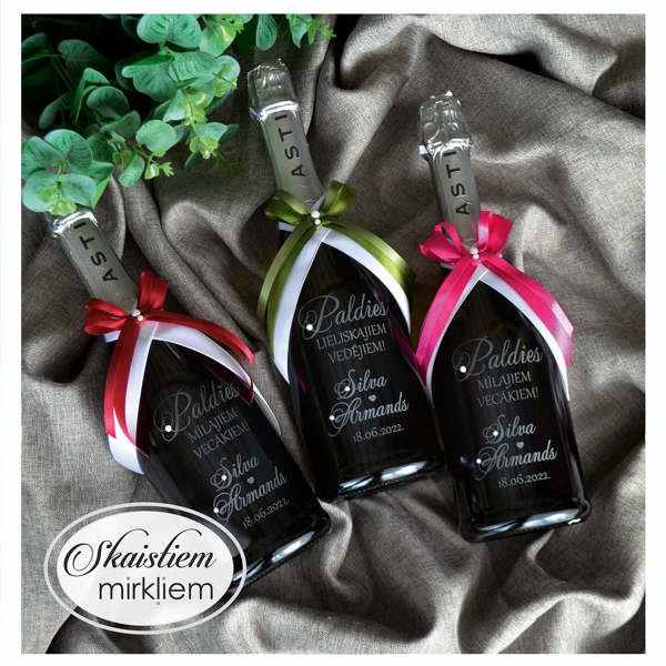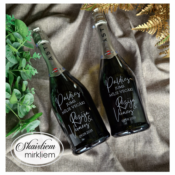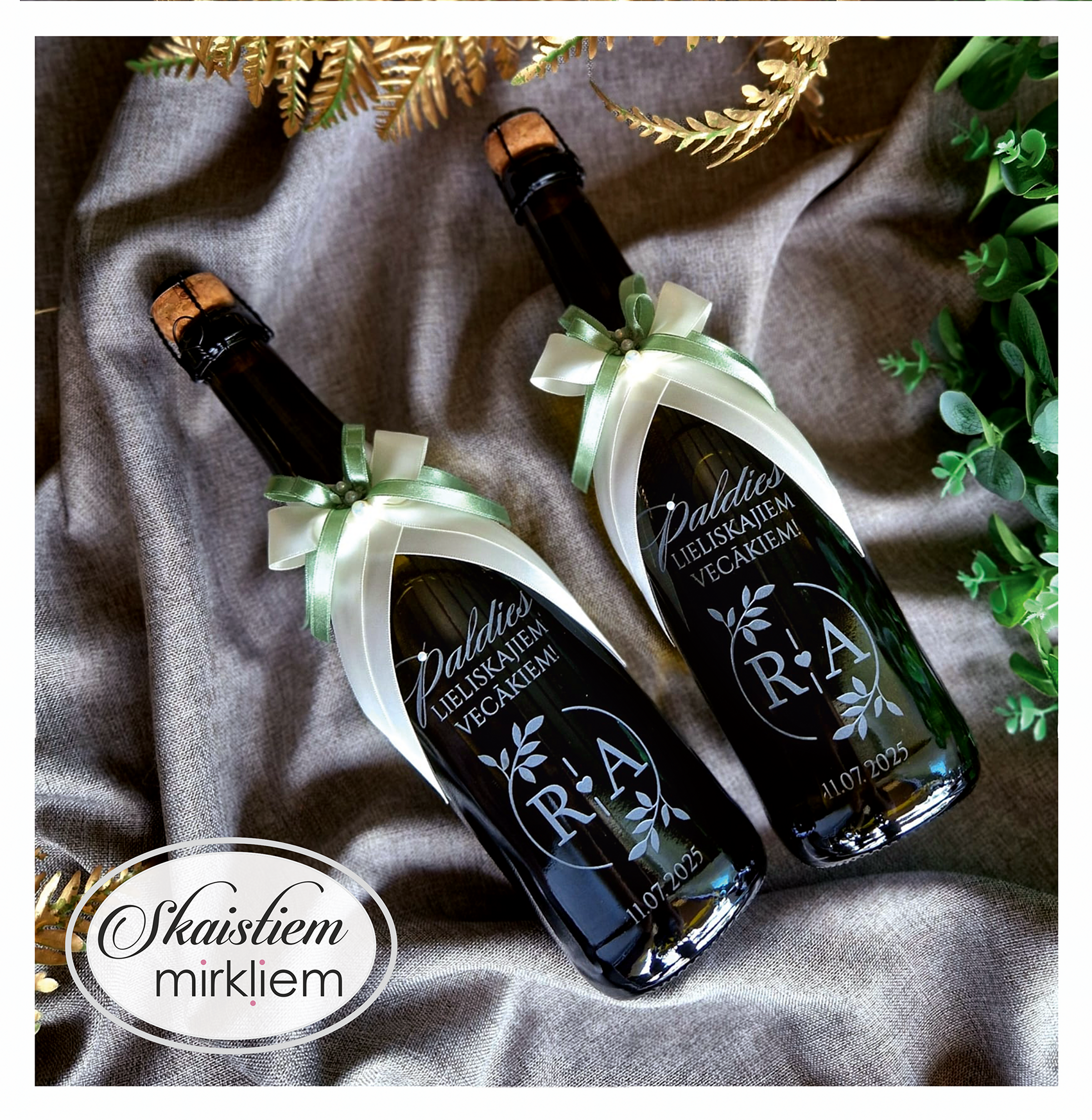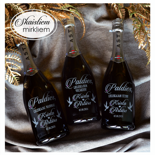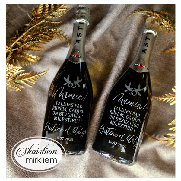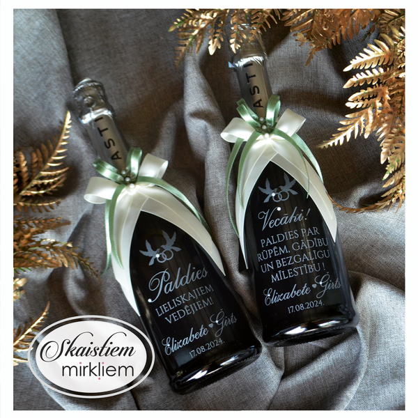 Saskaņotība: Ja pasūtāt pie mums arī citas kāzu lietas, mēs saskaņosim pudeles gravējuma fontu un stilistiku ar pārējo pasūtījumu.