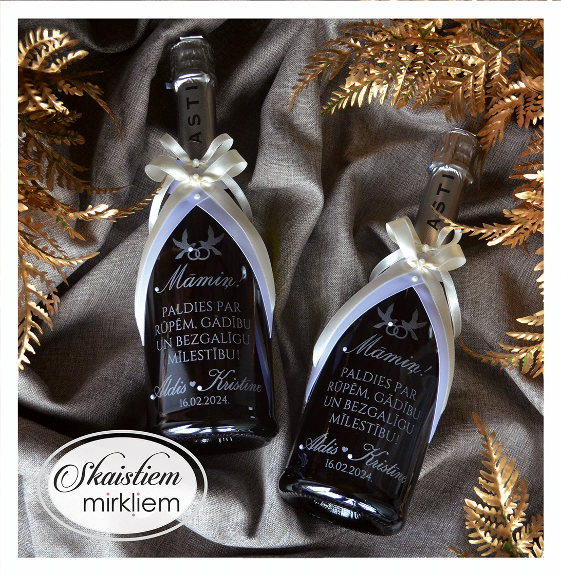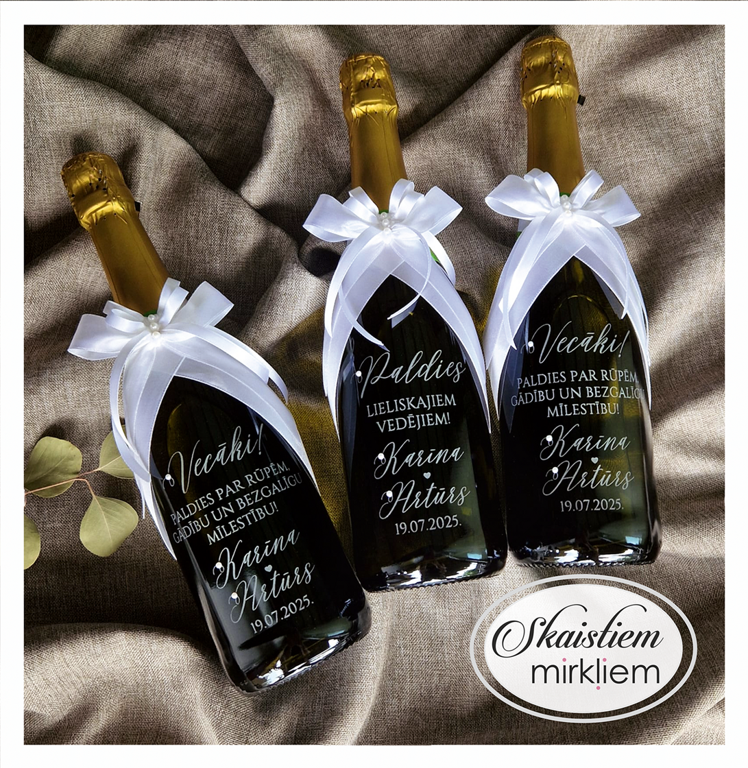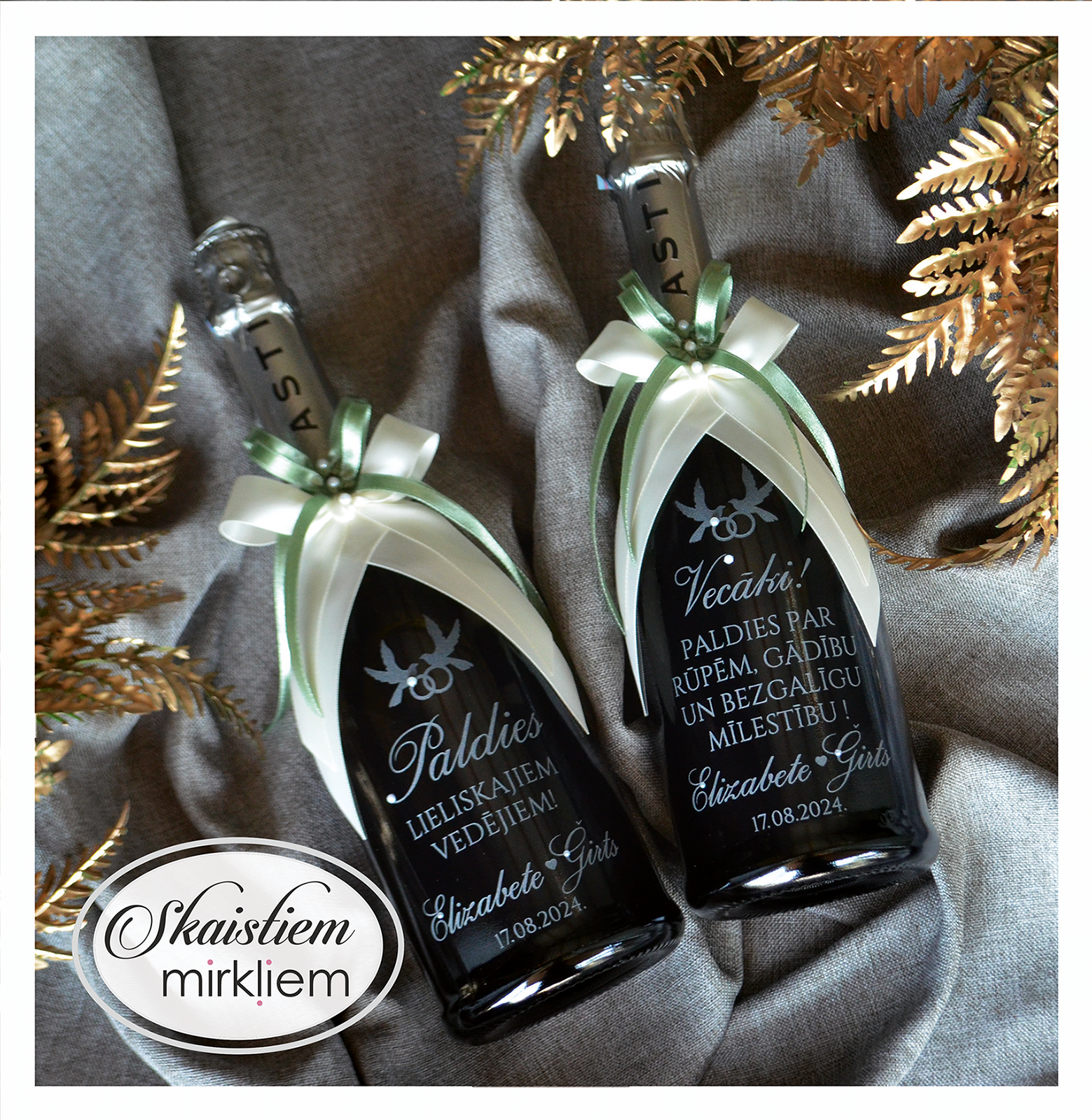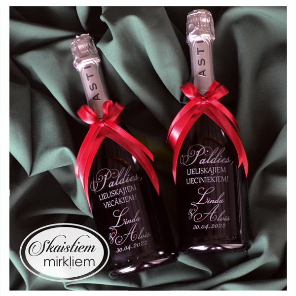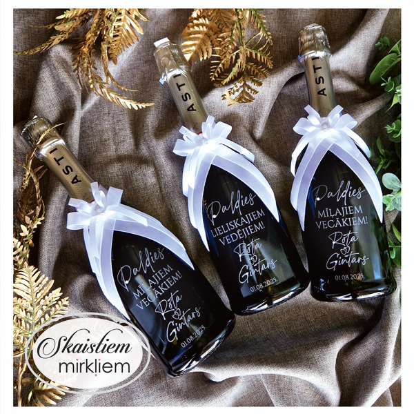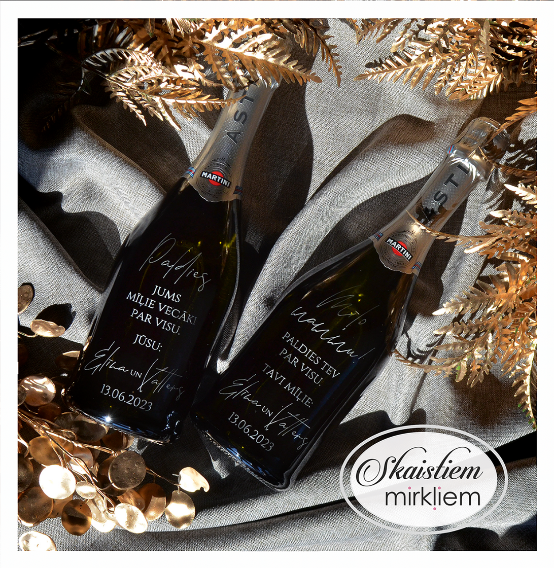 Saskaņotība: Ja pasūtāt pie mums arī citas kāzu lietas, mēs saskaņosim pudeles gravējuma fontu un stilistiku ar pārējo pasūtījumu.