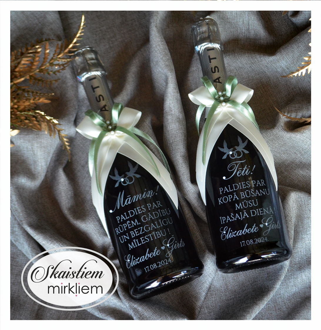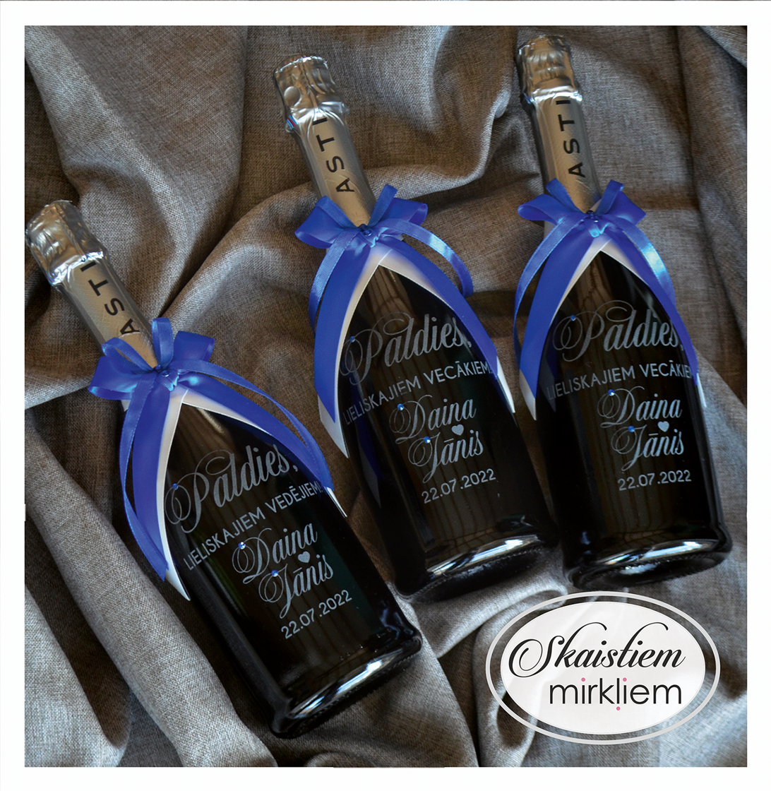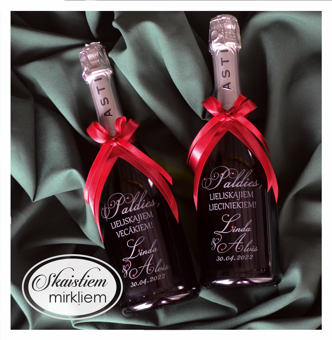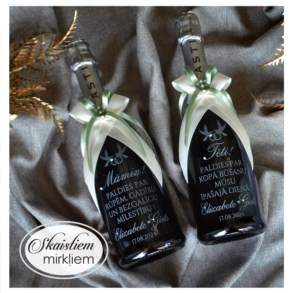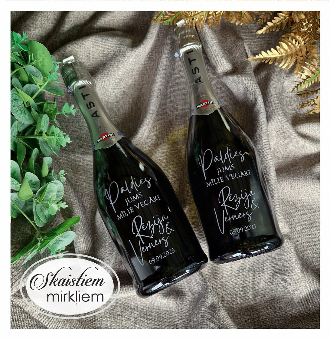 Saskaņotība: Ja pasūtāt pie mums arī citas kāzu lietas, mēs saskaņosim pudeles gravējuma fontu un stilistiku ar pārējo pasūtījumu.
