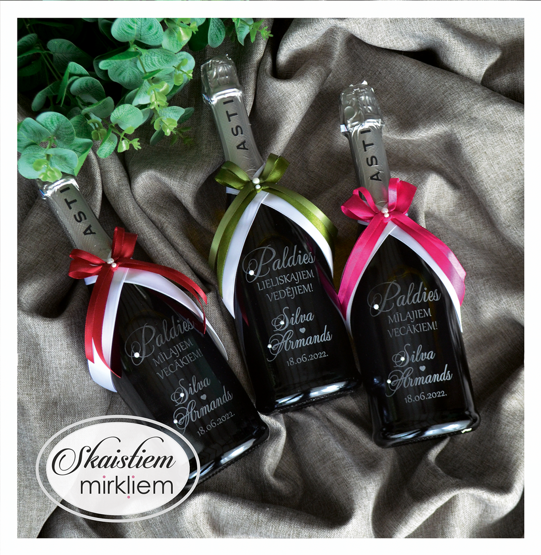 Saskaņots noformējums: Piedāvājam katru pudeli rotāt ar krāšņām satīna lentēm un dekoratīviem akcentiem Jūsu izvēlētajos toņos.