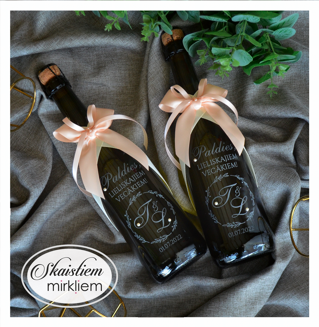 Mēs piedāvājam izsmalcinātu kāzu pudeļu gravēšanu: