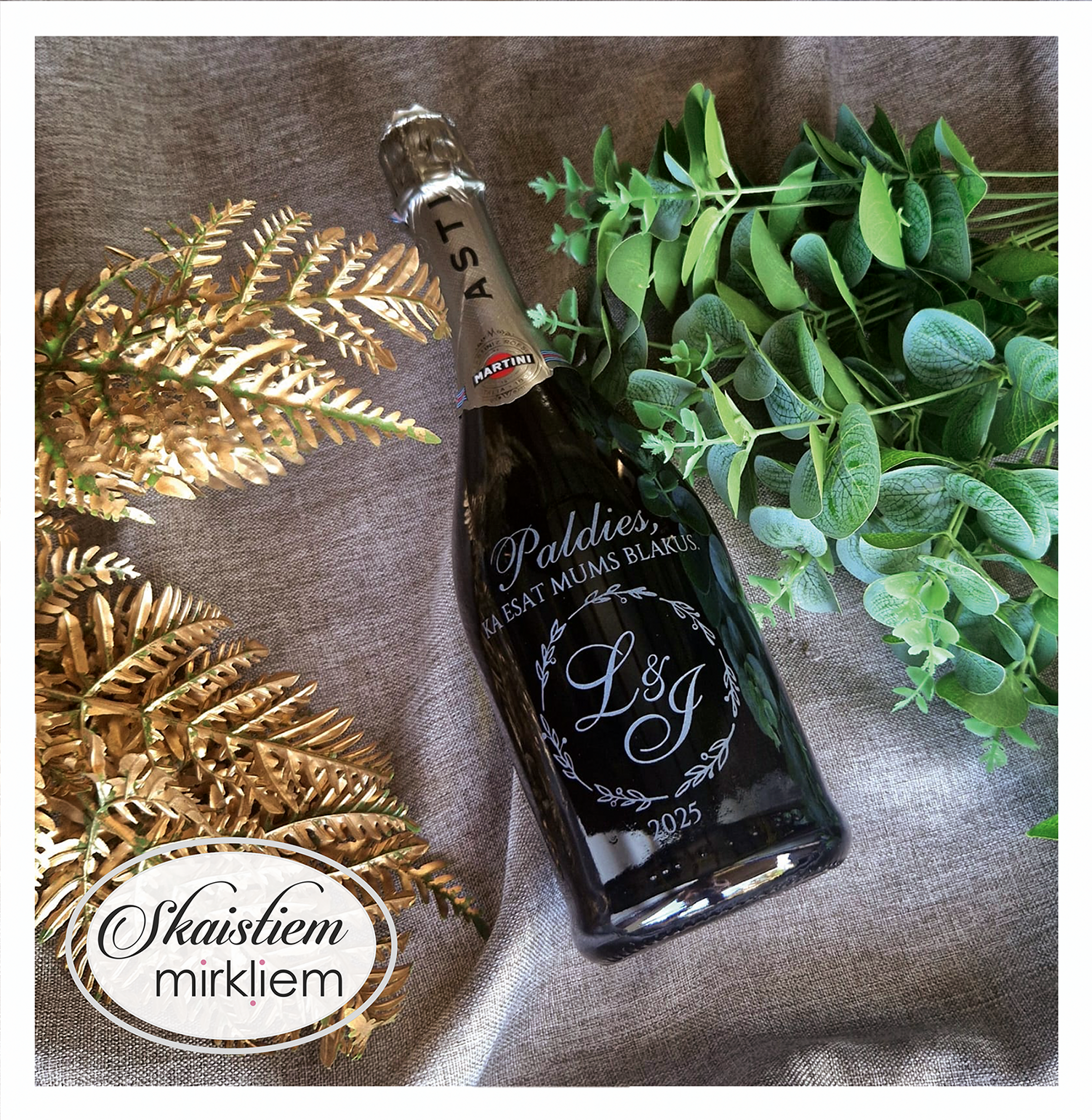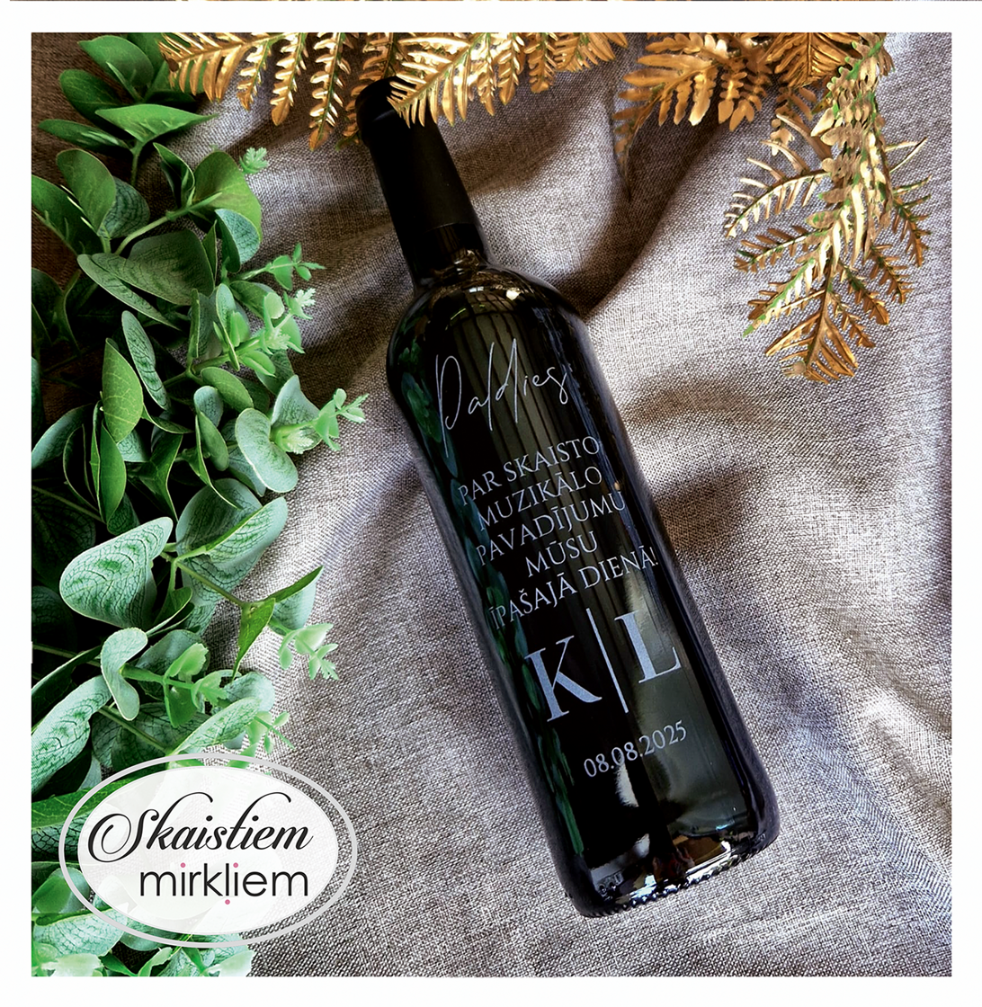 Saskaņotība: Ja pasūtāt pie mums arī citas kāzu lietas, mēs saskaņosim pudeles gravējuma fontu un stilistiku ar pārējo pasūtījumu.