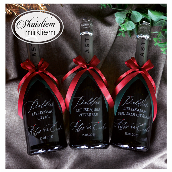 Saskaņots noformējums: Piedāvājam katru pudeli rotāt ar krāšņām satīna lentēm un dekoratīviem akcentiem Jūsu izvēlētajos toņos.
