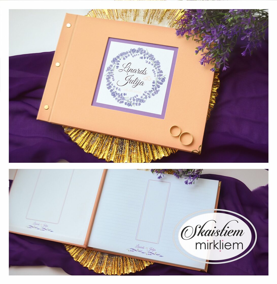 Persika toņa viesu grāmata ar lavandas ziedu vainagu un personalizētu druku -
