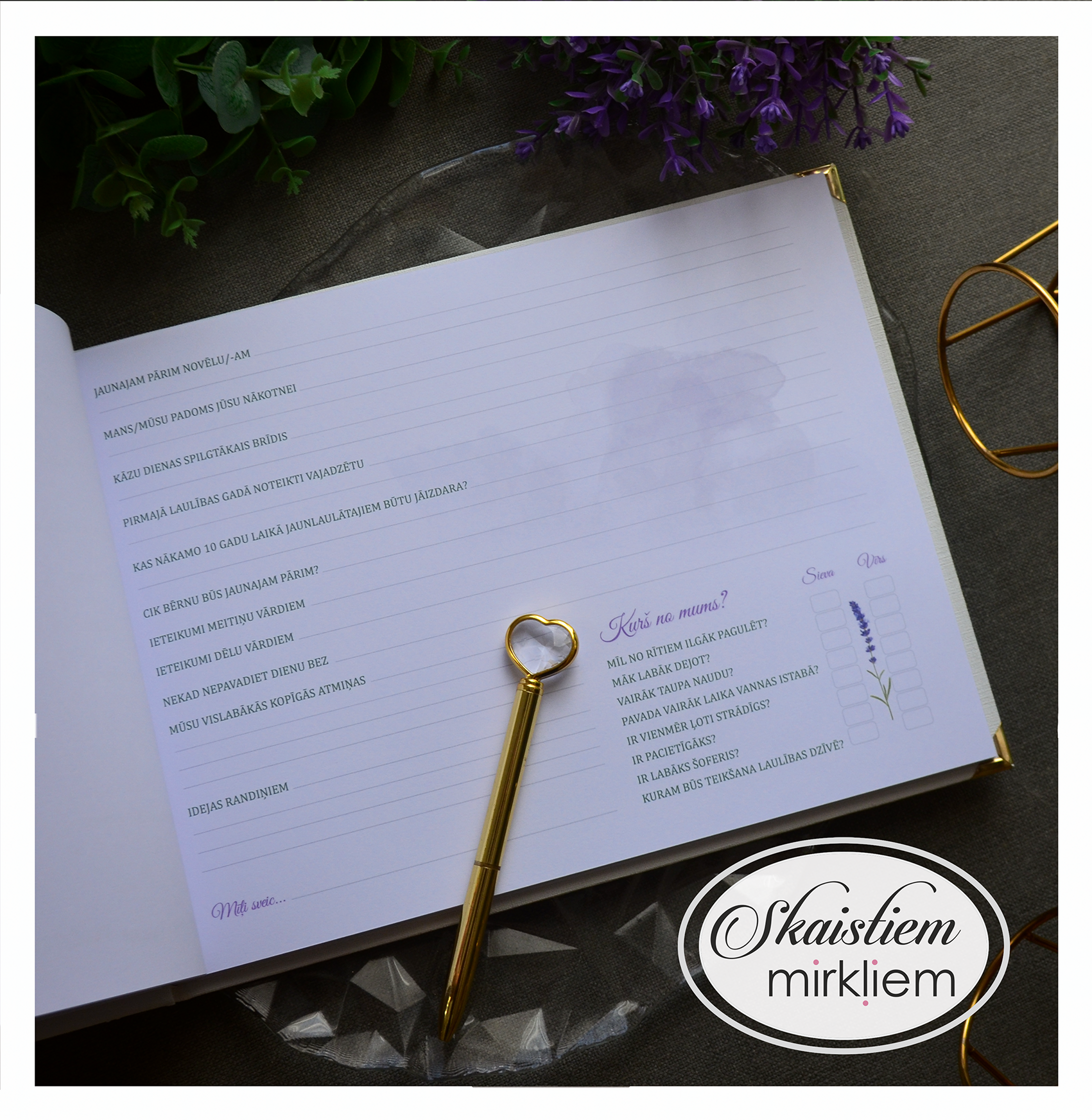 Interaktīvs saturs: Viesu lapas ir papildinātas ar pārdomātiem un aizraujošiem jautājumiem par jauno pāri + īpaši paredzētu vietu momentfoto (var arī bez). Tas palīdz viesiem vieglāk rast īstos vārdus un rada jautru noskaņu, izvairoties no apmulsuma tukšas lapas priekšā.