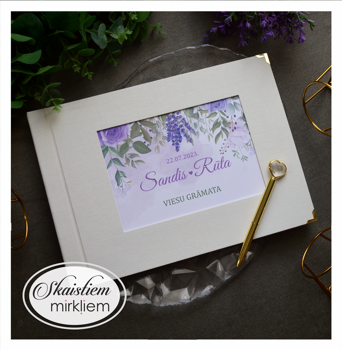 Viesu grāmata gaišā tonī ar lavandas ziedu motīvu un elegantu personalizētu tekstu -