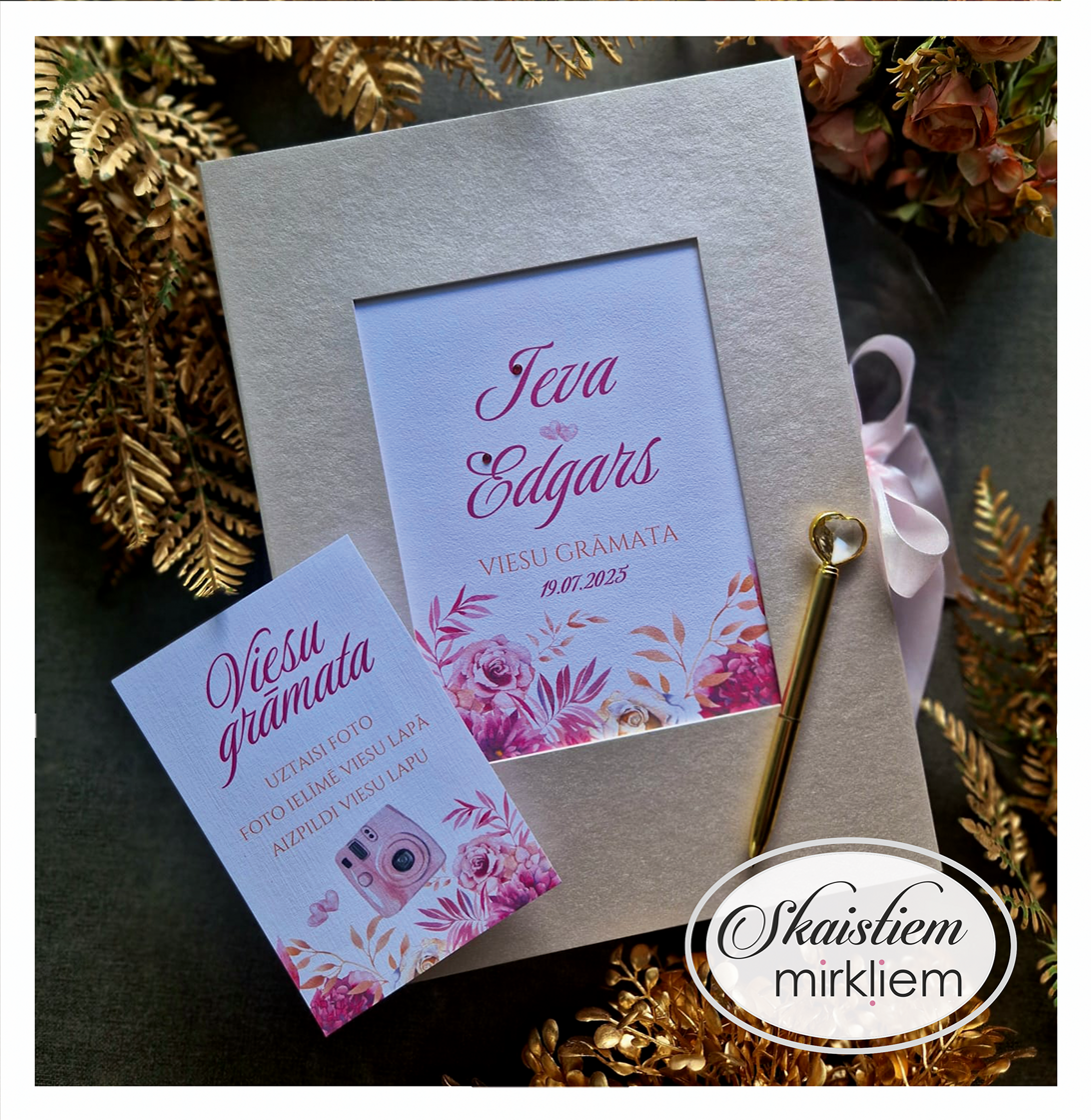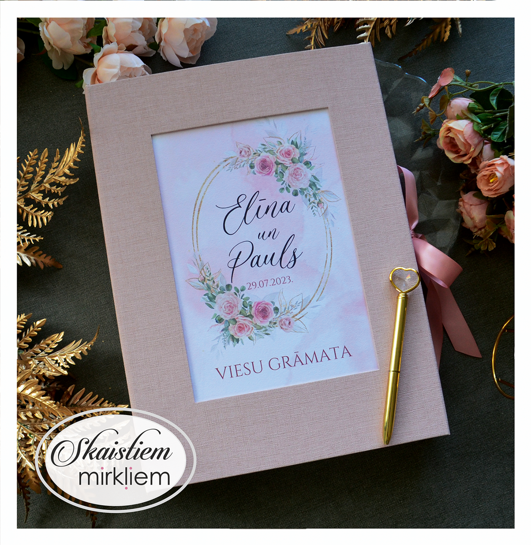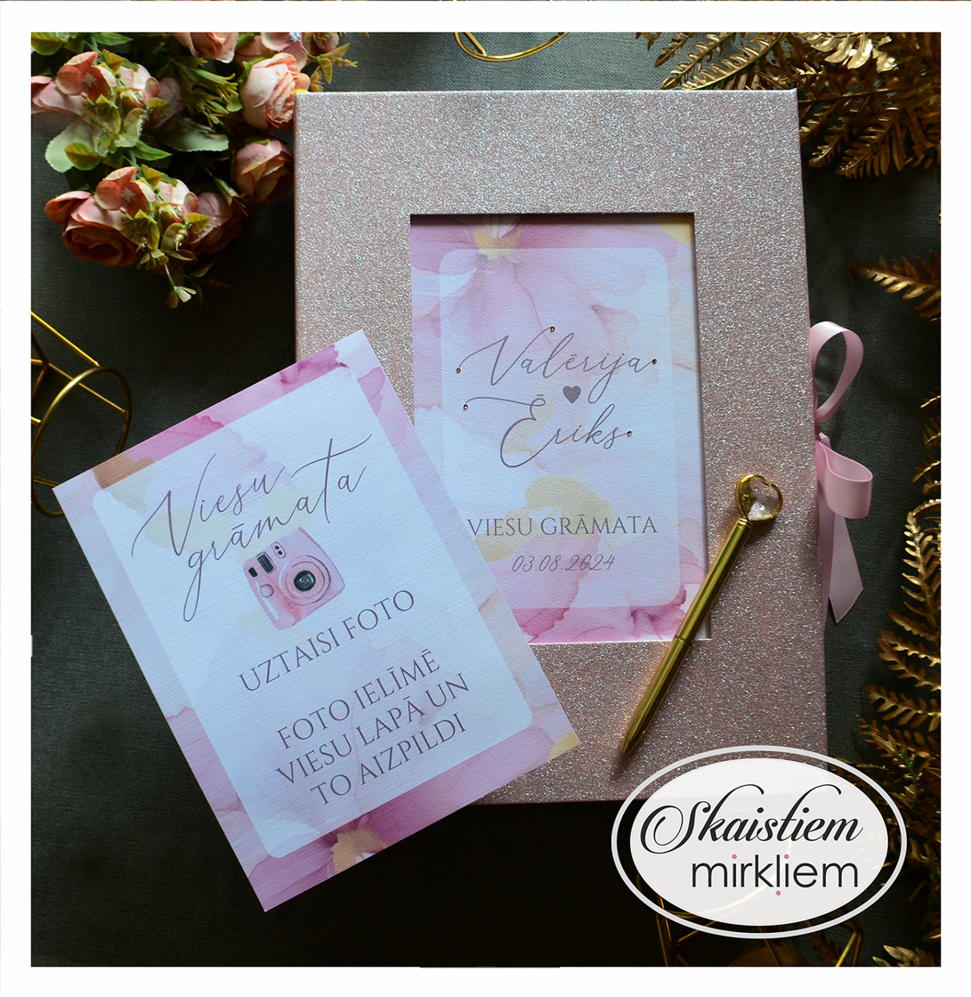 Mūsu rozā toņu viesu grāmatas ir radītas, lai piešķirtu Jūsu kāzu dienai īpašu maigumu un romantisku noskaņu. Šajā kolekcijā dominē rozā dekoratīvie materiāli, kas kalpo kā elegants fons rūpīgi izstrādātiem ziedu printiem un mirdzošām zelta detaļām.