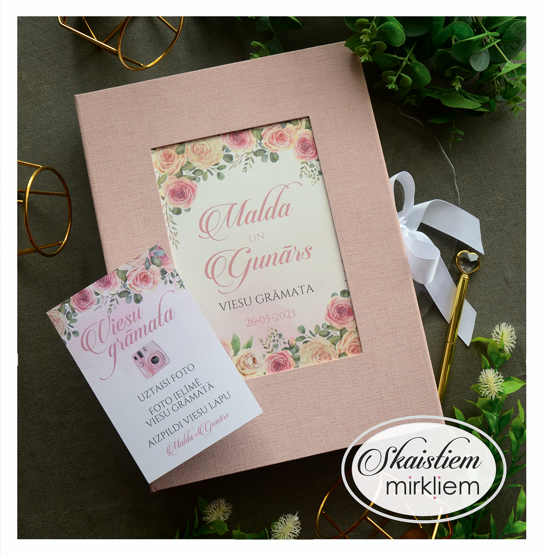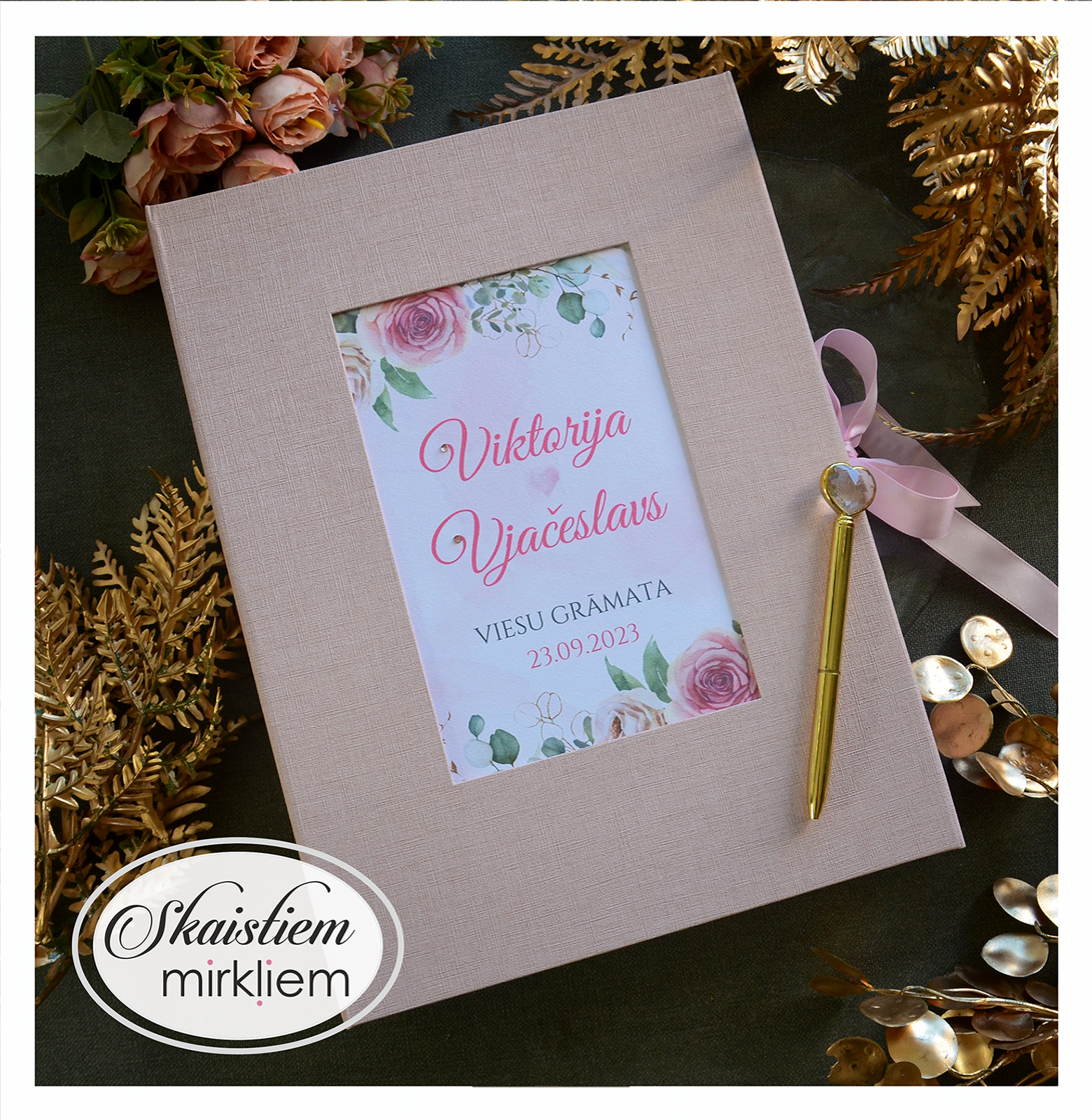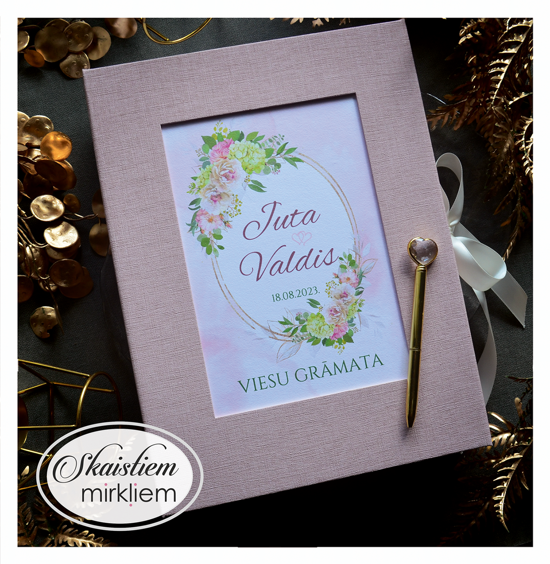 Mūsu rozā toņu viesu grāmatas ir radītas, lai piešķirtu Jūsu kāzu dienai īpašu maigumu un romantisku noskaņu. Šajā kolekcijā dominē rozā dekoratīvie materiāli, kas kalpo kā elegants fons rūpīgi izstrādātiem ziedu printiem un mirdzošām zelta detaļām.