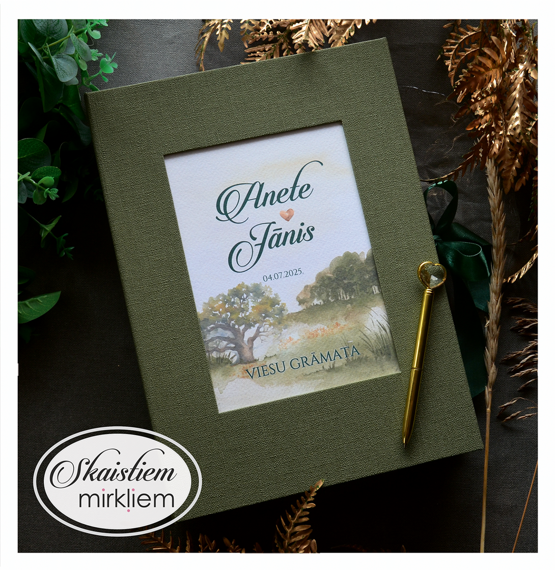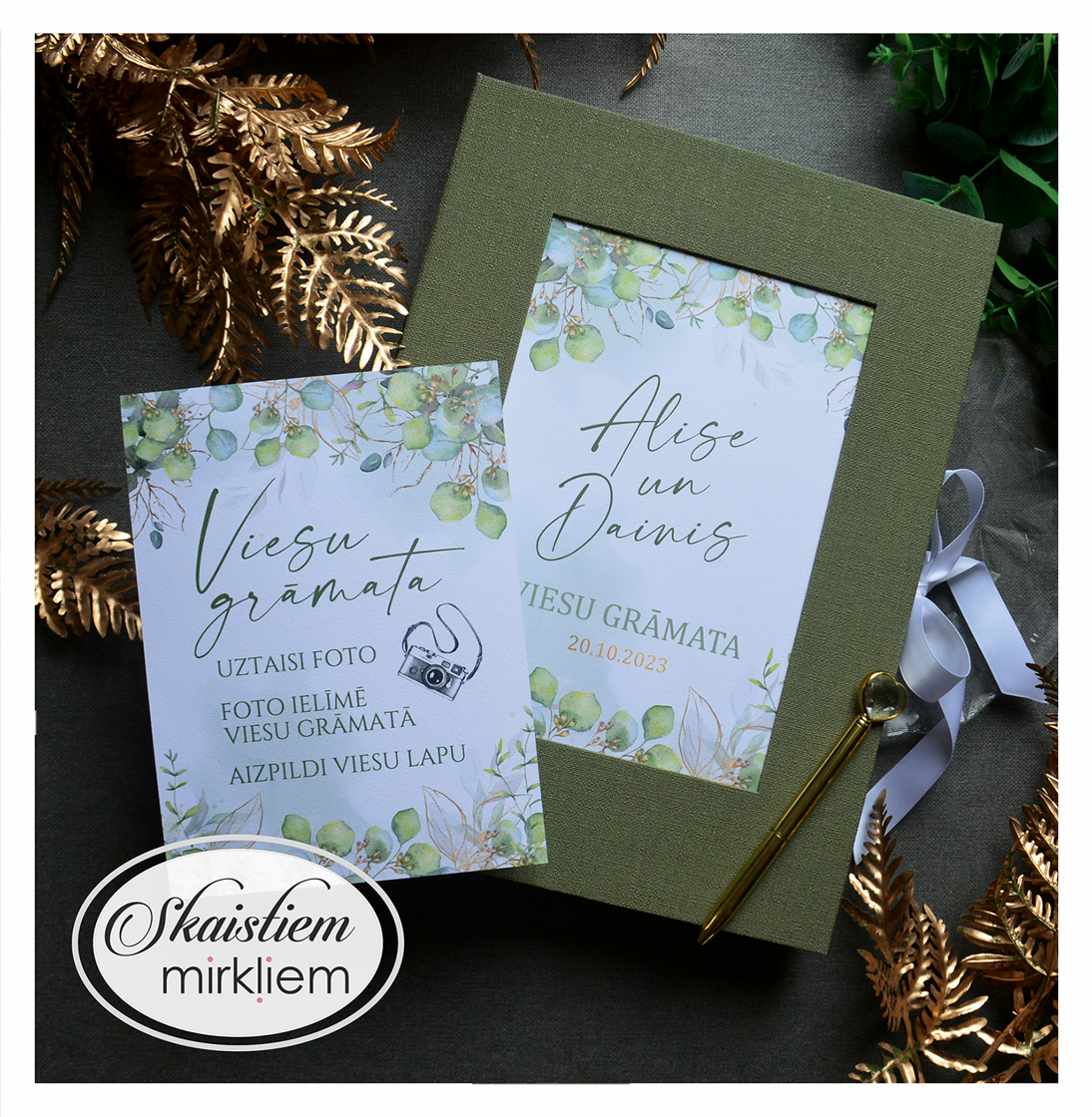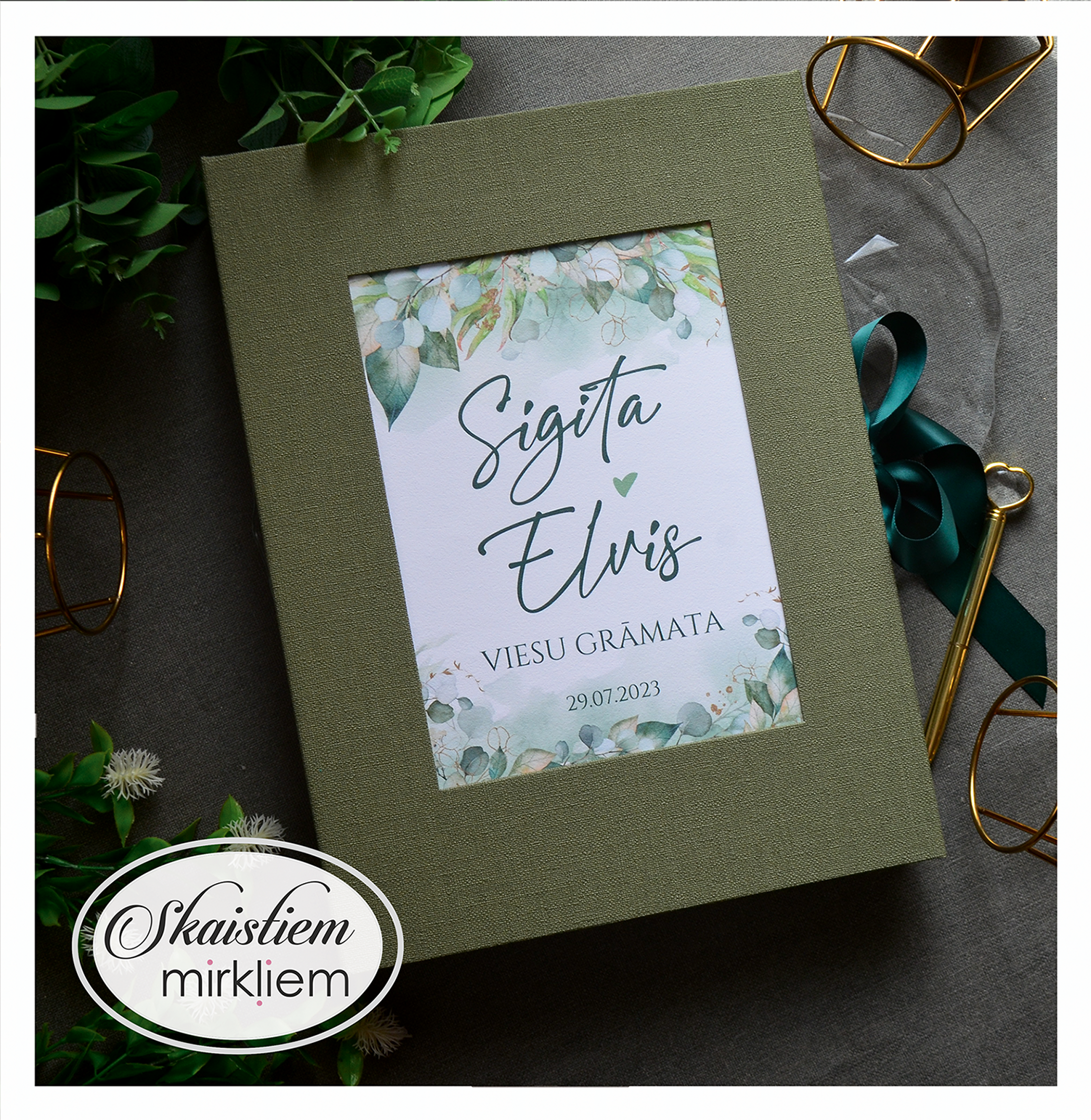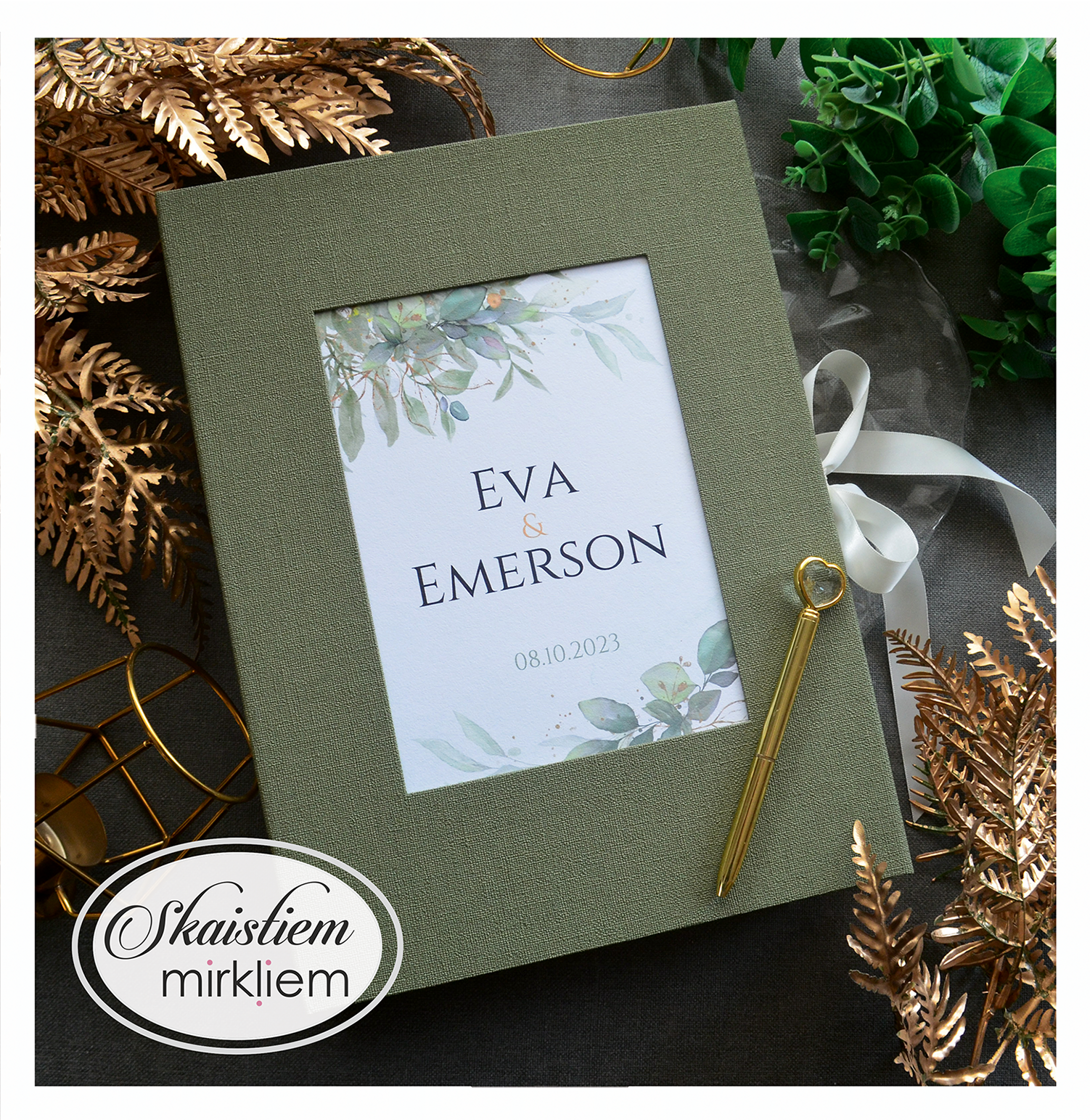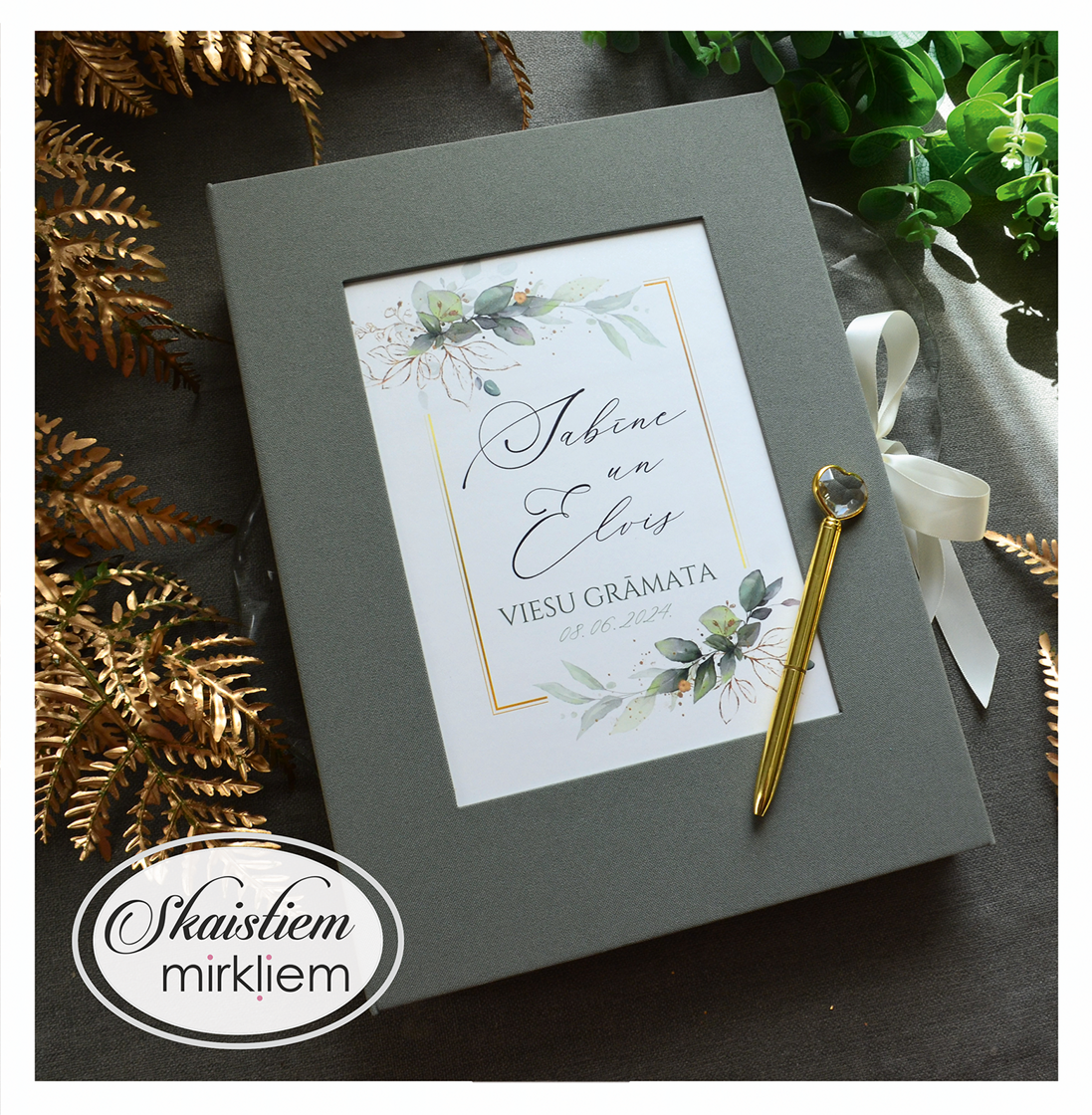 Mūsu zaļo toņu viesu grāmatas ir veltījums dabas mieram un meža maģijai. Šajā kolekcijā piedāvājam plašu krāsu paleti, kas kalpo kā ideāls fons unikāliem dizainiem. Īpašu uzmanību esam veltījuši centra printu daudzveidībai. Šeit atradīsiet gan smalkus eikalipta un zaļumu vainagus, gan neierastus motīvus ar meža ainavām, briežiem un pat eksotiskiem putniem. Katrs vāka noformējums ir roku darbs, ko iespējams papildināt ar mirdzošu zelta folijas druku vai personificētu kaligrāfiju.