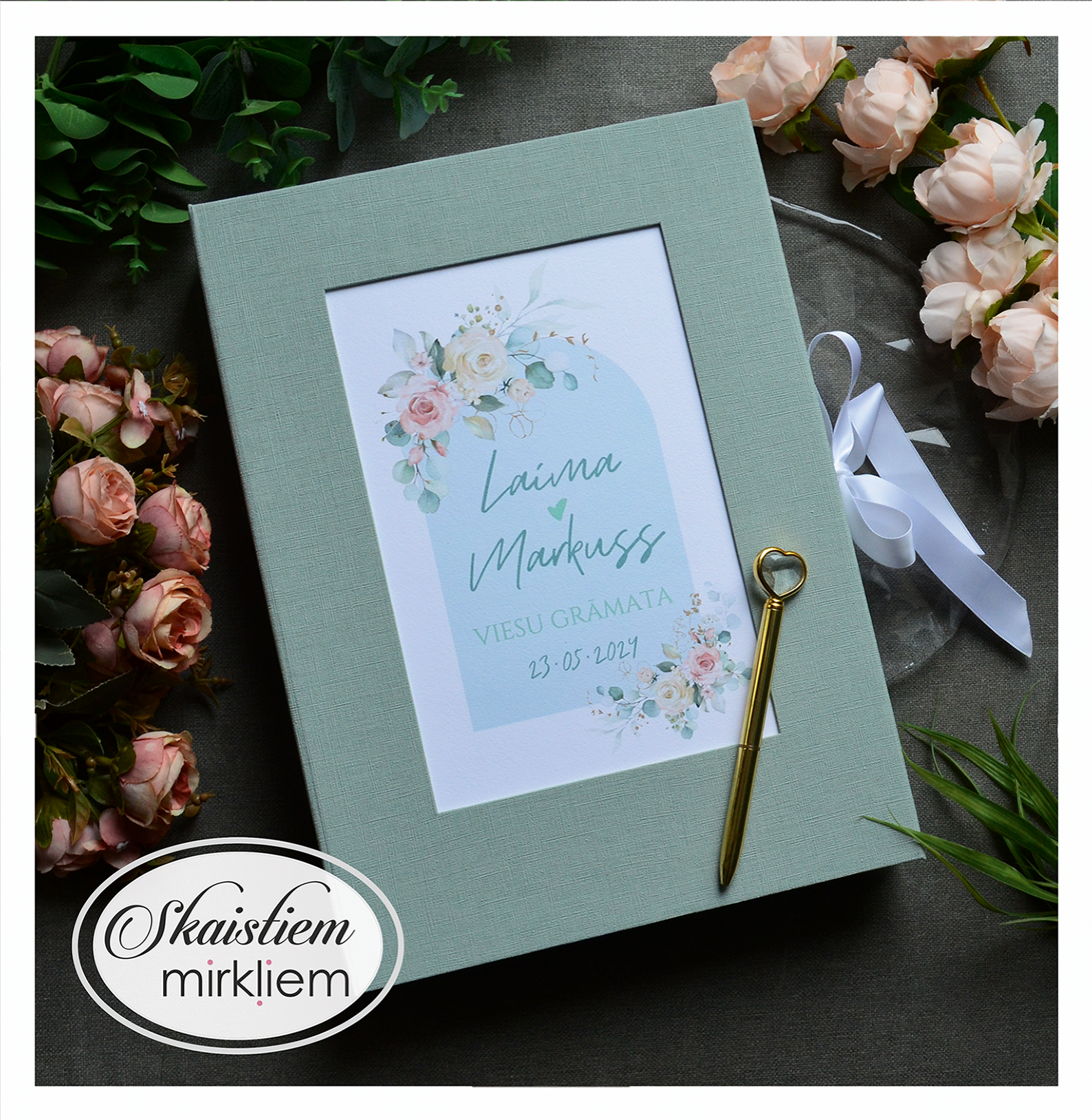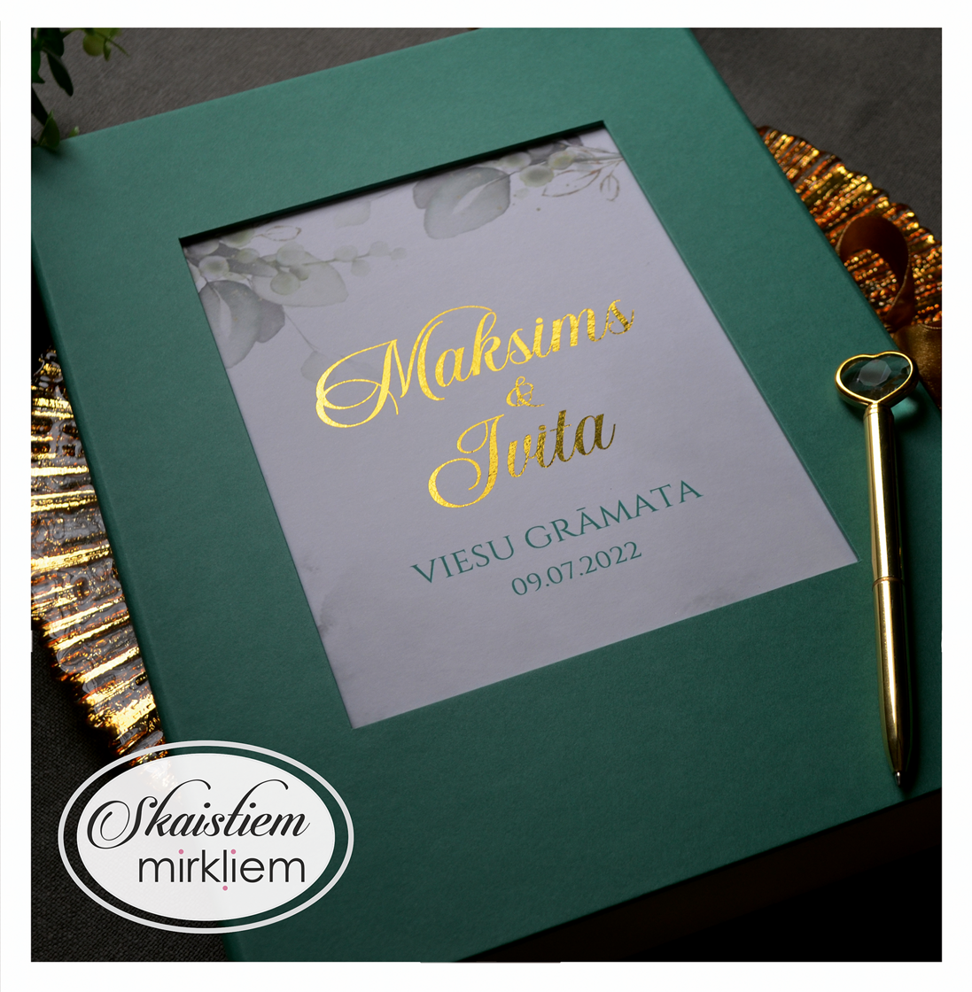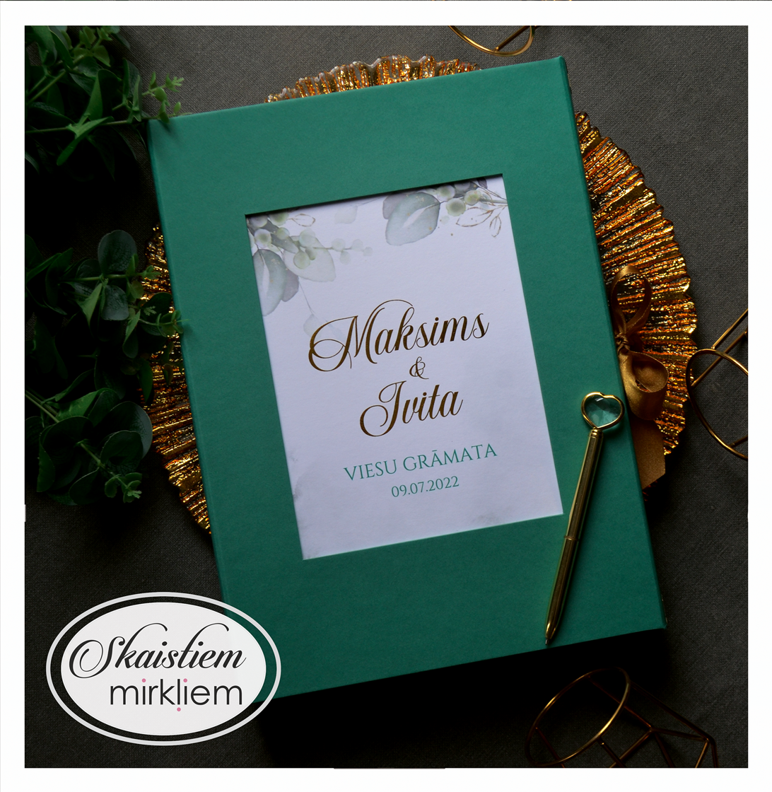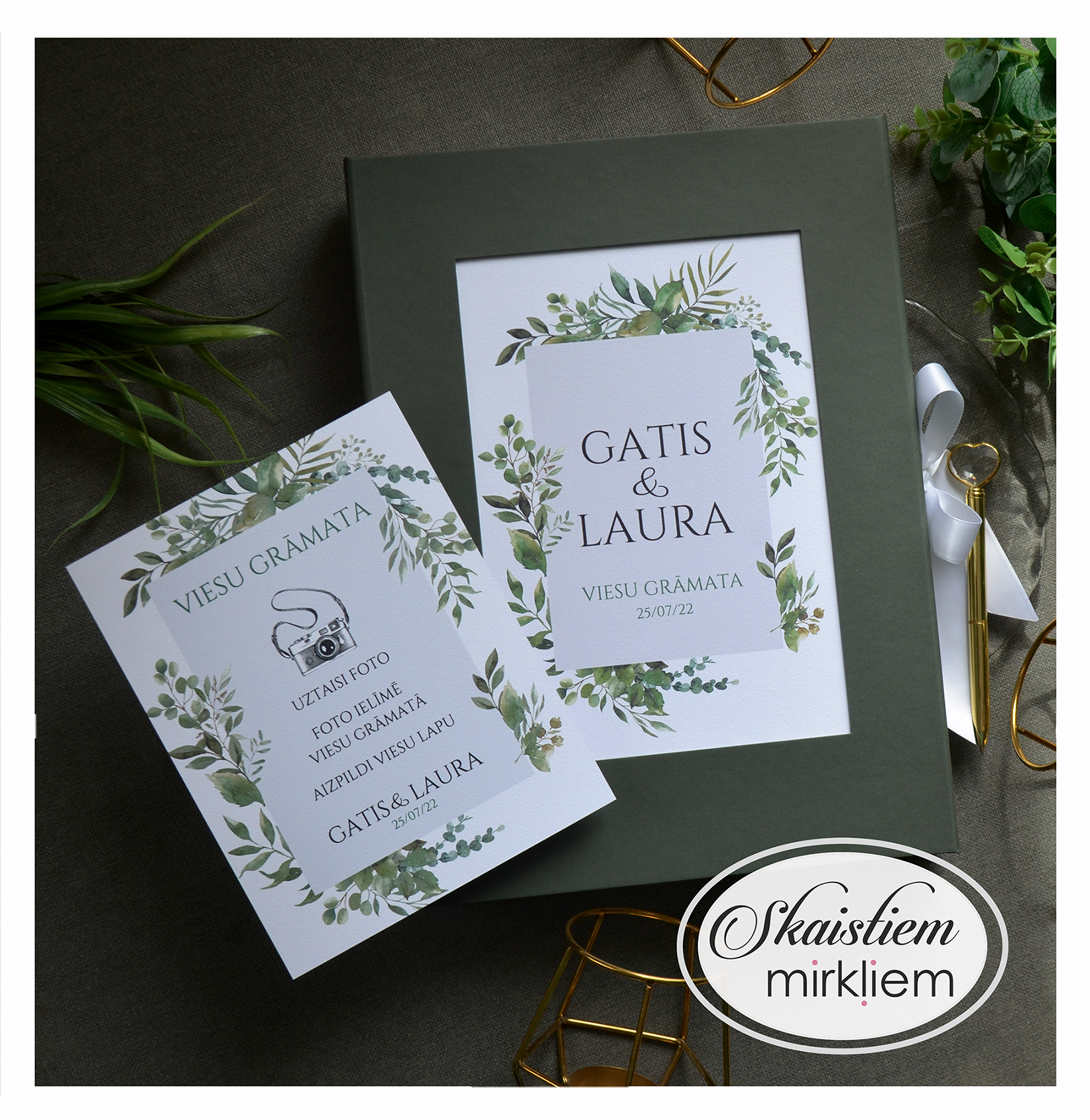 Mūsu zaļo toņu viesu grāmatas ir veltījums dabas mieram un meža maģijai. Šajā kolekcijā piedāvājam plašu krāsu paleti, kas kalpo kā ideāls fons unikāliem dizainiem. Īpašu uzmanību esam veltījuši centra printu daudzveidībai. Šeit atradīsiet gan smalkus eikalipta un zaļumu vainagus, gan neierastus motīvus ar meža ainavām, briežiem un pat eksotiskiem putniem. Katrs vāka noformējums ir roku darbs, ko iespējams papildināt ar mirdzošu zelta folijas druku vai personificētu kaligrāfiju.