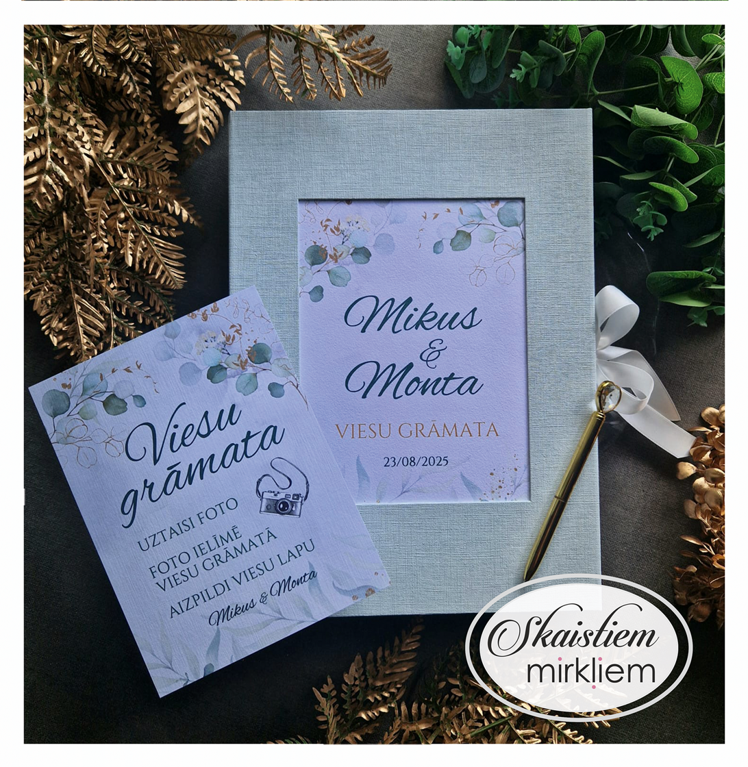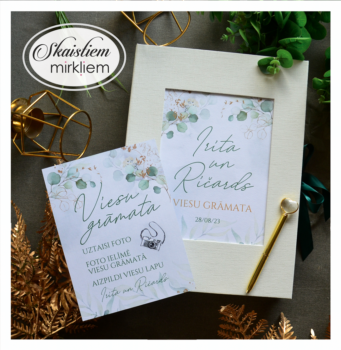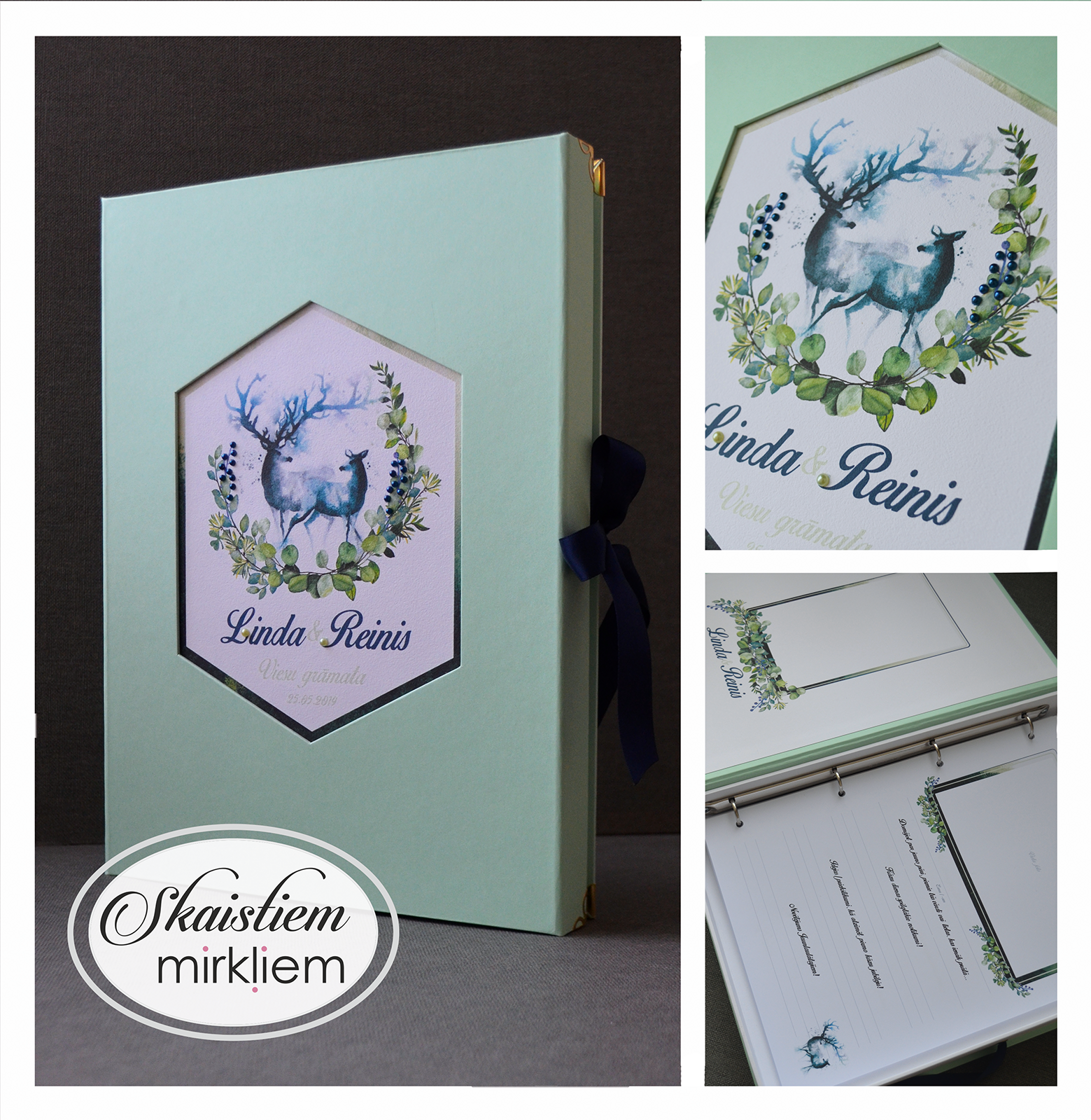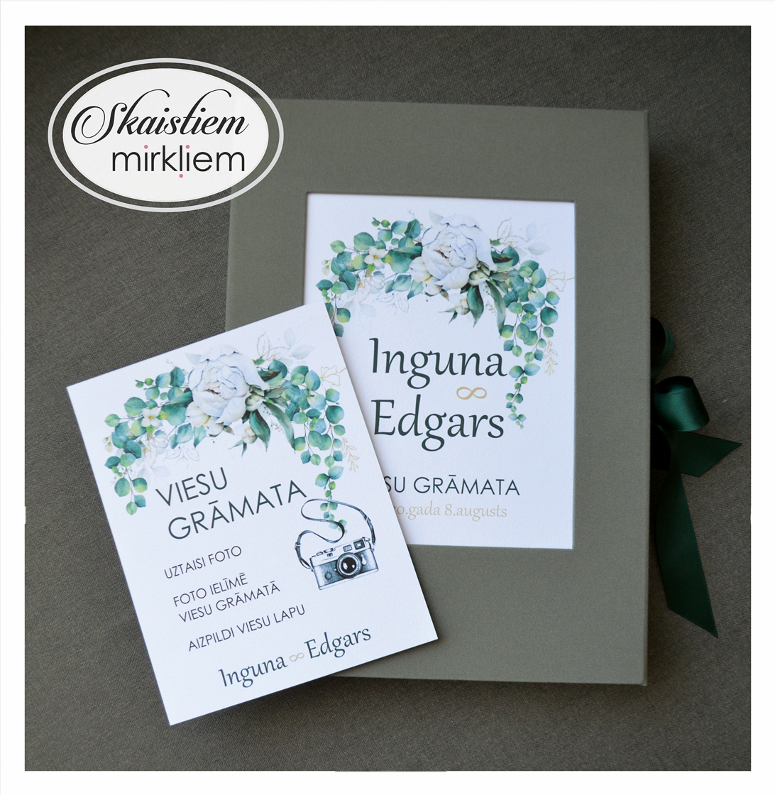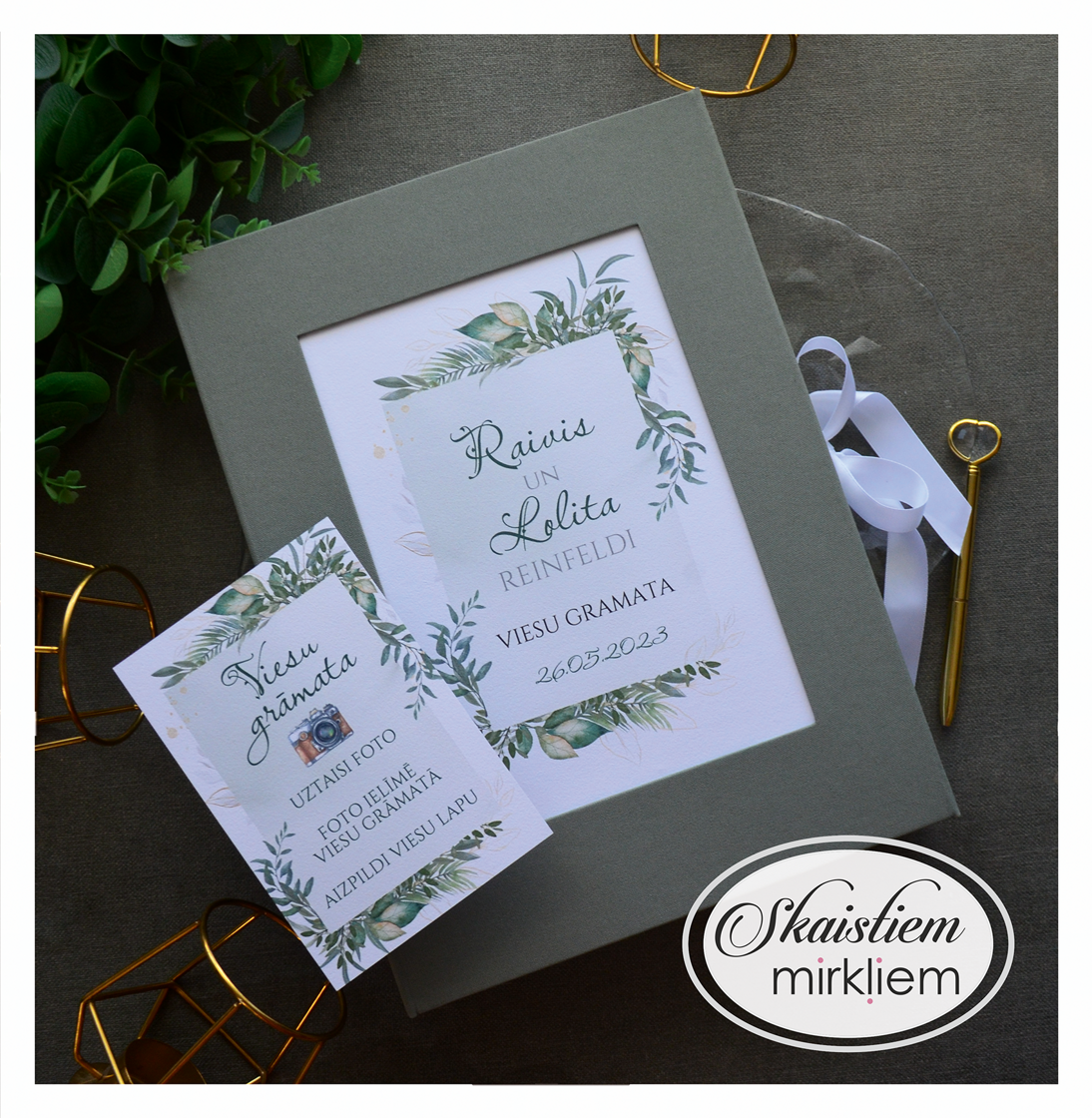 Mūsu zaļo toņu viesu grāmatas ir veltījums dabas mieram un meža maģijai. Šajā kolekcijā piedāvājam plašu krāsu paleti, kas kalpo kā ideāls fons unikāliem dizainiem. Īpašu uzmanību esam veltījuši centra printu daudzveidībai. Šeit atradīsiet gan smalkus eikalipta un zaļumu vainagus, gan neierastus motīvus ar meža ainavām, briežiem un pat eksotiskiem putniem. Katrs vāka noformējums ir roku darbs, ko iespējams papildināt ar mirdzošu zelta folijas druku vai personificētu kaligrāfiju.